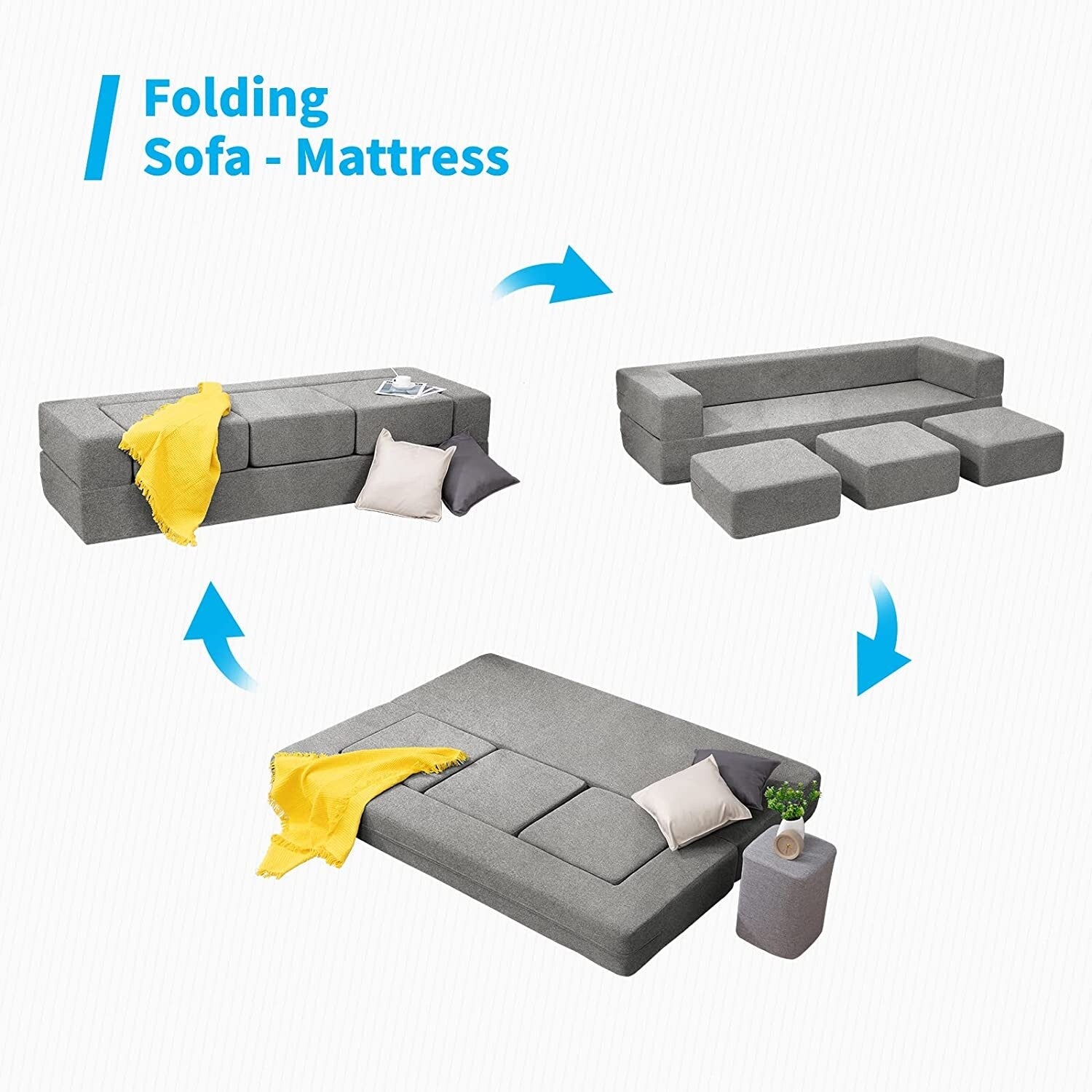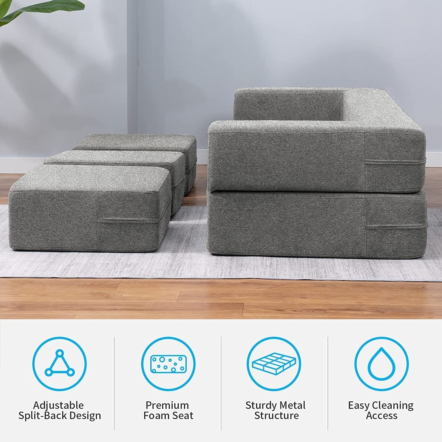 Canapé-lit futon convertible en velours Mixoy Queen avec 3 poufs, mousse à mémoire de forme, matelas pliable