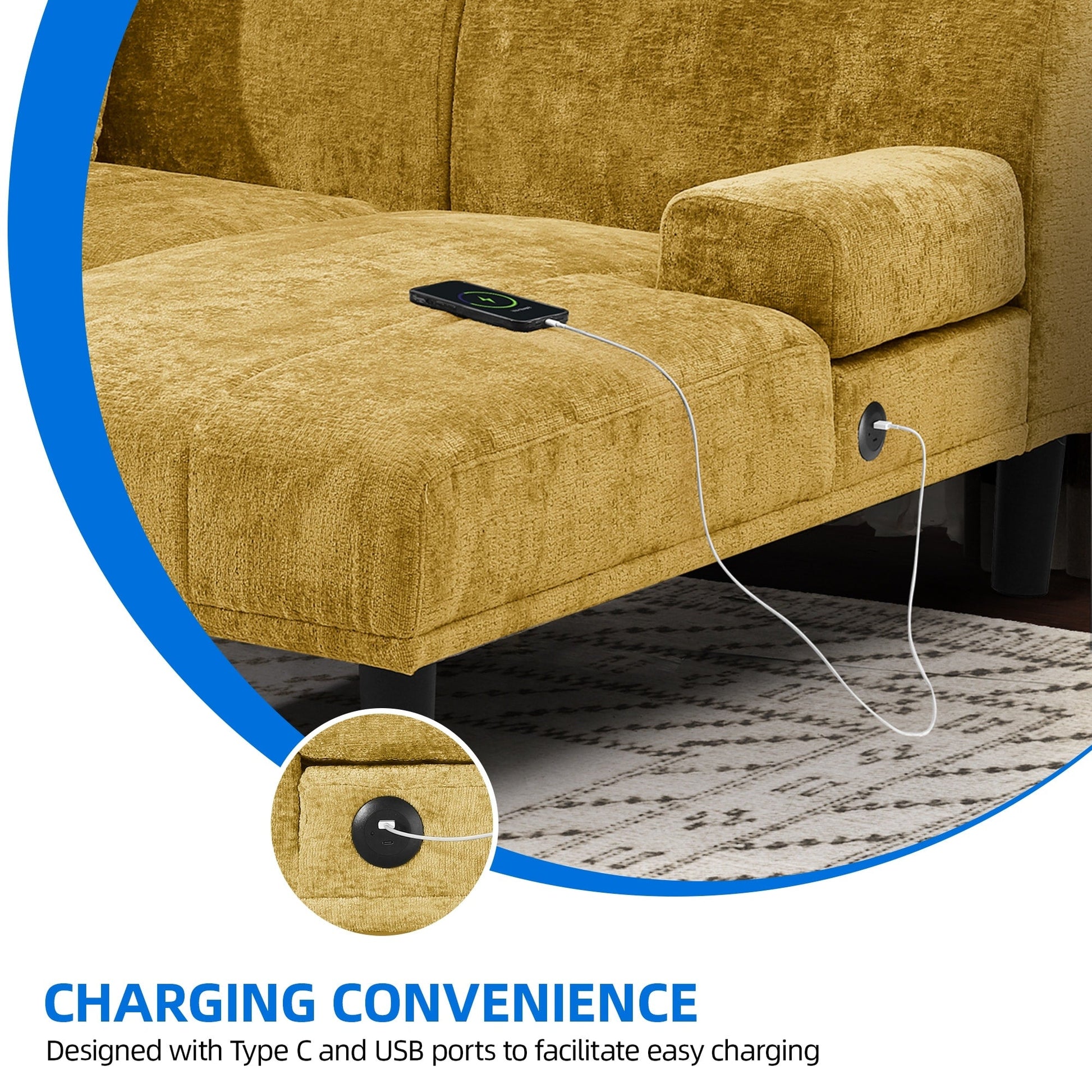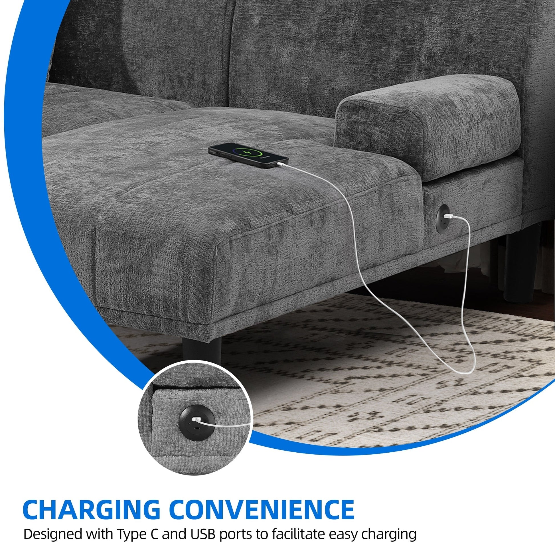 - Ports USB et Type-C : L'accoudoir du canapé sectionnel est équipé de ports USB et Type-C, pratiques pour recharger votre téléphone et votre tablette à tout moment. Plus besoin de recharger.