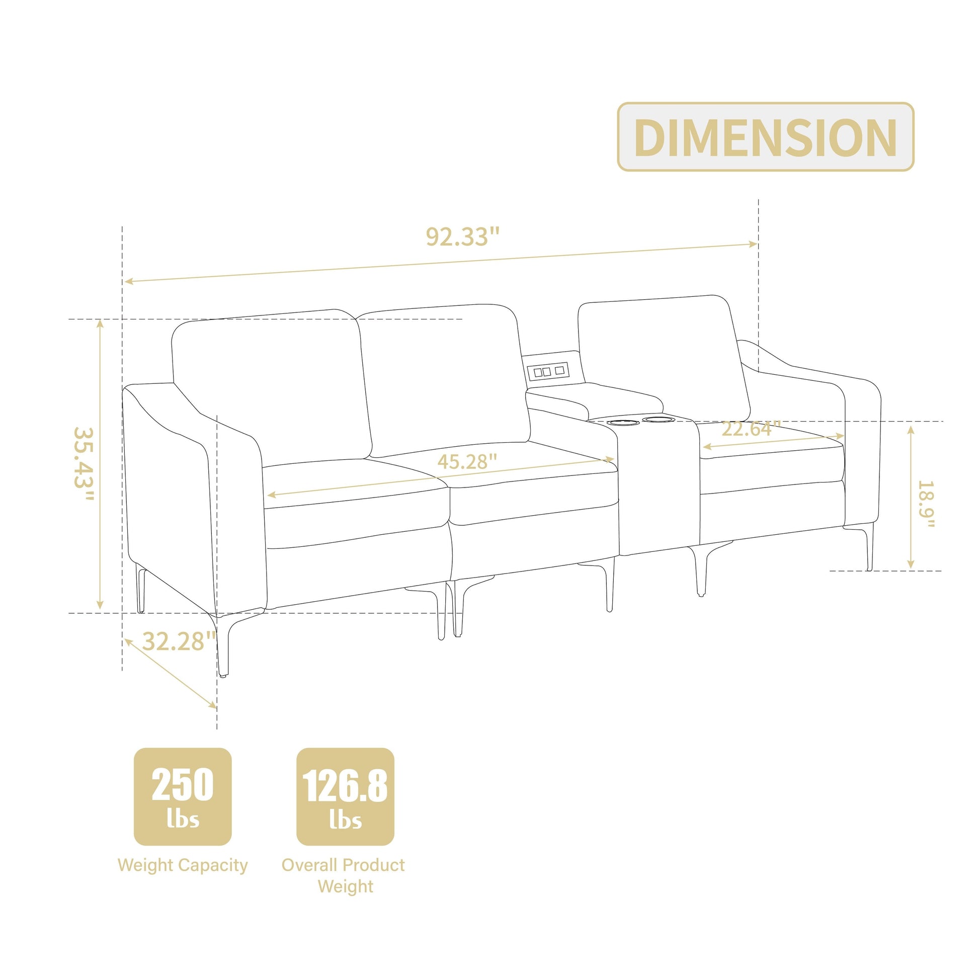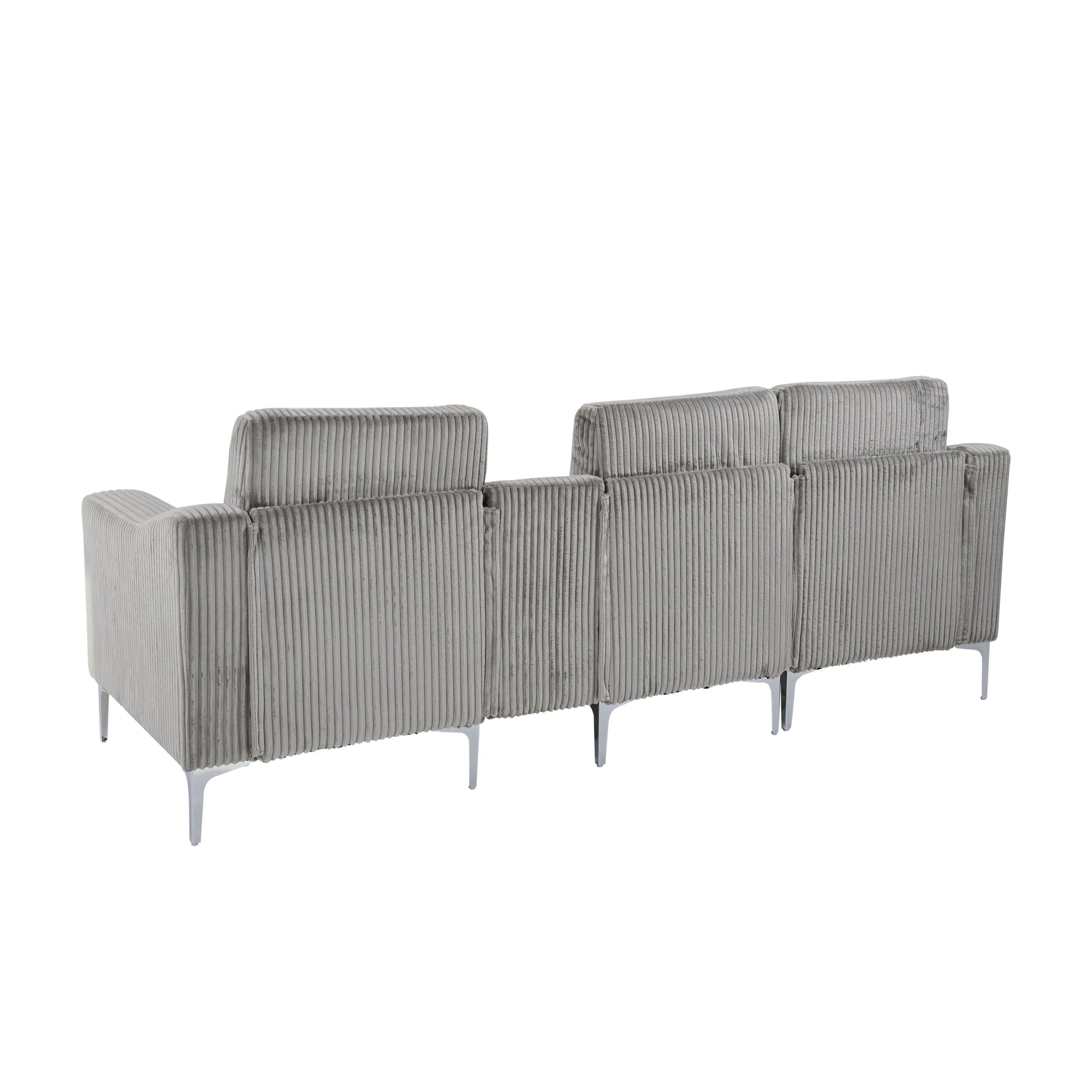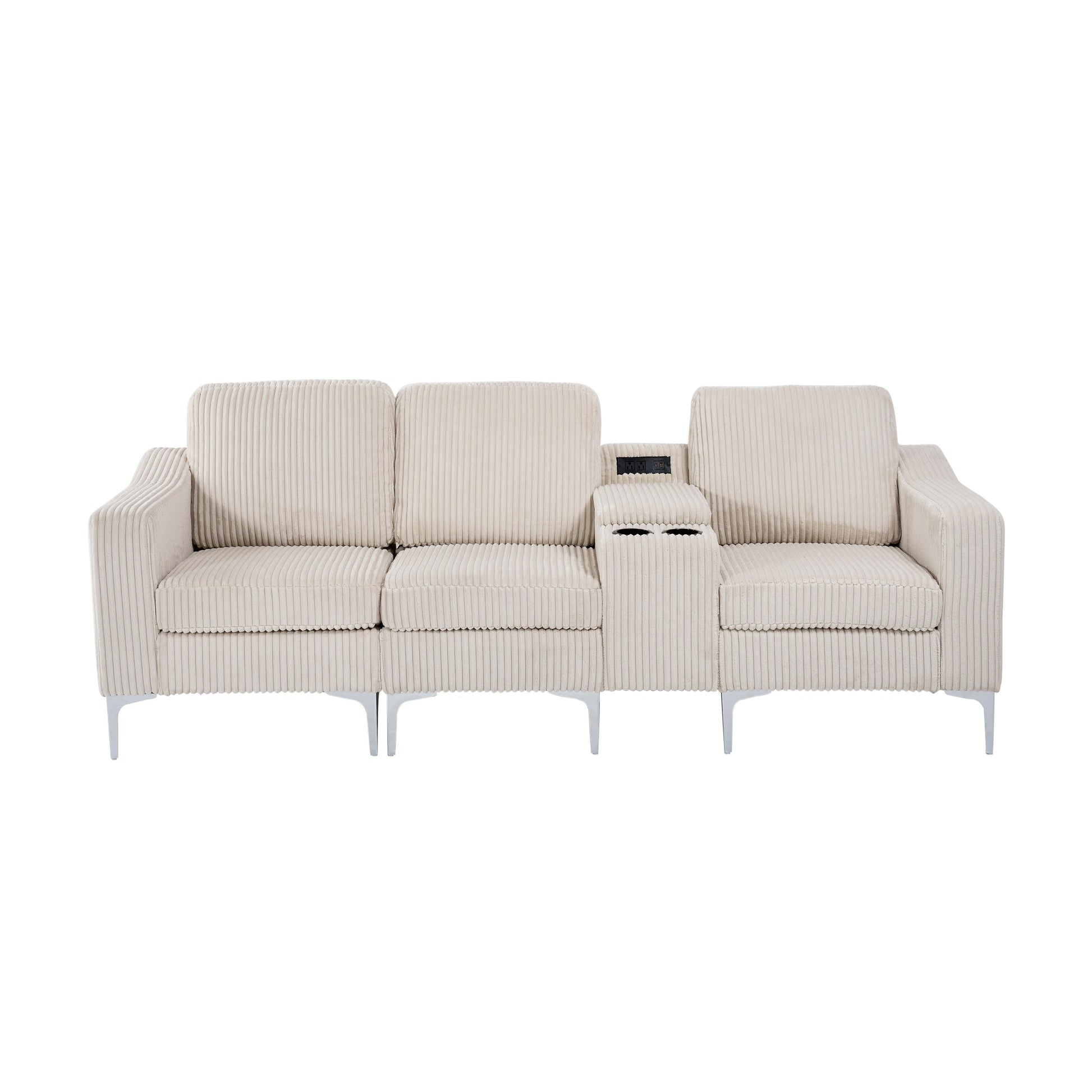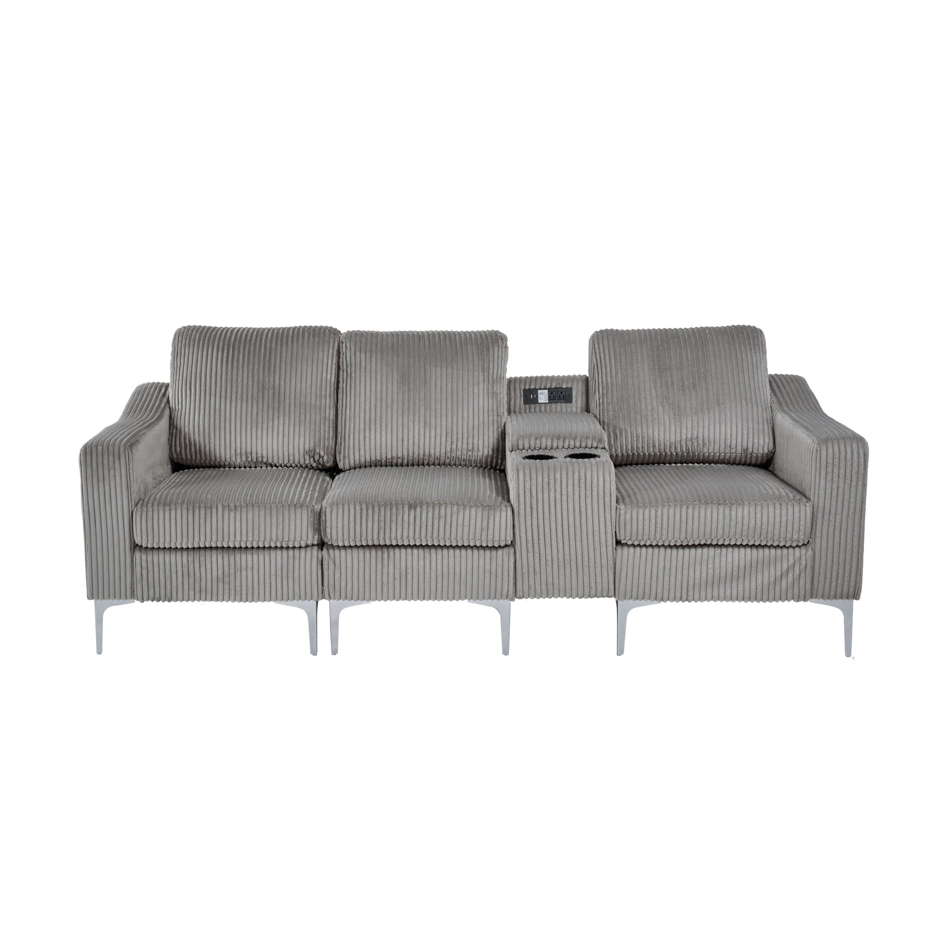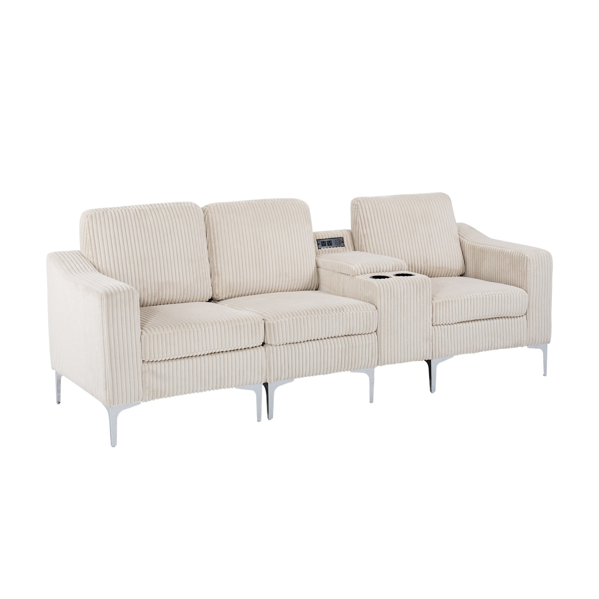 Canapé modulable moderne 3 places en velours côtelé avec ports USB et porte-gobelets pour salon et appartement