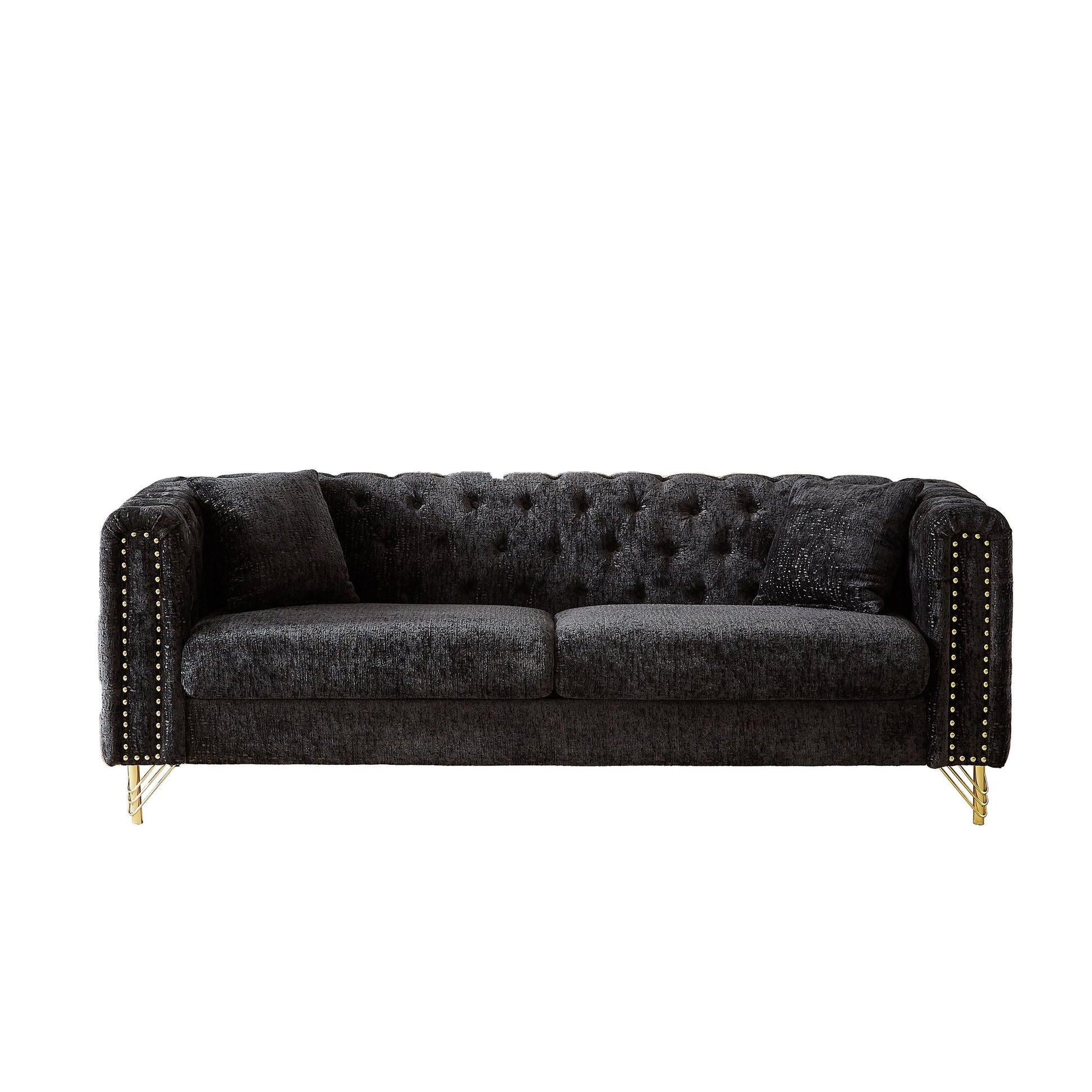 Canapé 3 places moderne capitonné en chenille avec 82 boutons, décoration clous cuivrés et pieds en métal