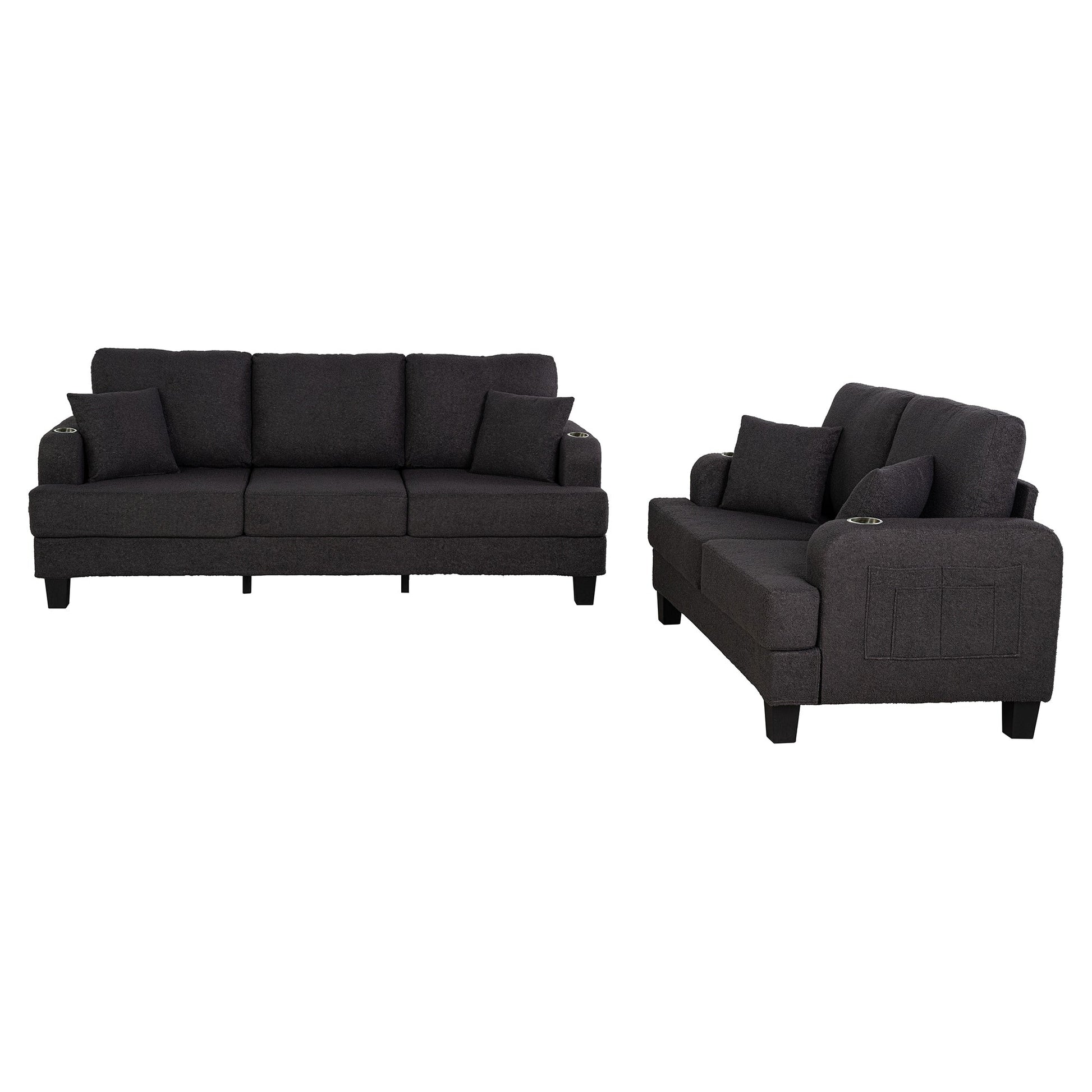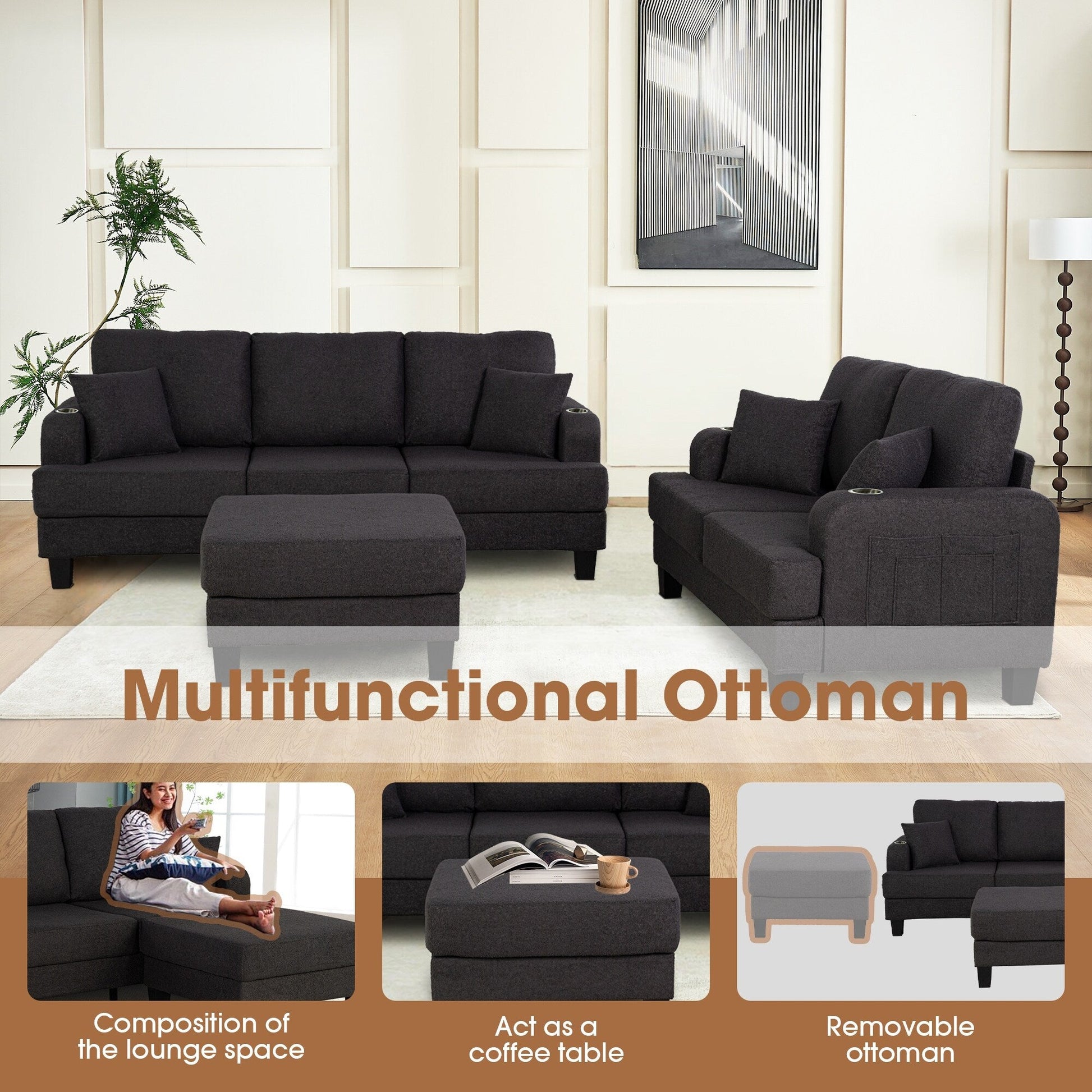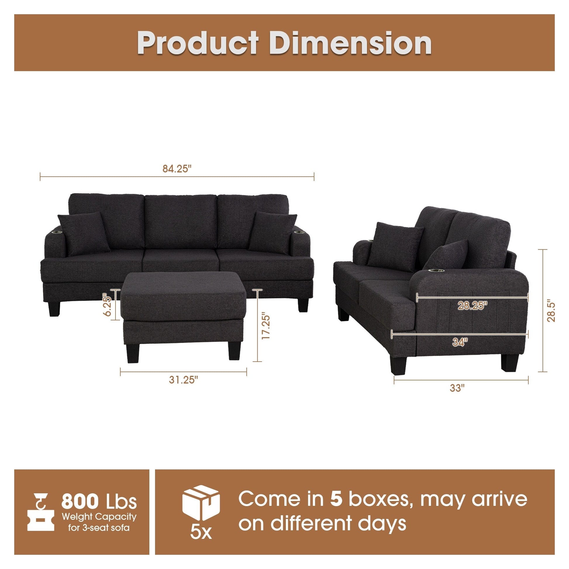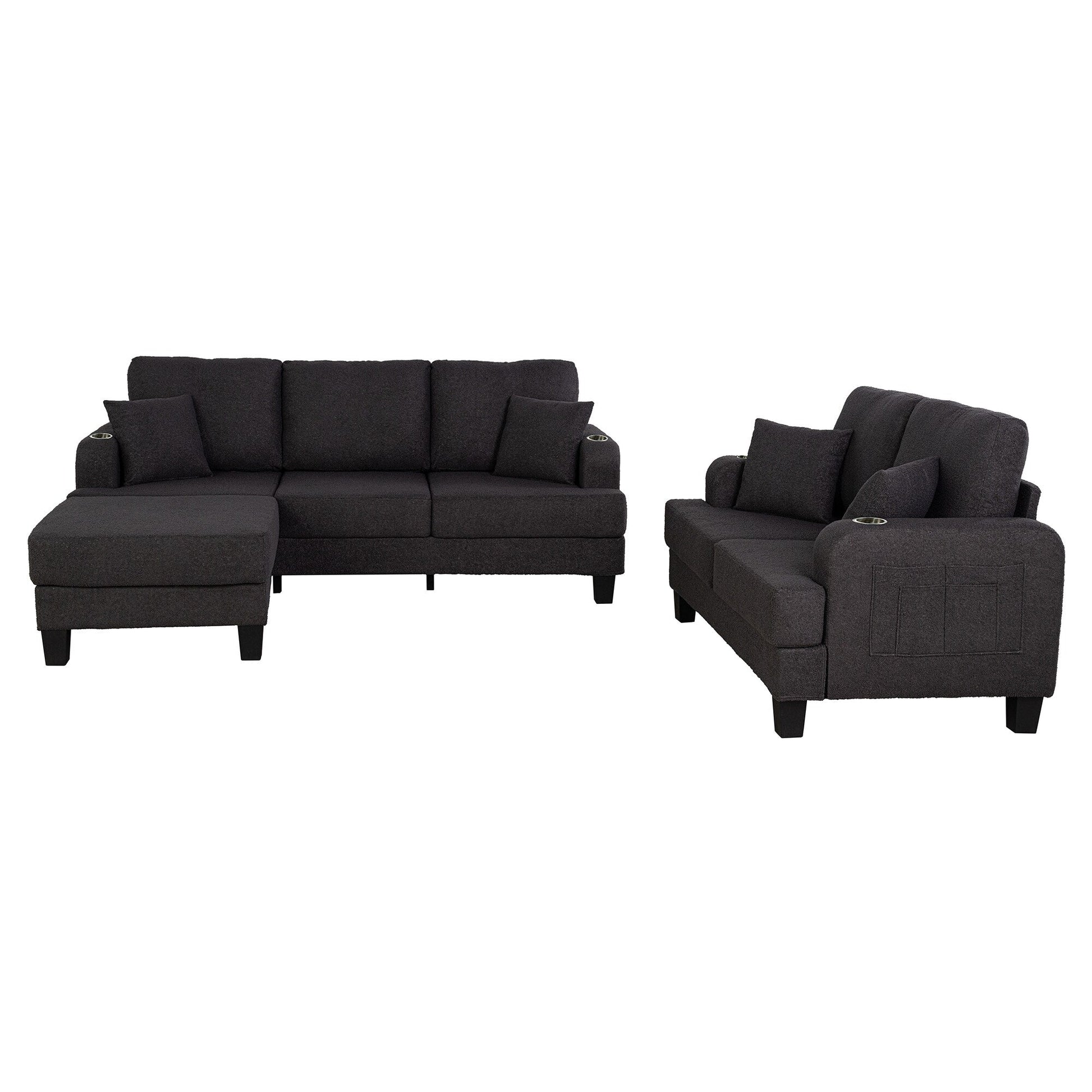 Ensemble de salon moderne 3 pièces en tissu noir avec causeuse et pouf