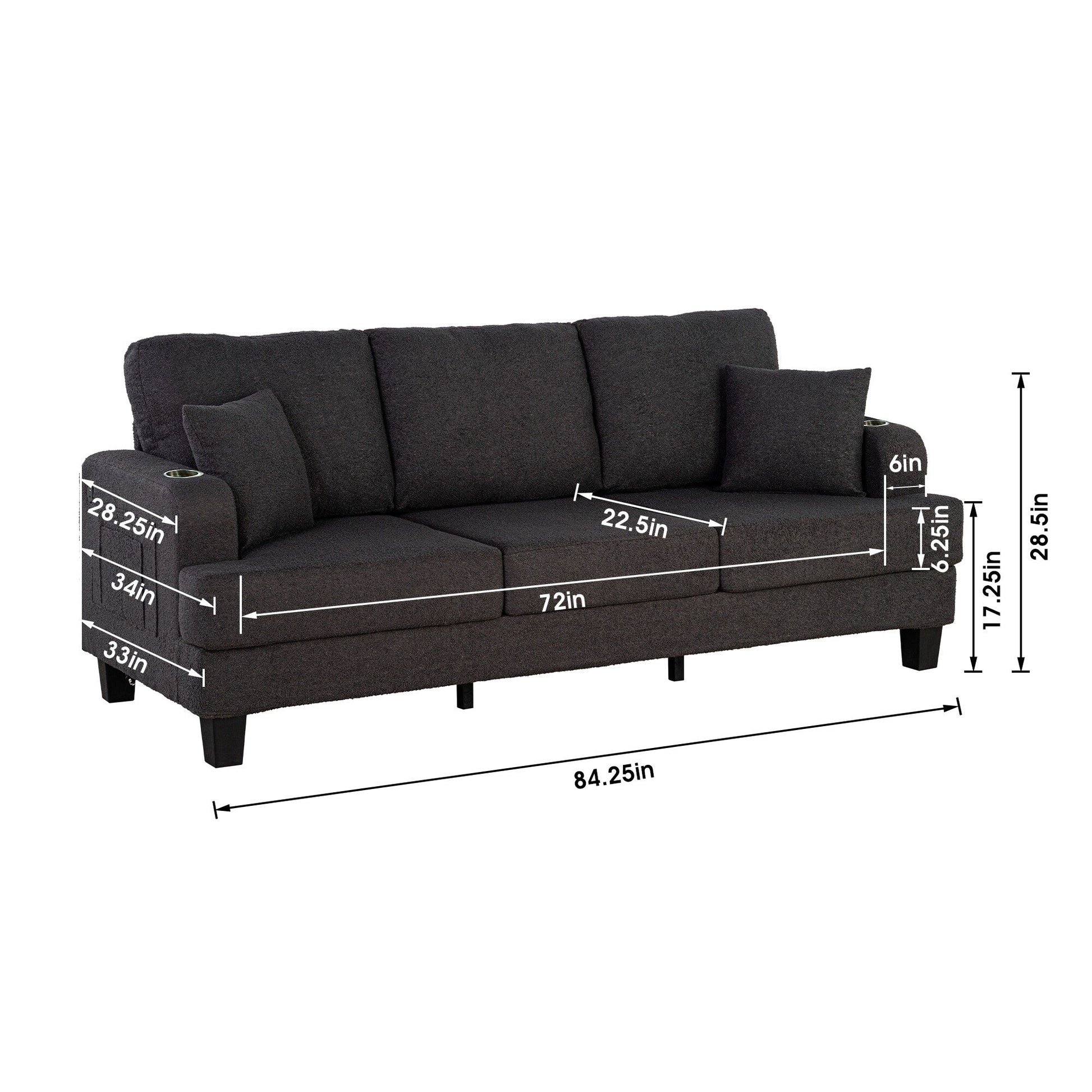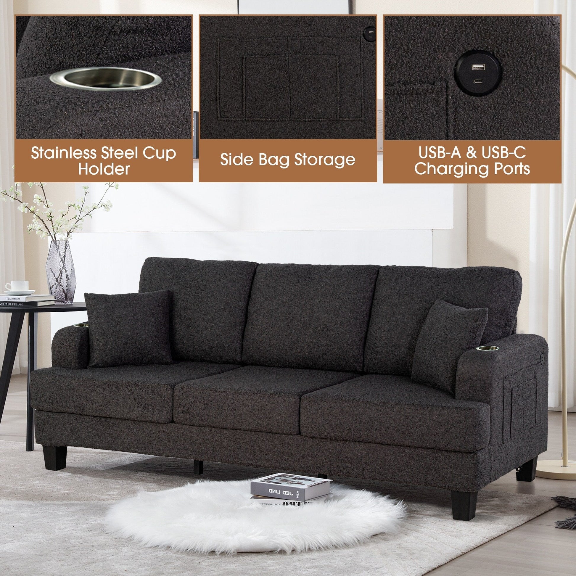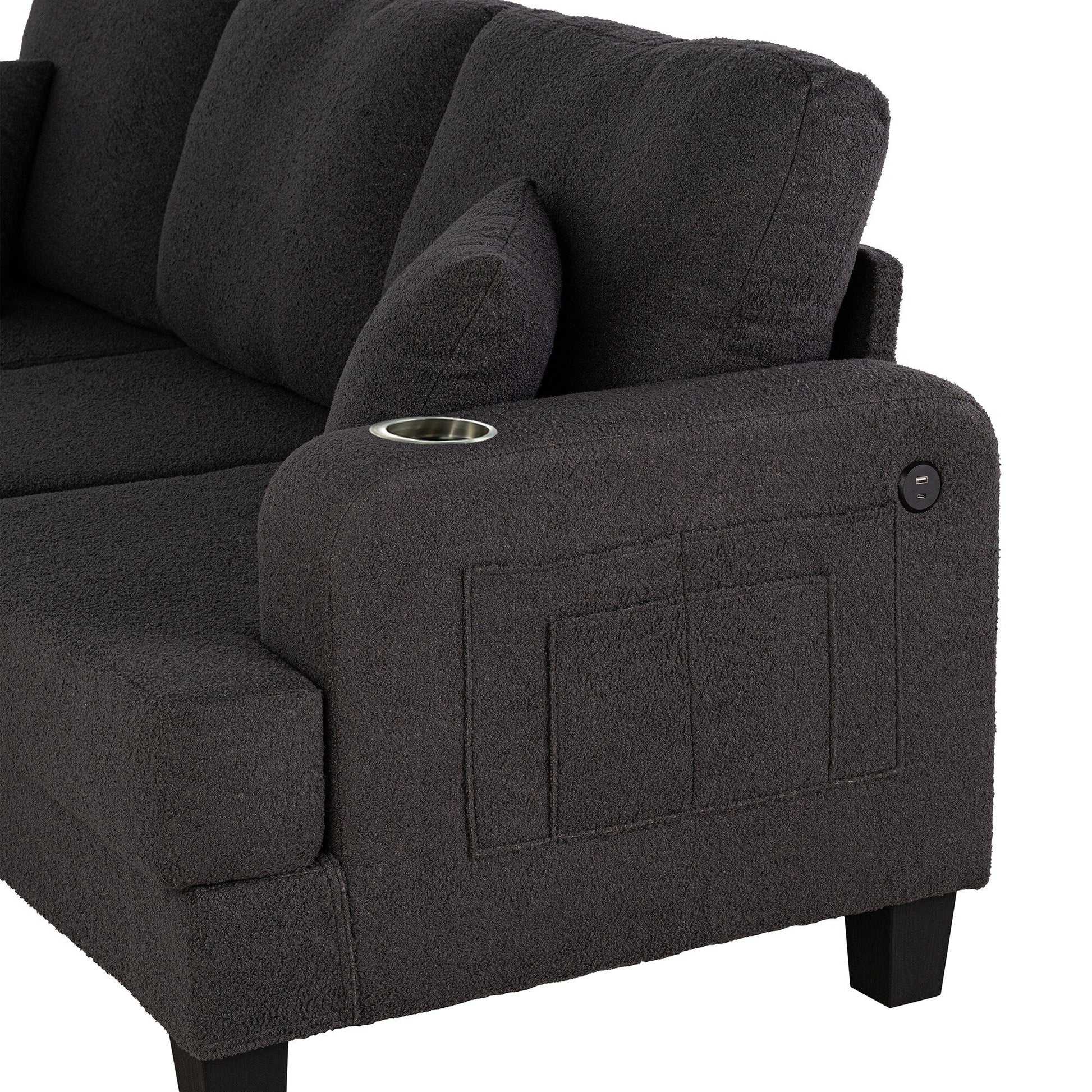 Canapé USB moderne en tissu noir avec 2 porte-gobelets et 2 oreillers