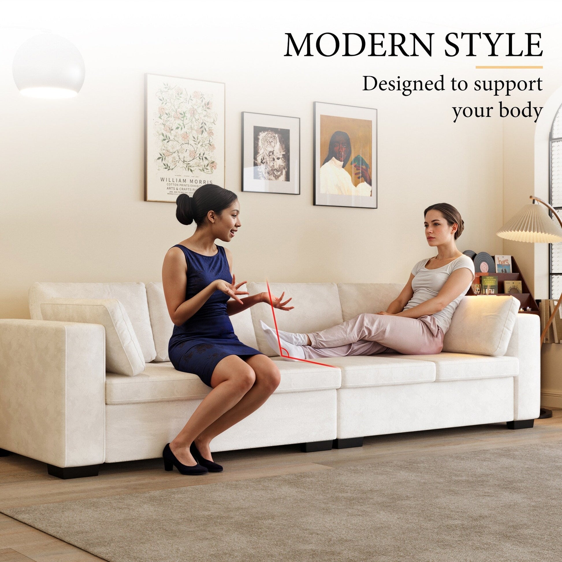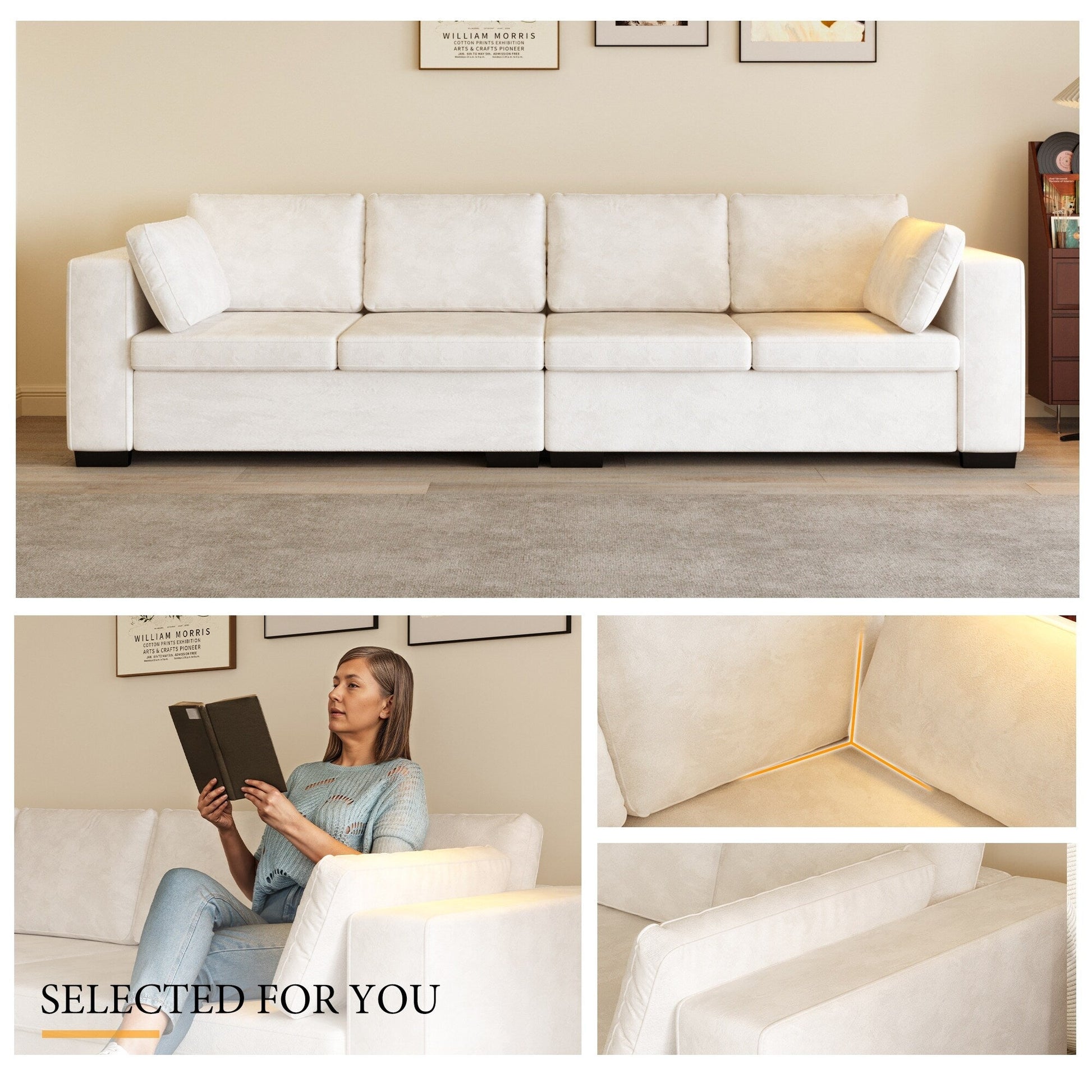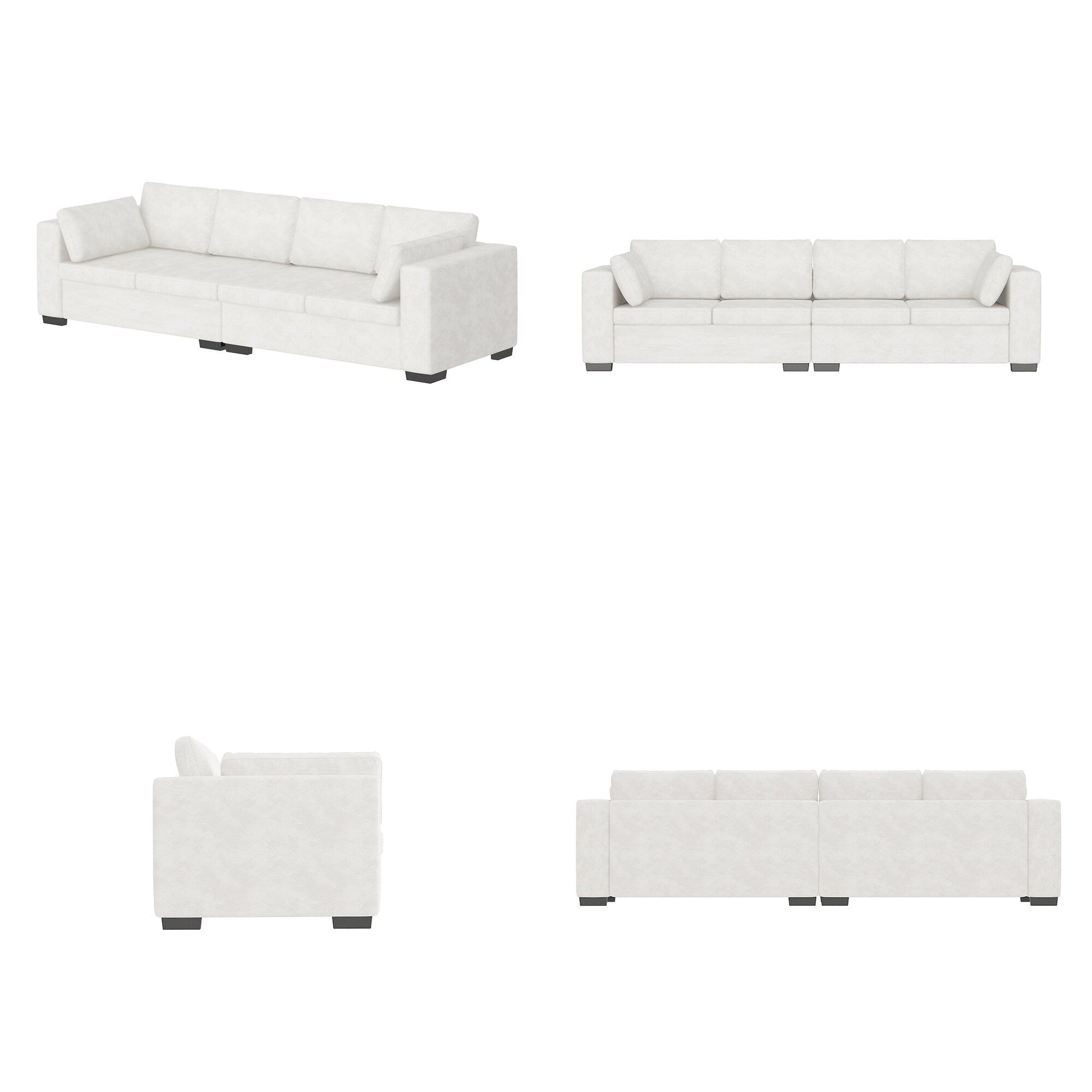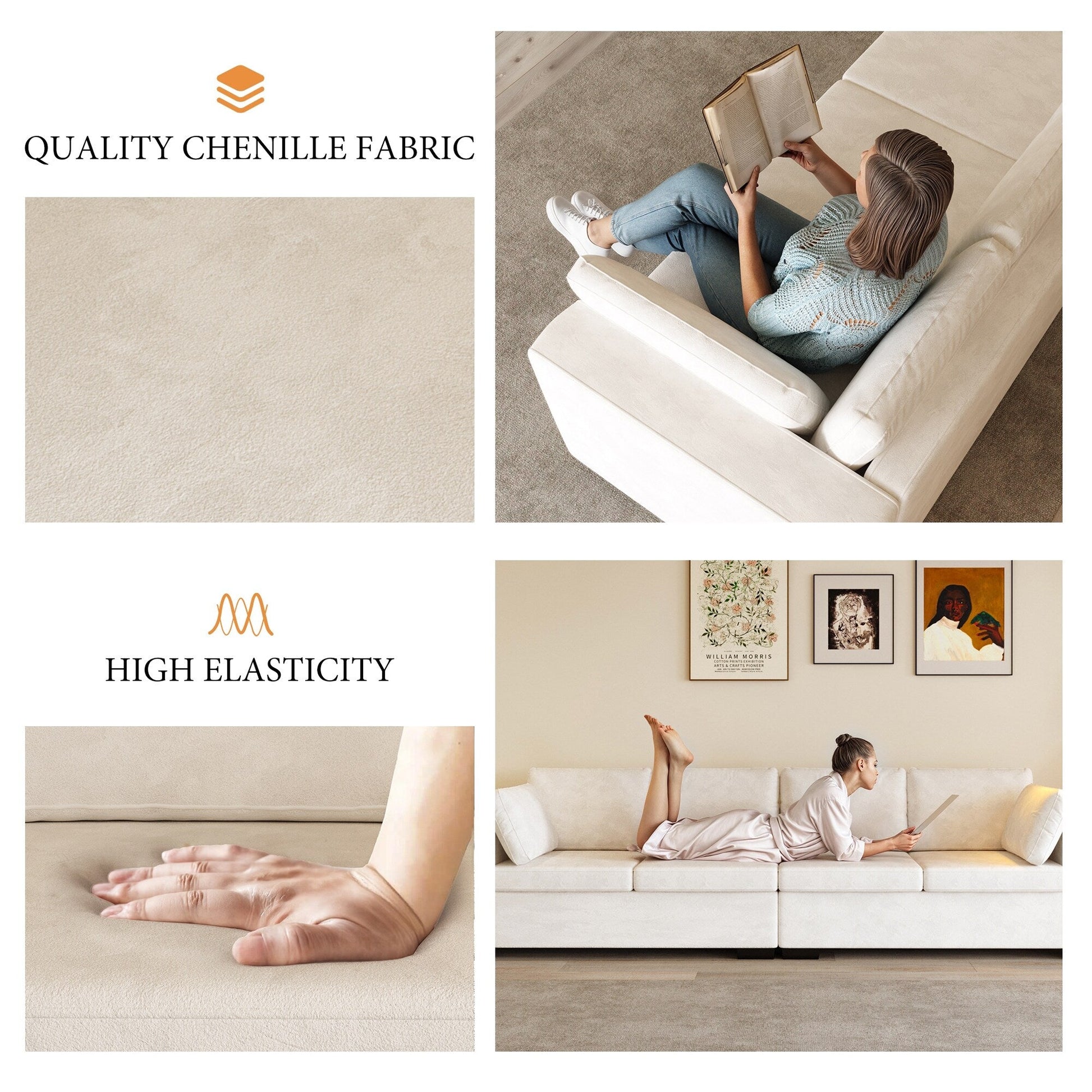 Canapé 4 places moderne en tissu chenille blanc cassé, structure en bois, mousse haute élasticité