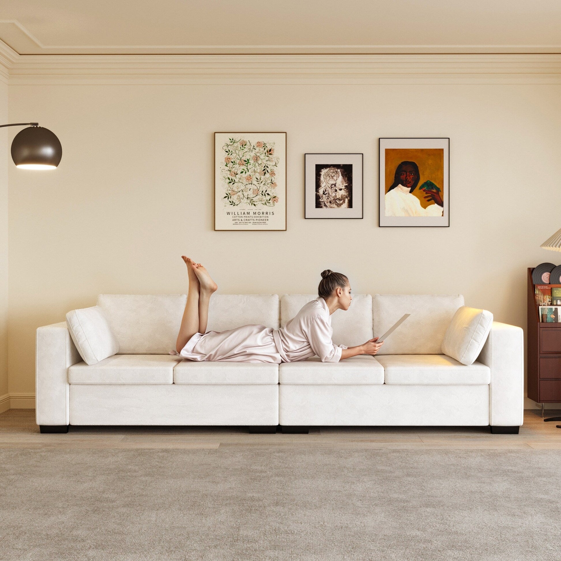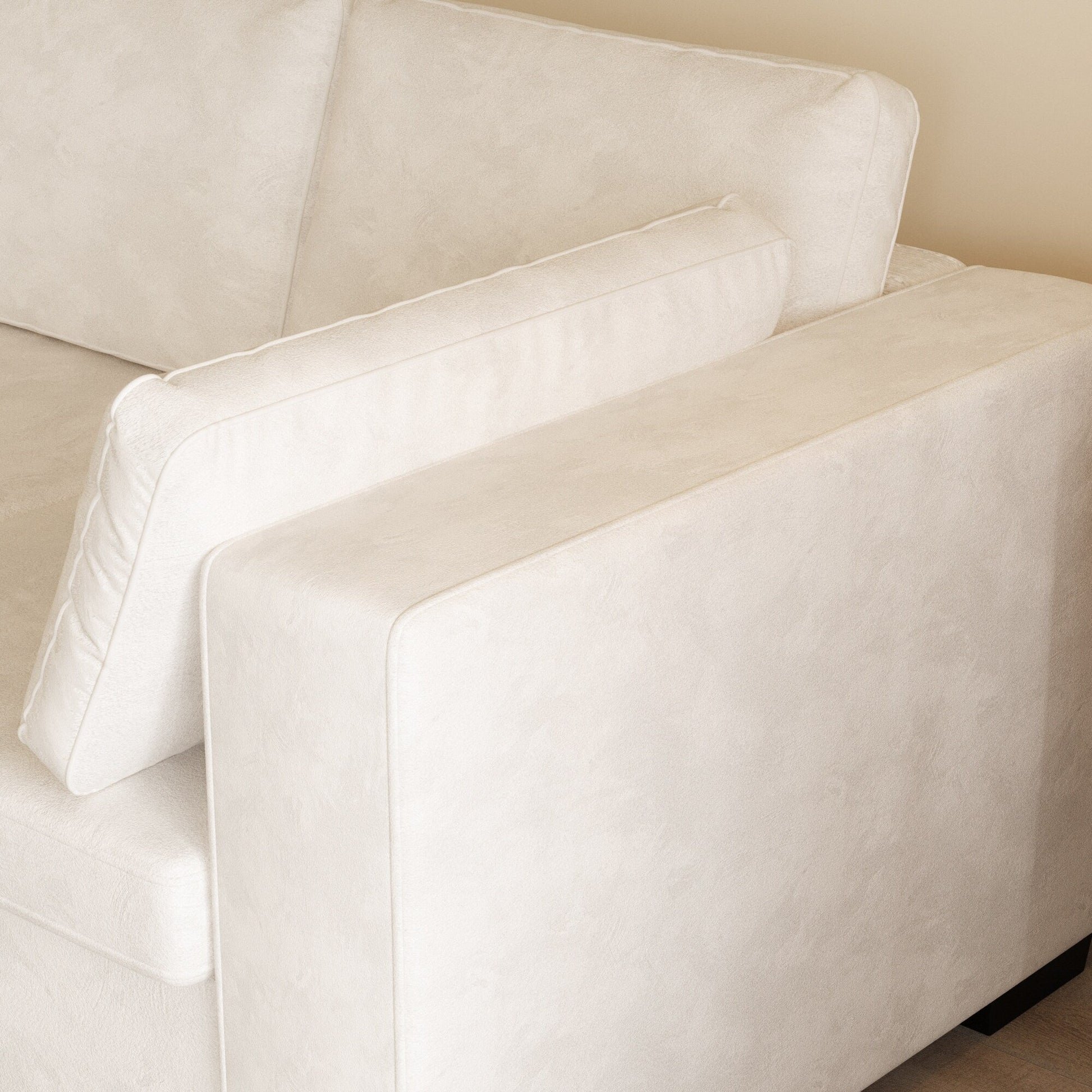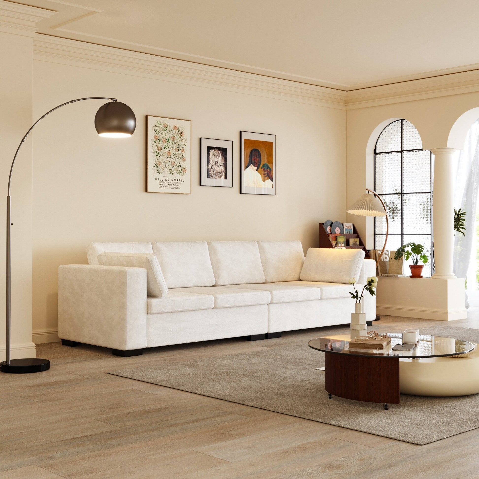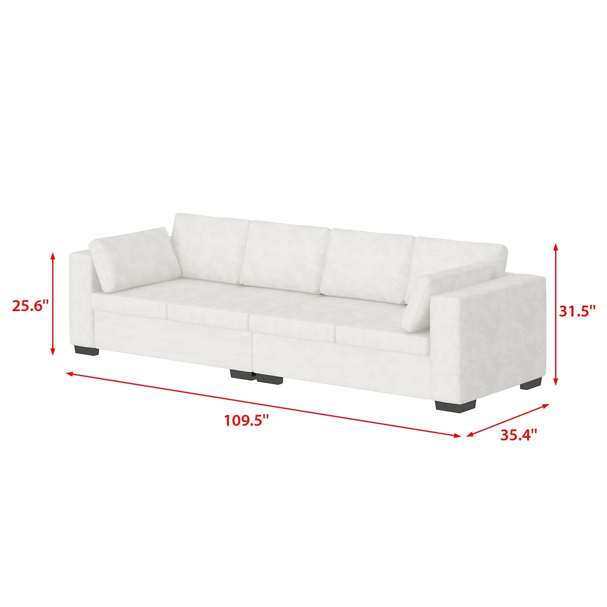 Canapé 4 places moderne en tissu chenille blanc cassé, structure en bois, mousse haute élasticité
