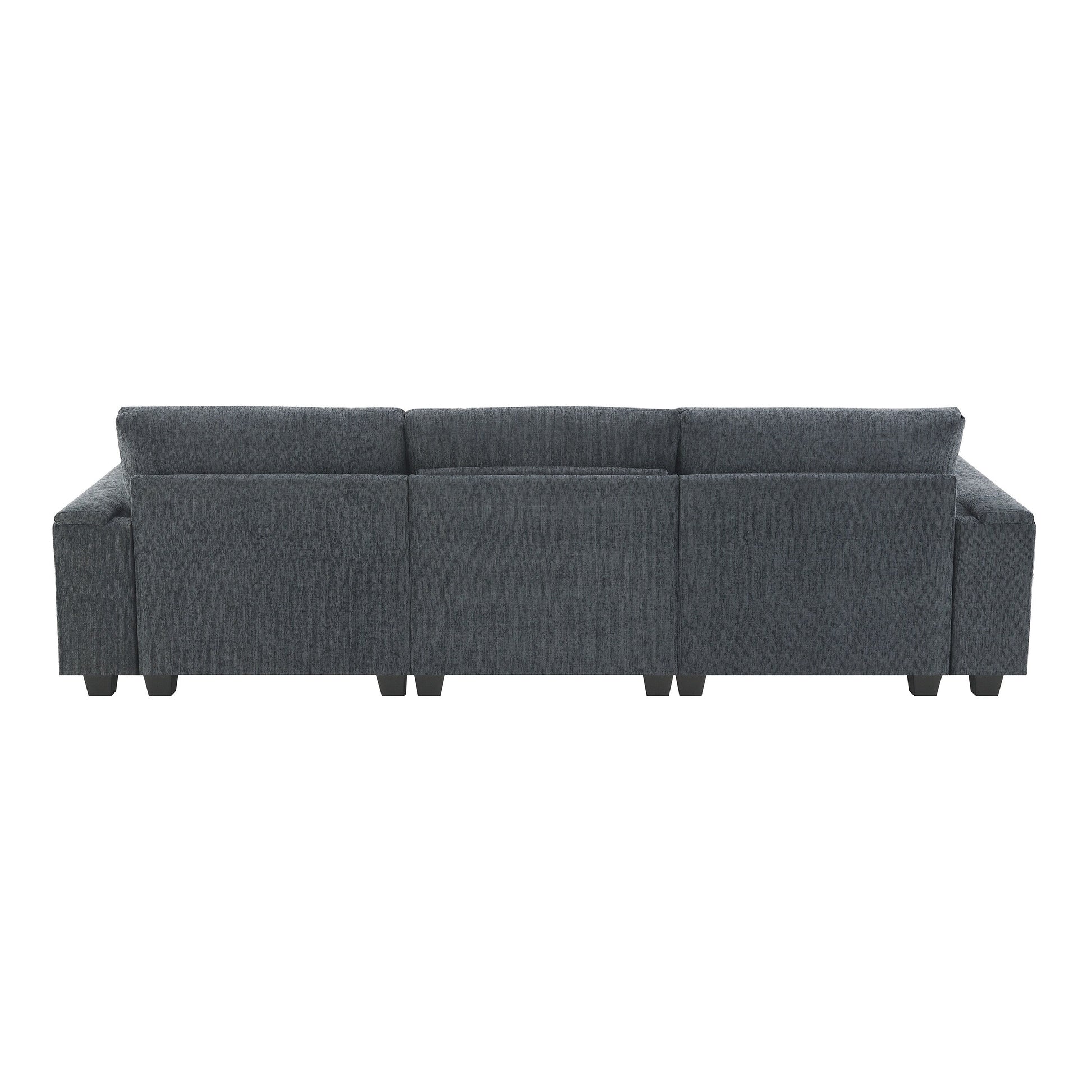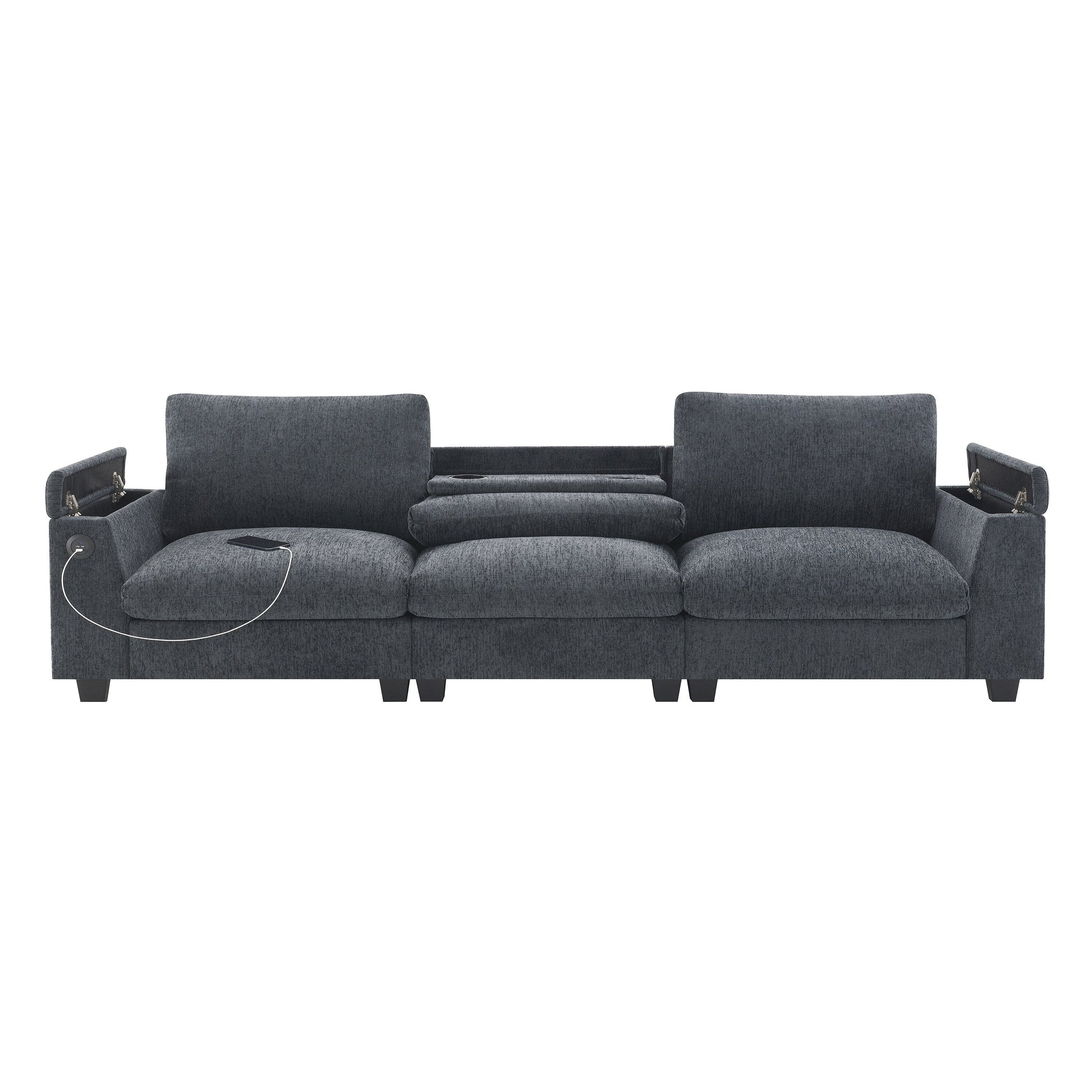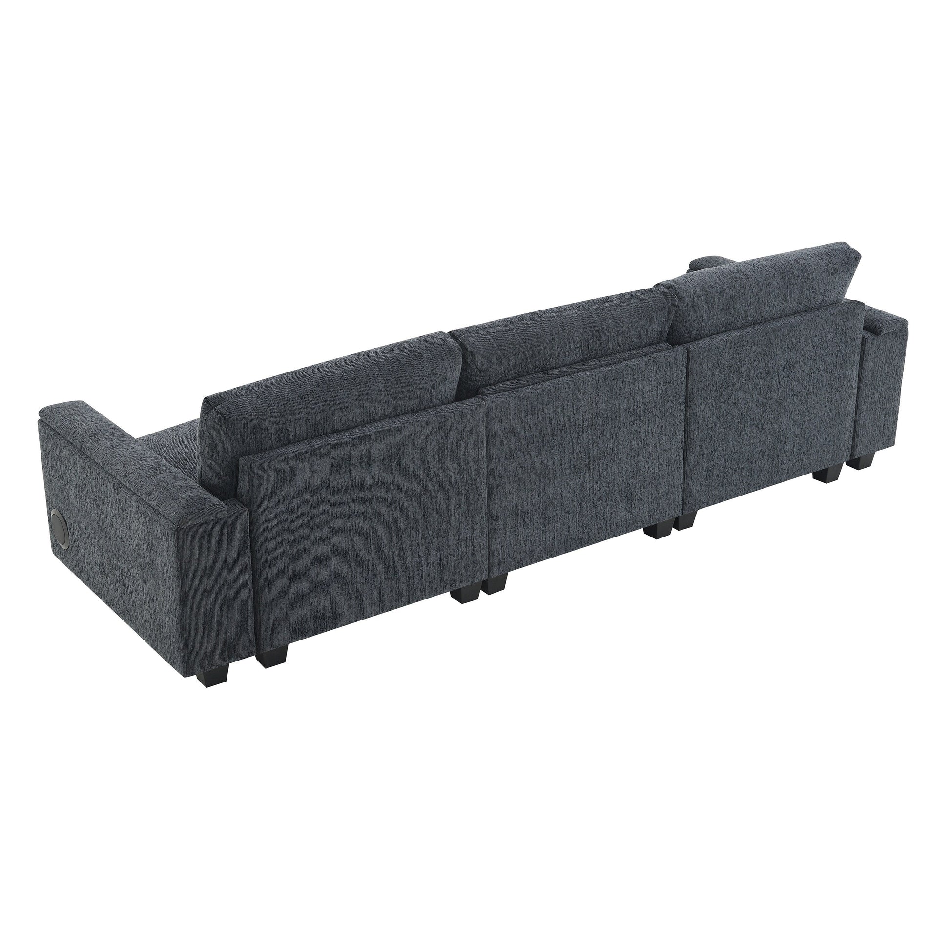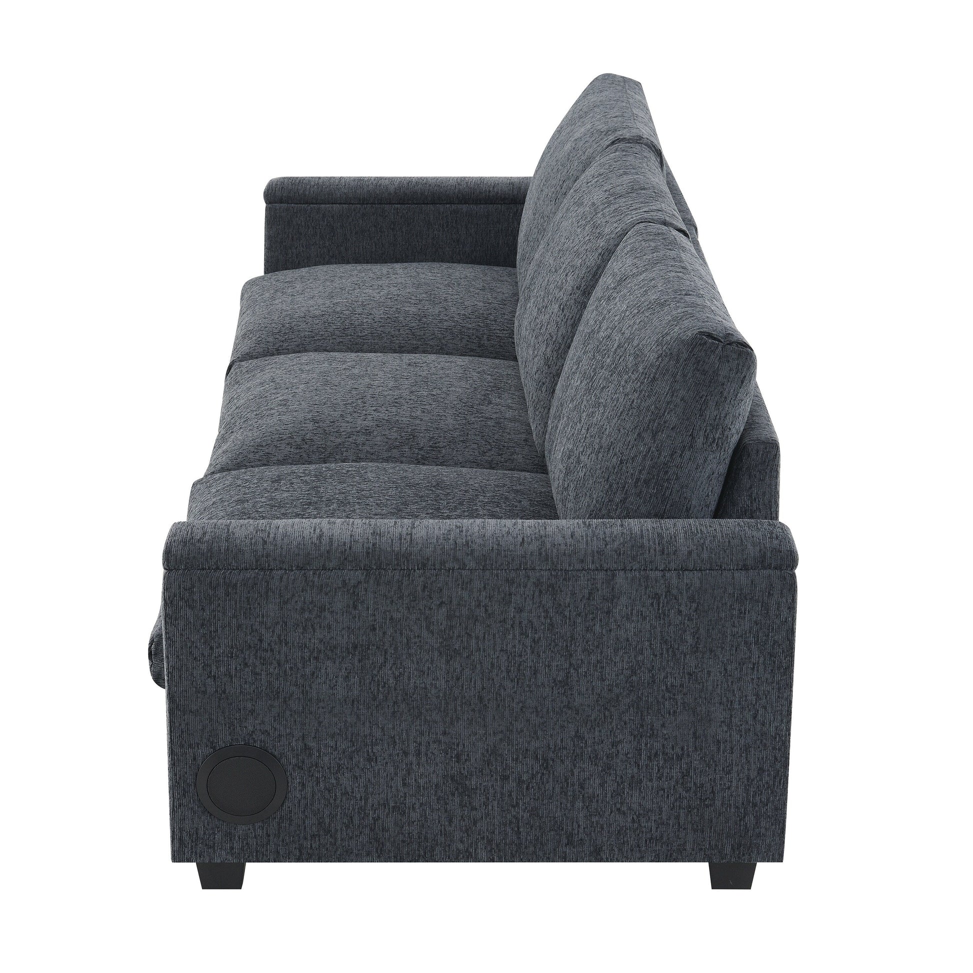 Canapé sectionnel moderne en chenille avec table rabattable, haut-parleurs Bluetooth, chargeur USB, porte-gobelets et rangement dissimulé pour les accoudoirs