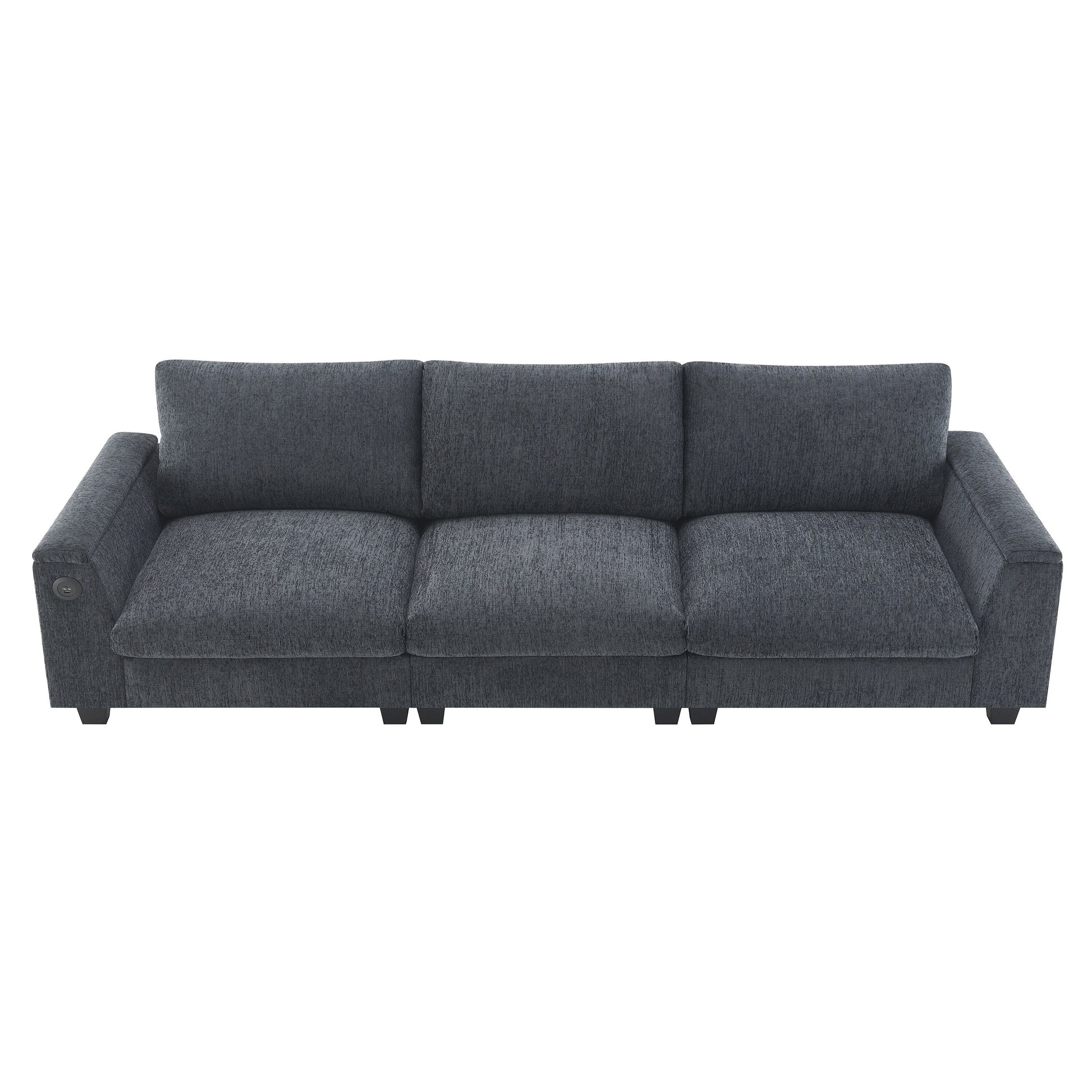 - Ce canapé en chenille allie technologie et confort douillet. Il comprend une table rabattable, des enceintes Bluetooth, un chargeur USB, un rangement dissimulé dans l'accoudoir et des porte-gobelets intégrés. Ses larges assises de 71 cm en font un choix idéal pour se détendre dans un salon ou un appartement moderne.