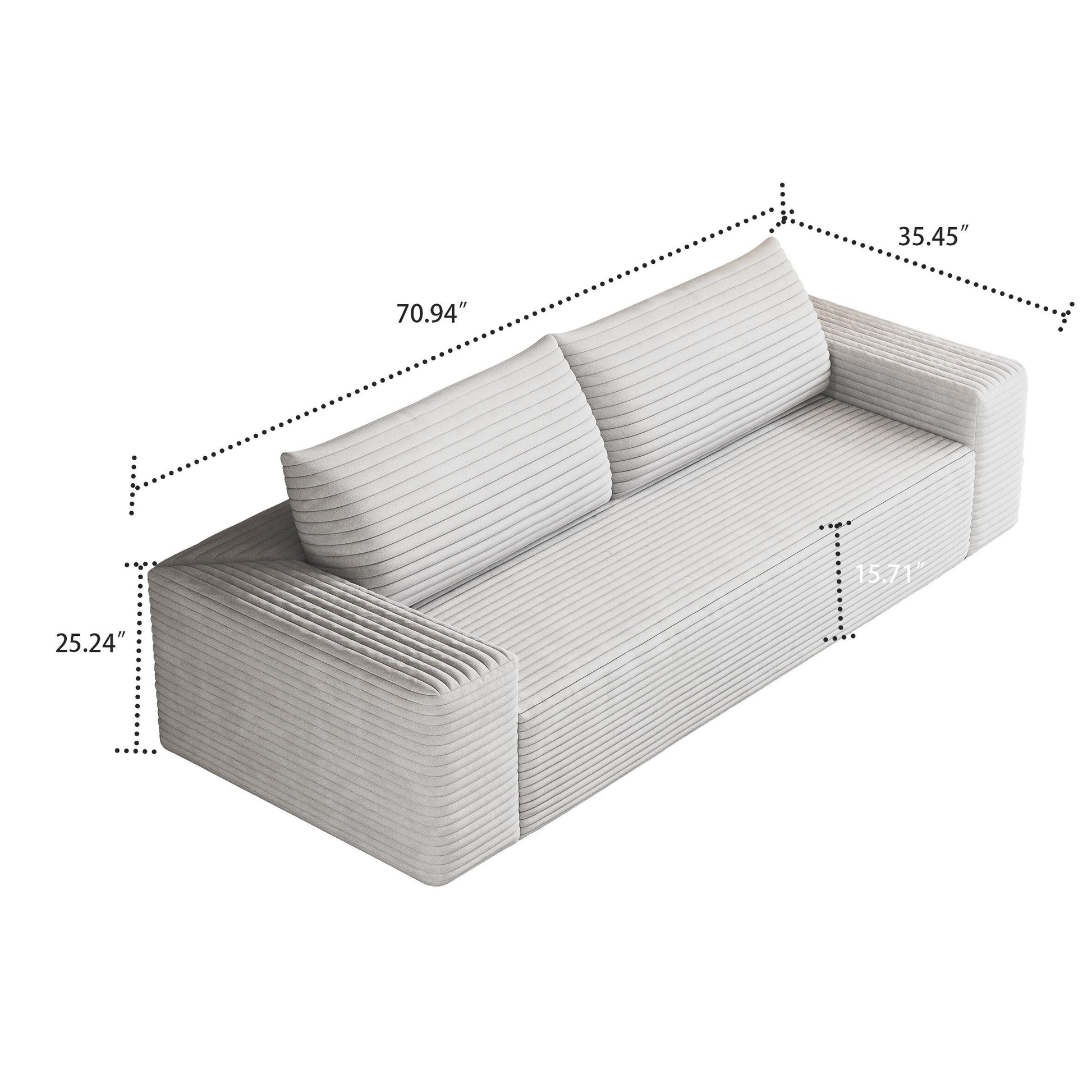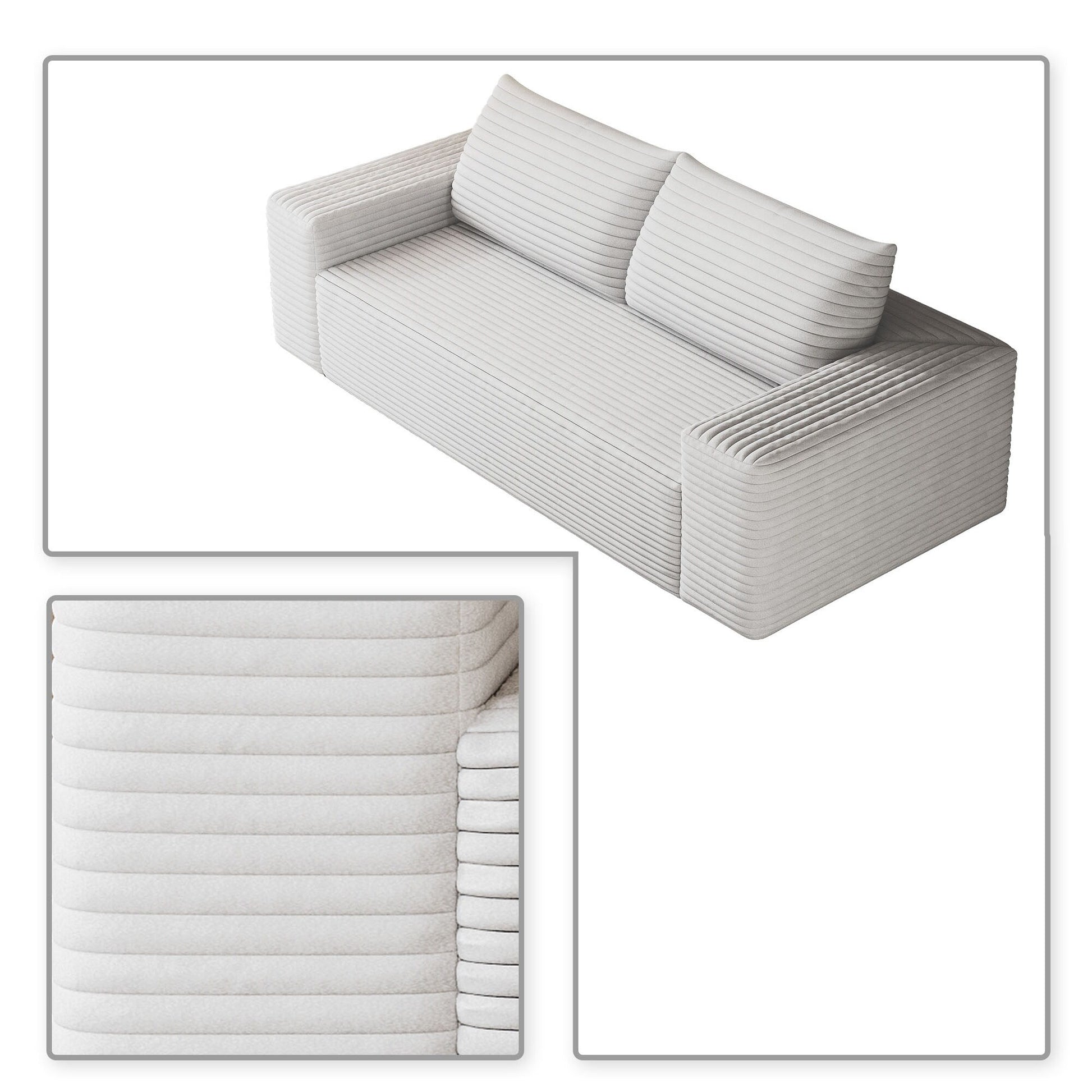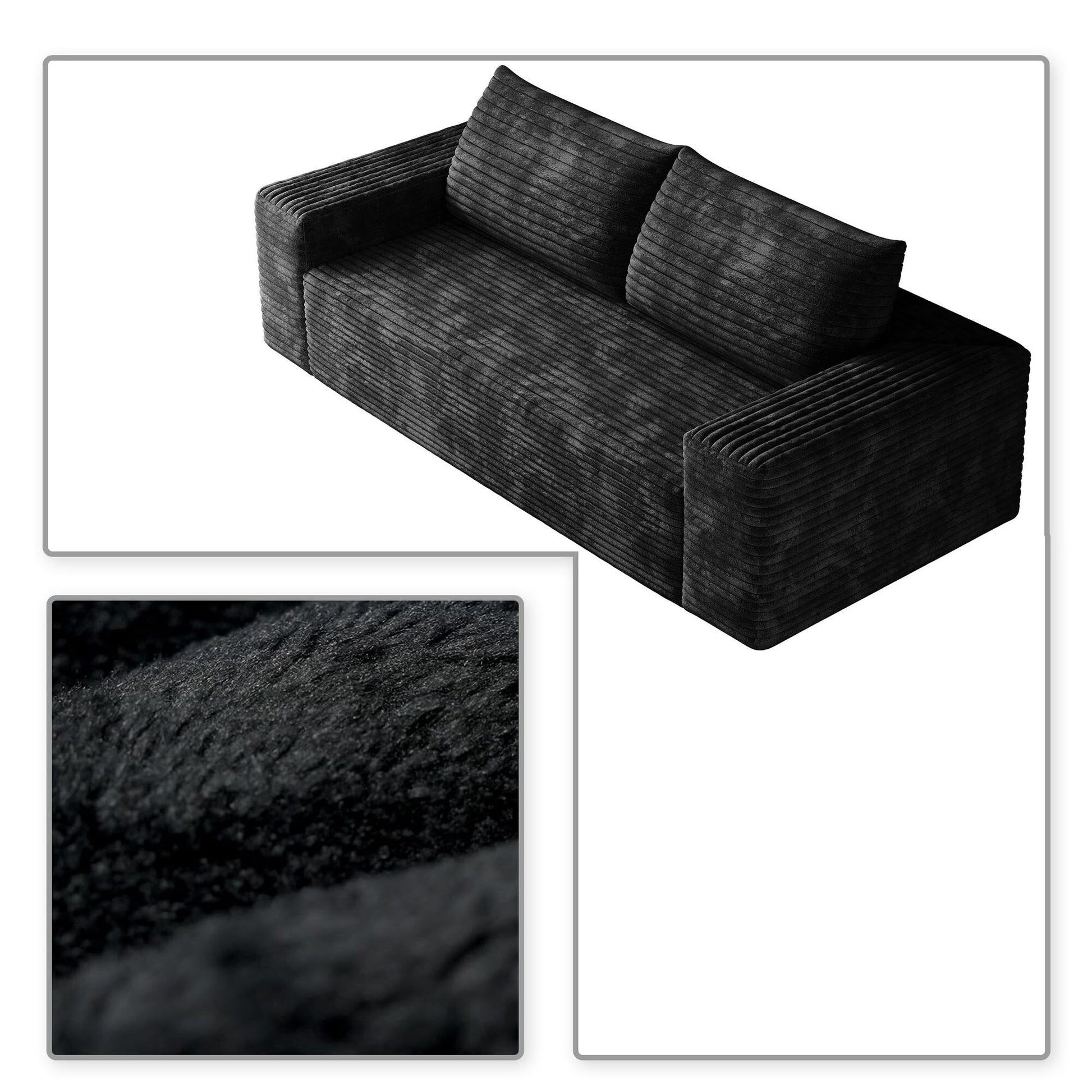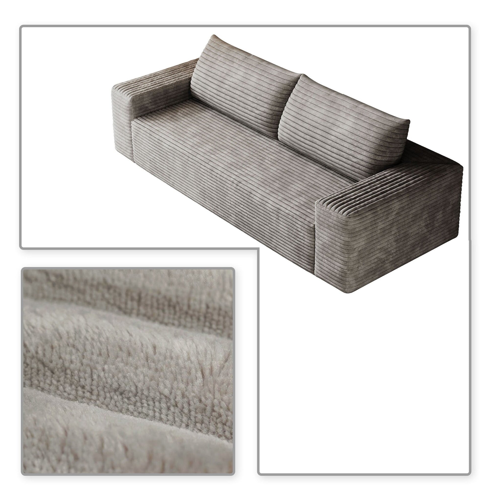 Sublimez votre espace de vie grâce au confort douillet et au style épuré de ce canapé moderne sans cadre, recouvert d'un velours côtelé. Conçu dans un design minimaliste et enveloppé d'un velours côtelé d'une douceur luxueuse, ce canapé apporte une élégance chaleureuse à tout appartement, bureau ou salle de divertissement. Sa forme ergonomique et ses coussins moelleux assurent un confort optimal tout au long de la journée, tandis que sa construction sans cadre et son installation sans outil lui permettent de s'intégrer facilement à tous les intérieurs. Que vous vous prélassiez seul ou que vous organisiez des soirées cinéma, ce meuble polyvalent allie à la perfection simplicité, fonctionnalité et texture chaleureuse.