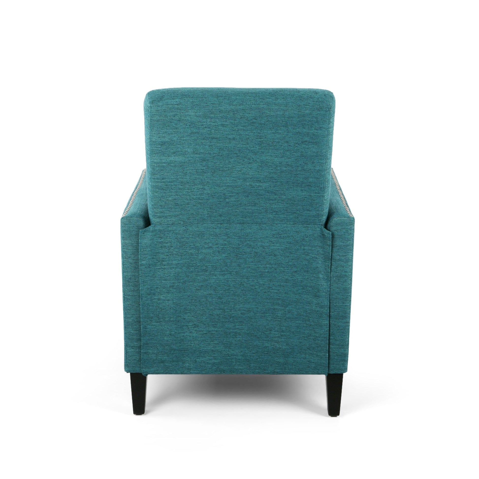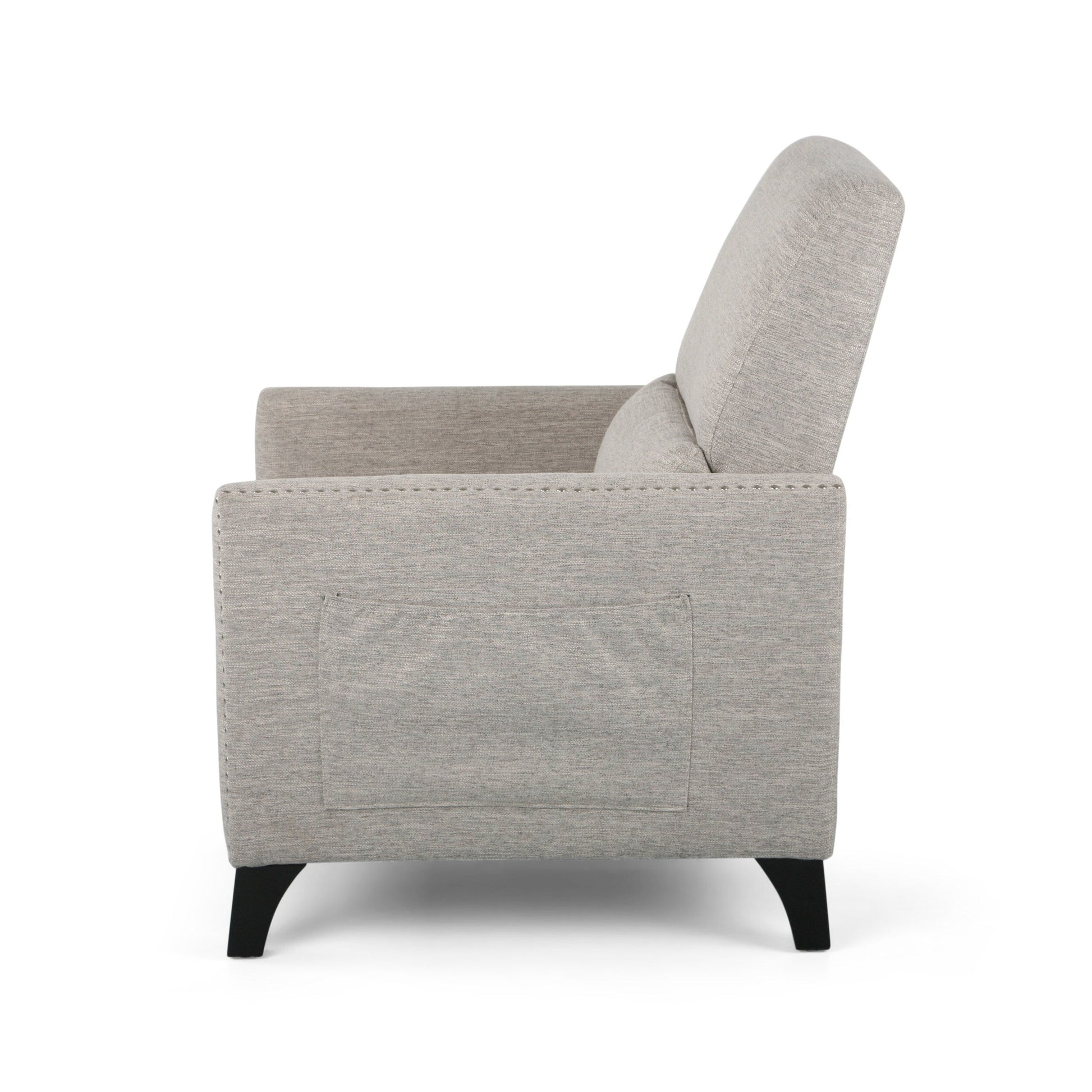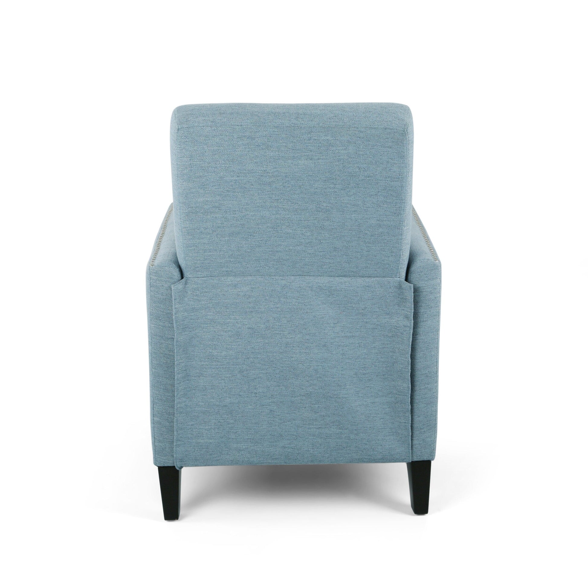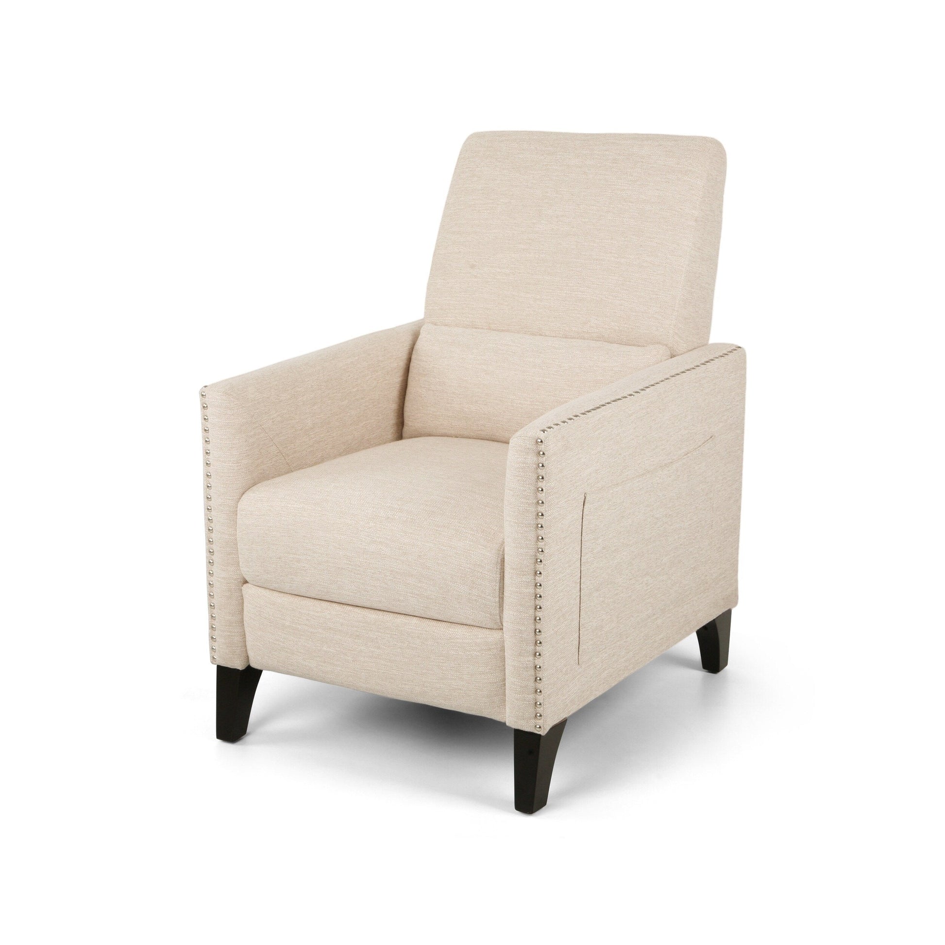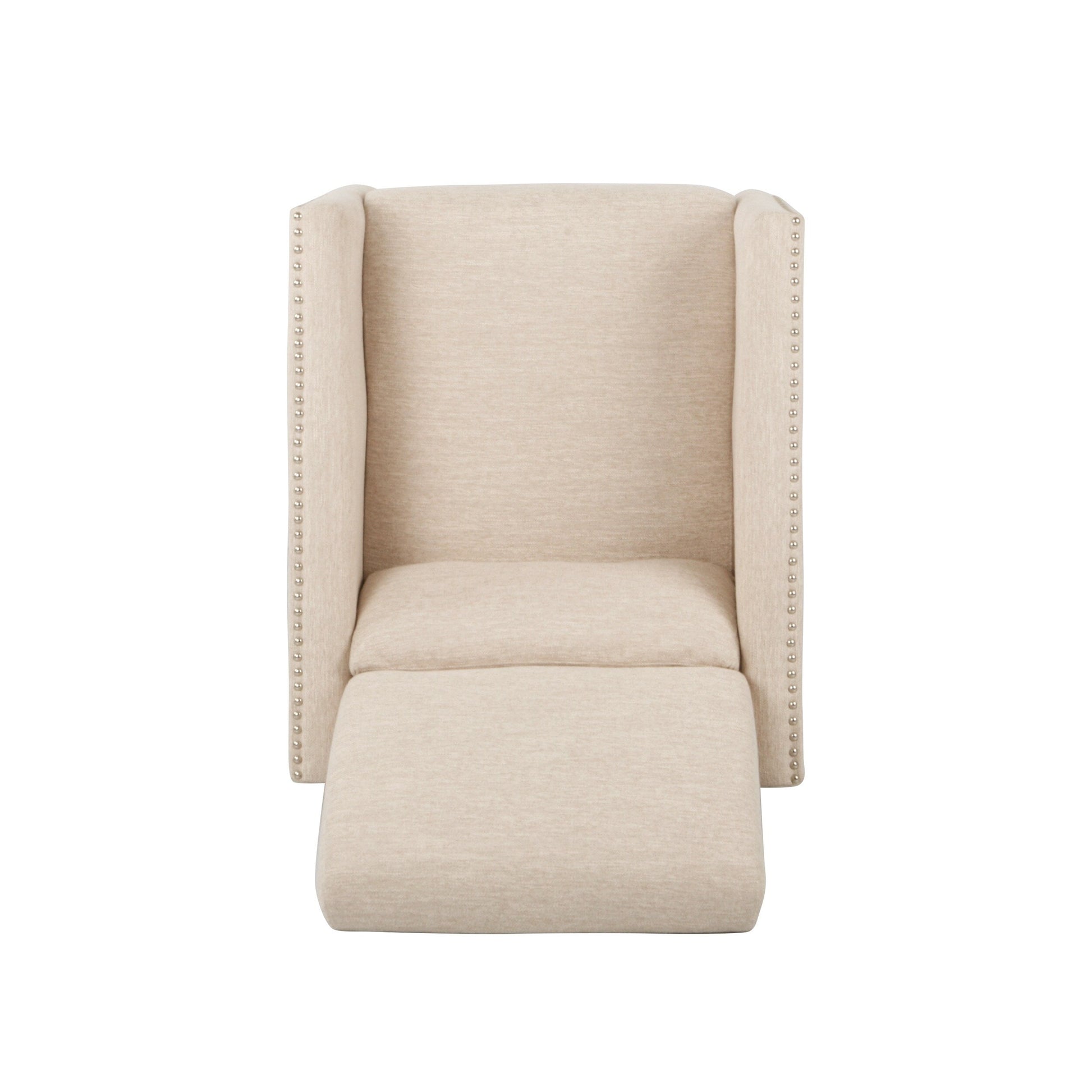 Fauteuil inclinable moderne en tissu avec repose-pieds, détails cloutés et pieds en bouleau
