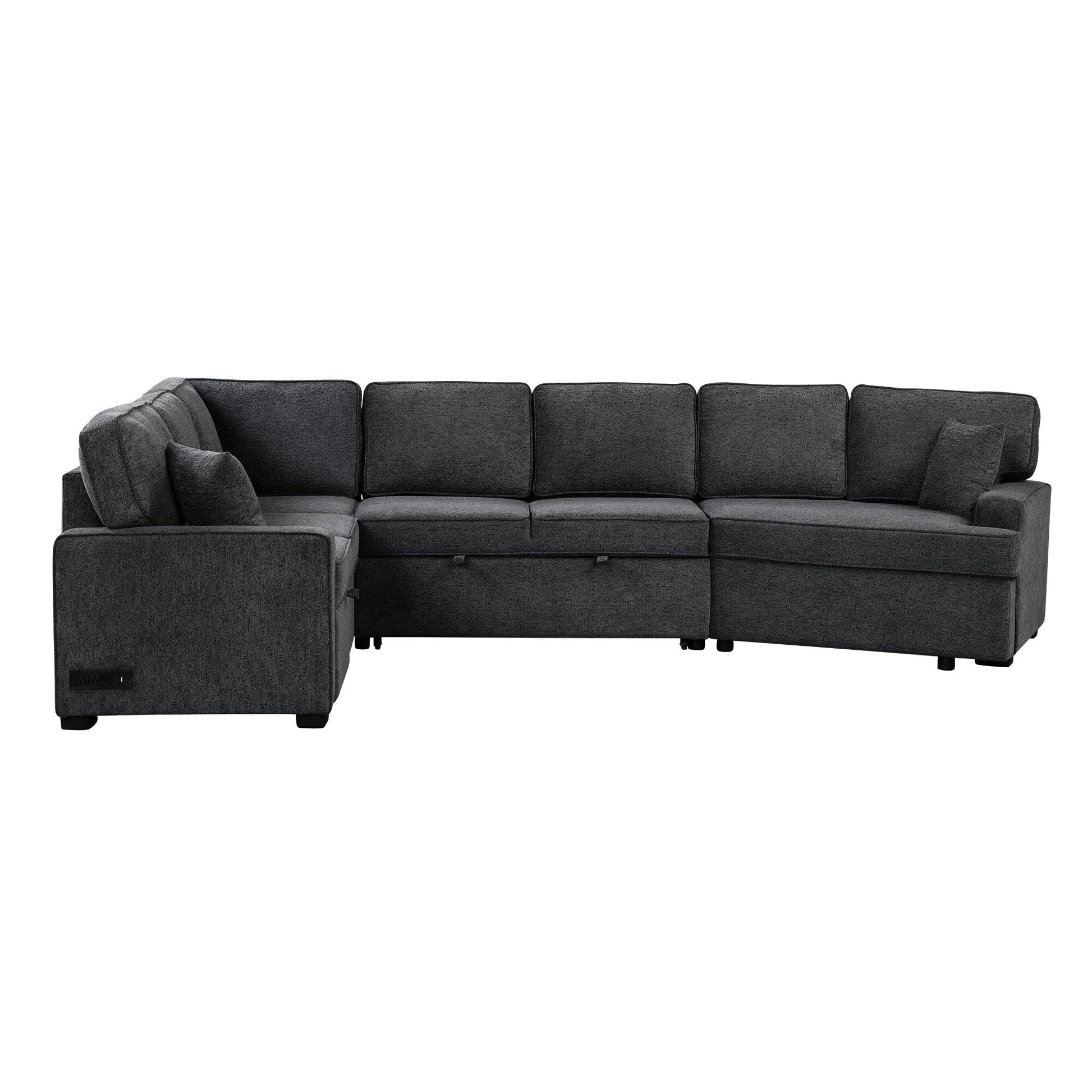 Canapé sectionnel moderne en L avec lit gigogne, ports USB et tables rabattables pour porte-gobelets pour salon