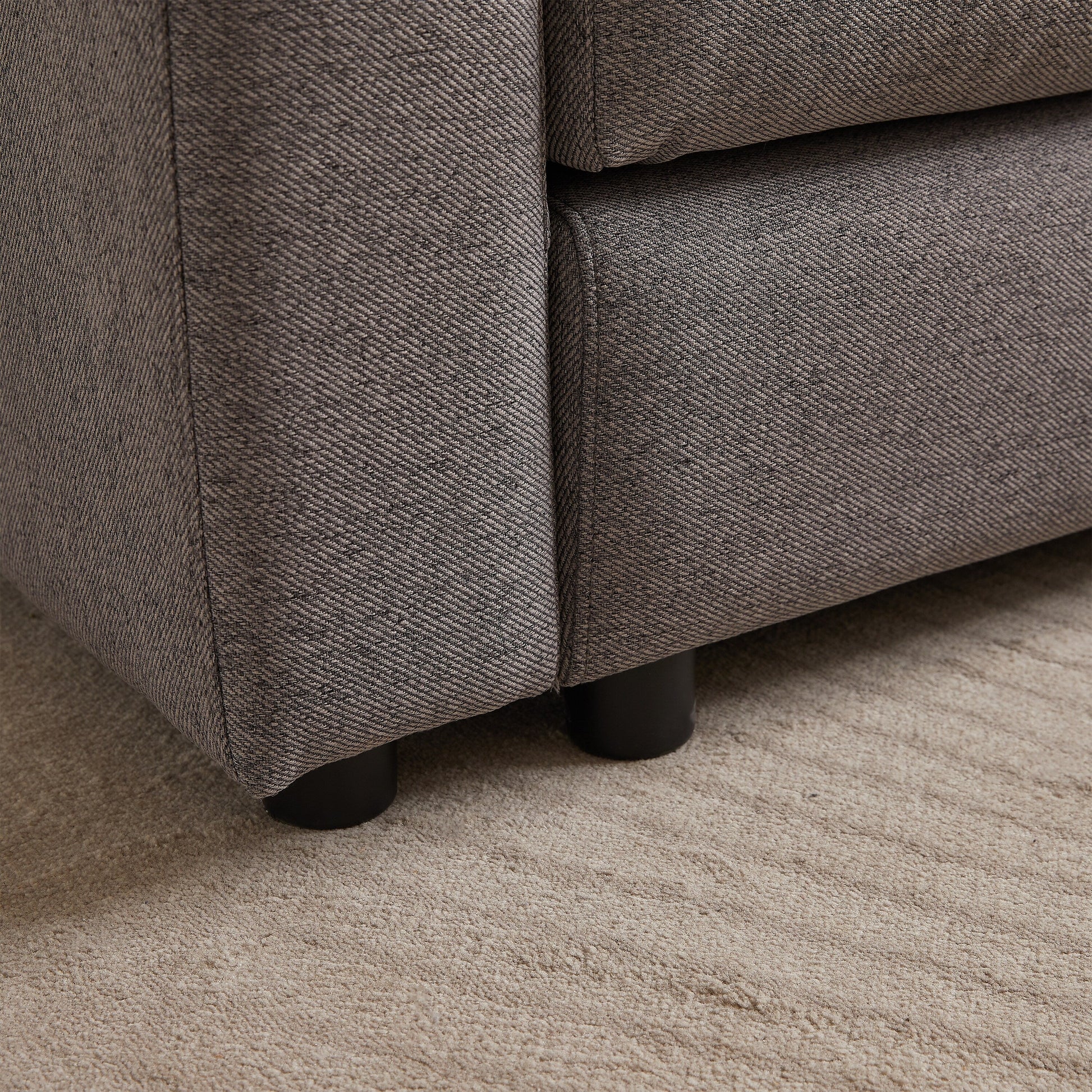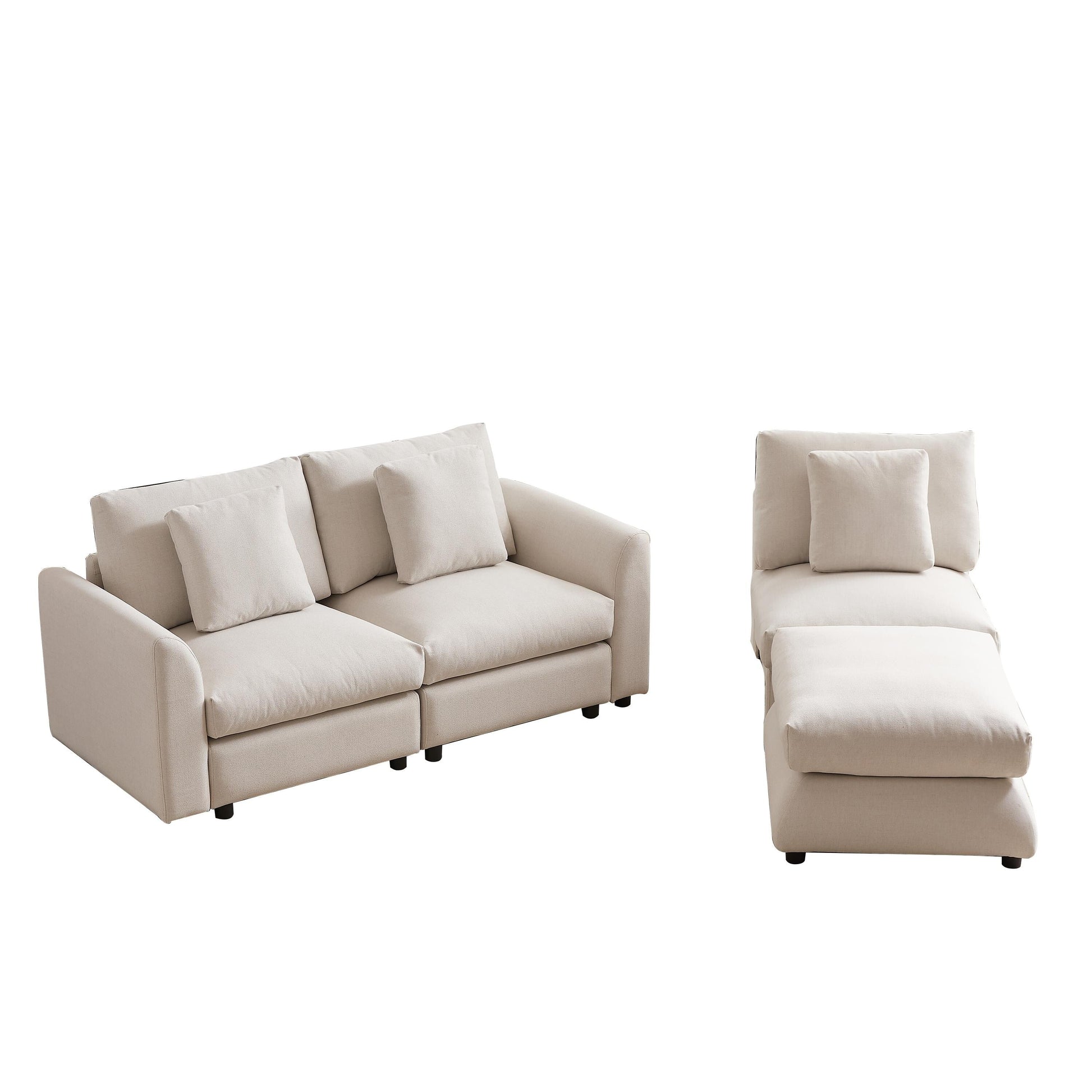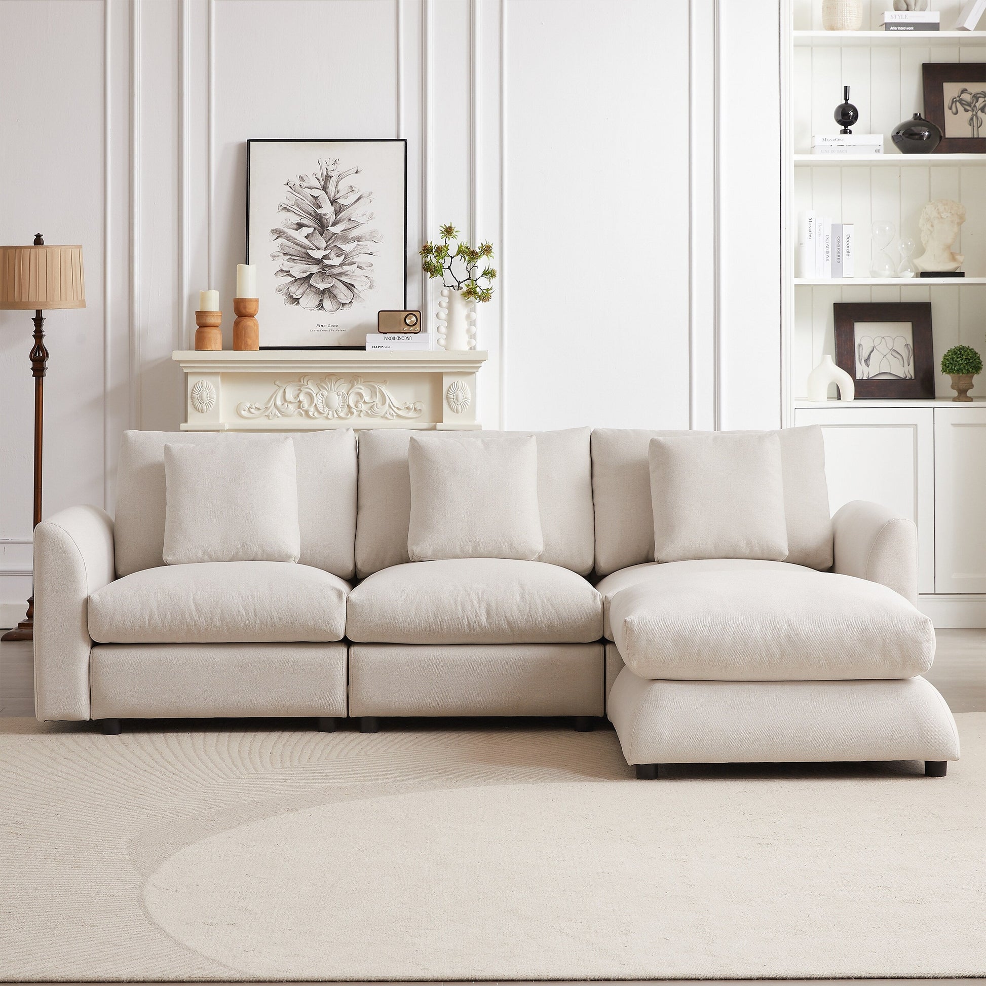 - Ce canapé modulable en L de 260 cm présente un style épuré et moderne avec trois coussins de dossier et trois oreillers pour un confort personnalisable. Son pouf amovible et son agencement polyvalent en font un choix pratique pour les salons, les appartements ou les studios.