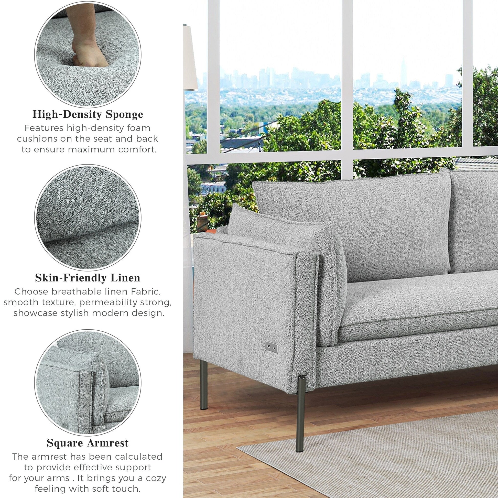 Canapé 3 places de style moderne en tissu de lin rembourré