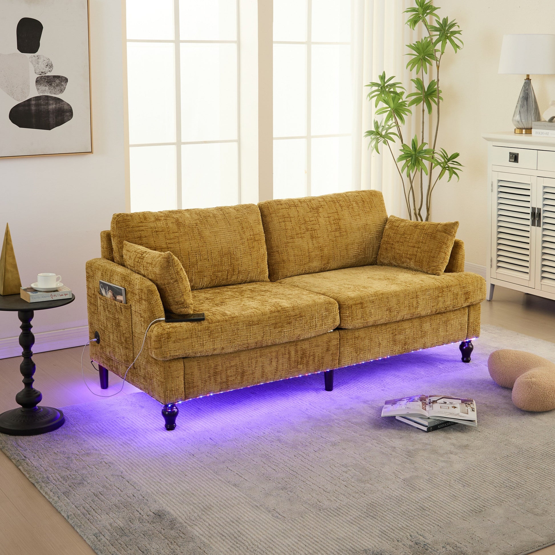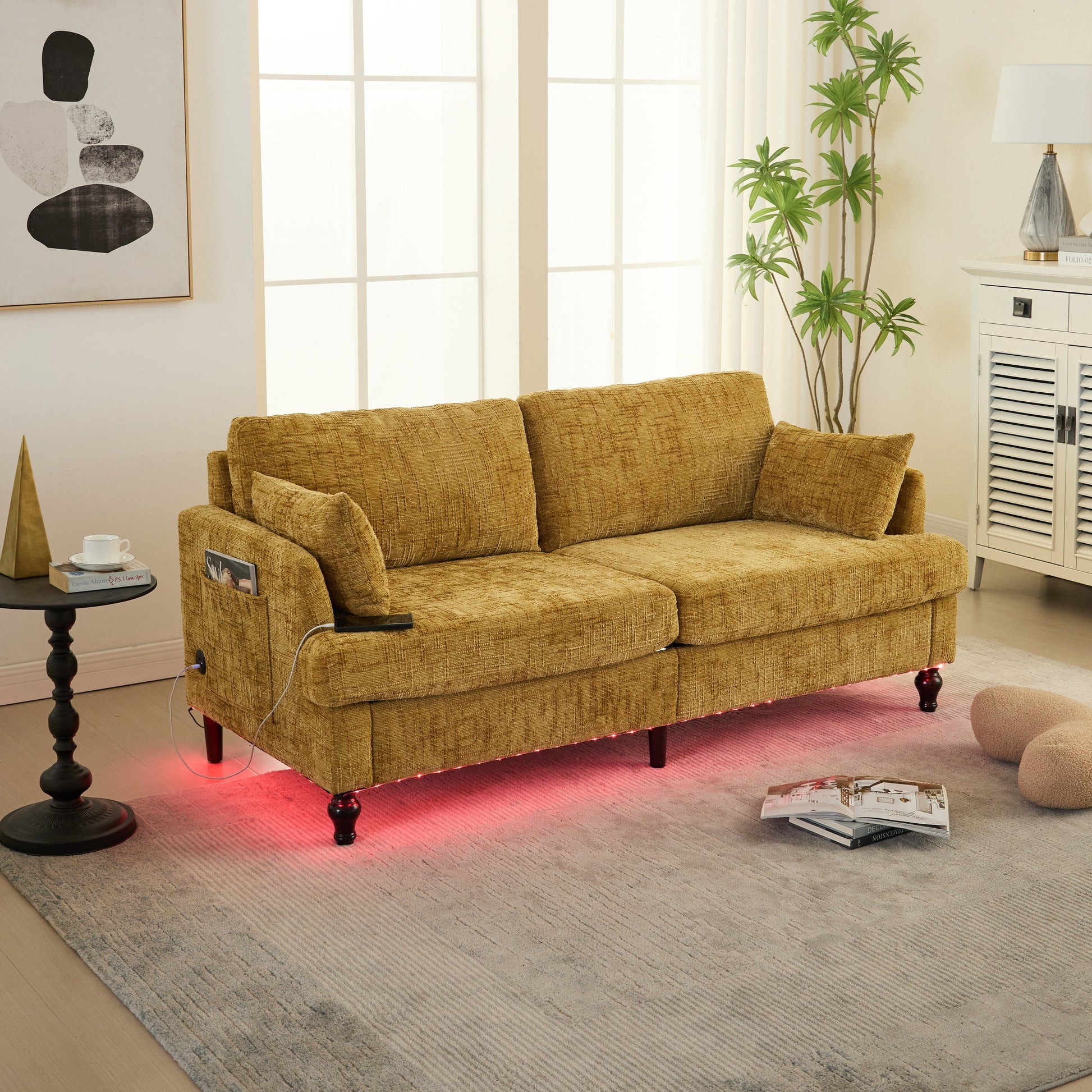 [Canapé moderne multifonctionnel] Un mélange parfait de confort et de technologie, ce canapé en tissu est livré avec un port de chargement USB, un éclairage d'ambiance LED et des poches de rangement latérales, ce qui le rend idéal pour le salon, la chambre ou le bureau.