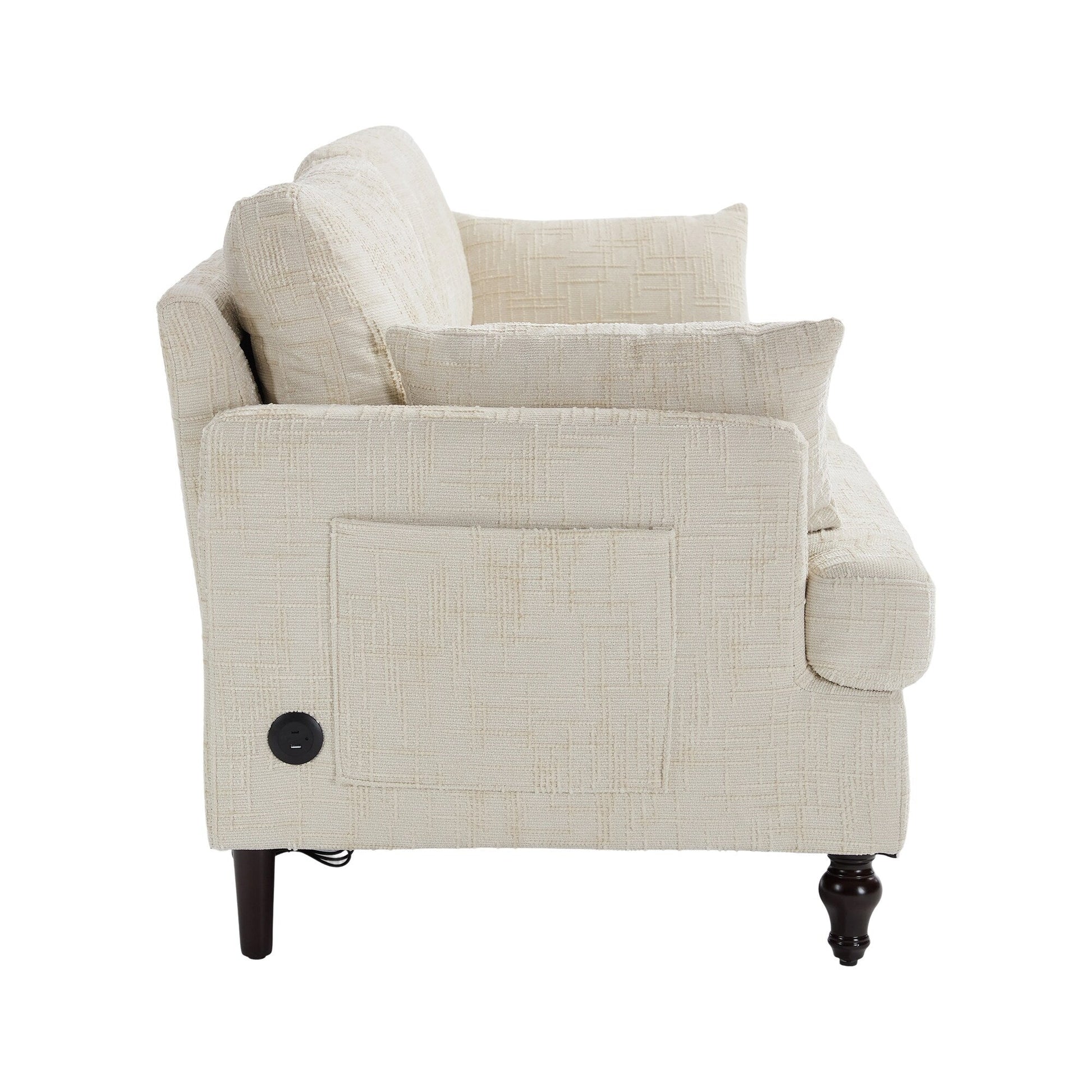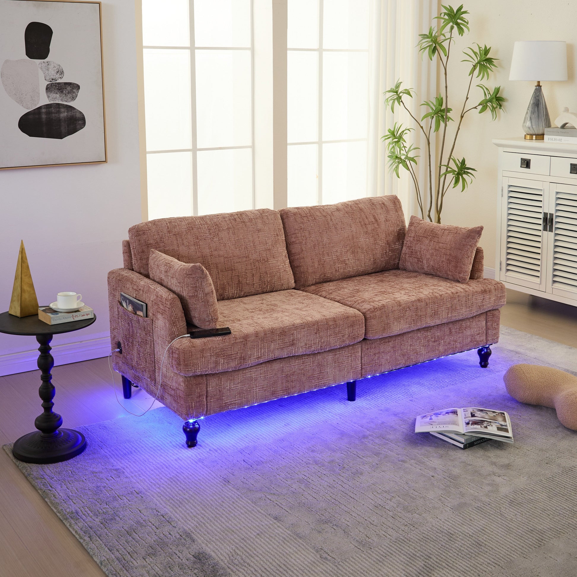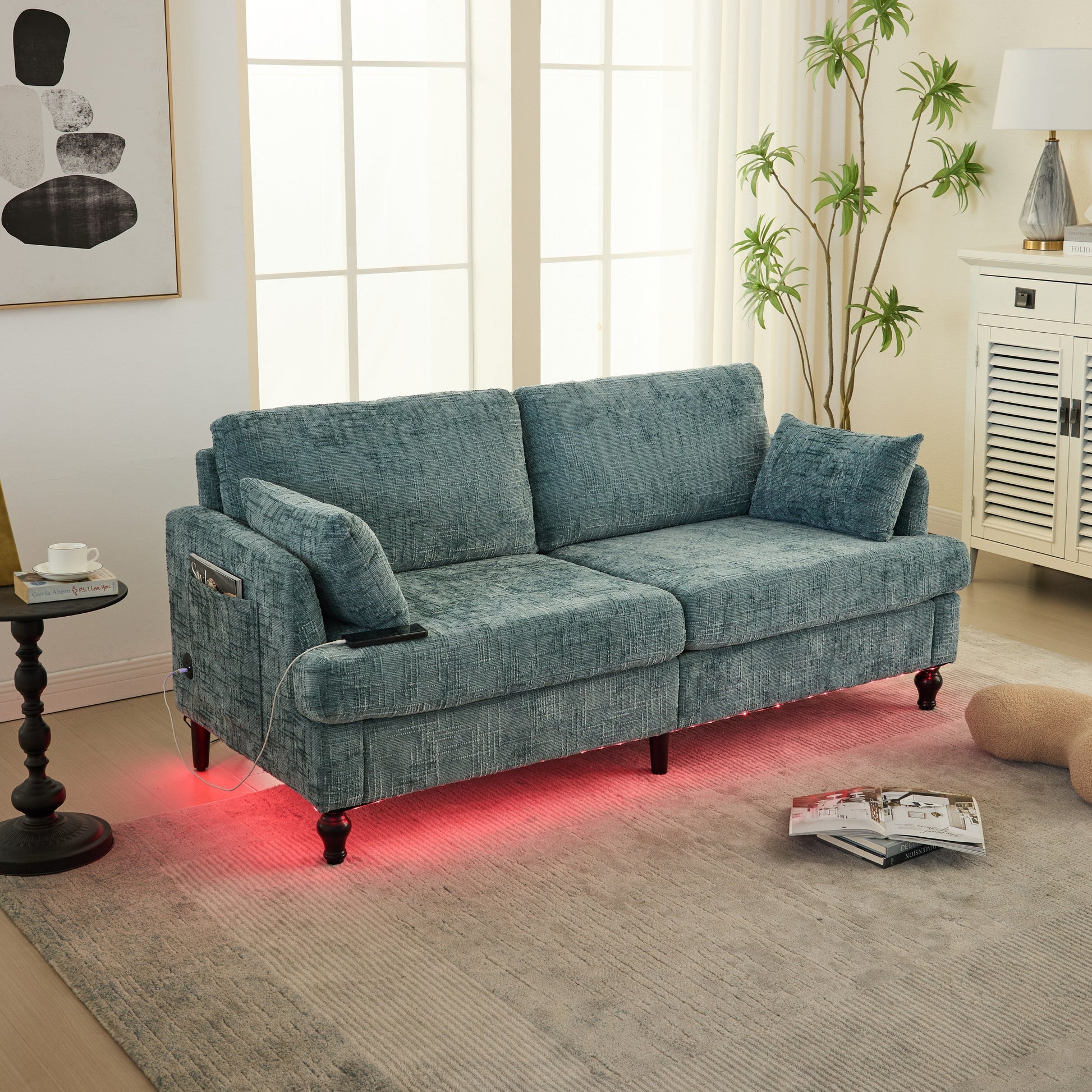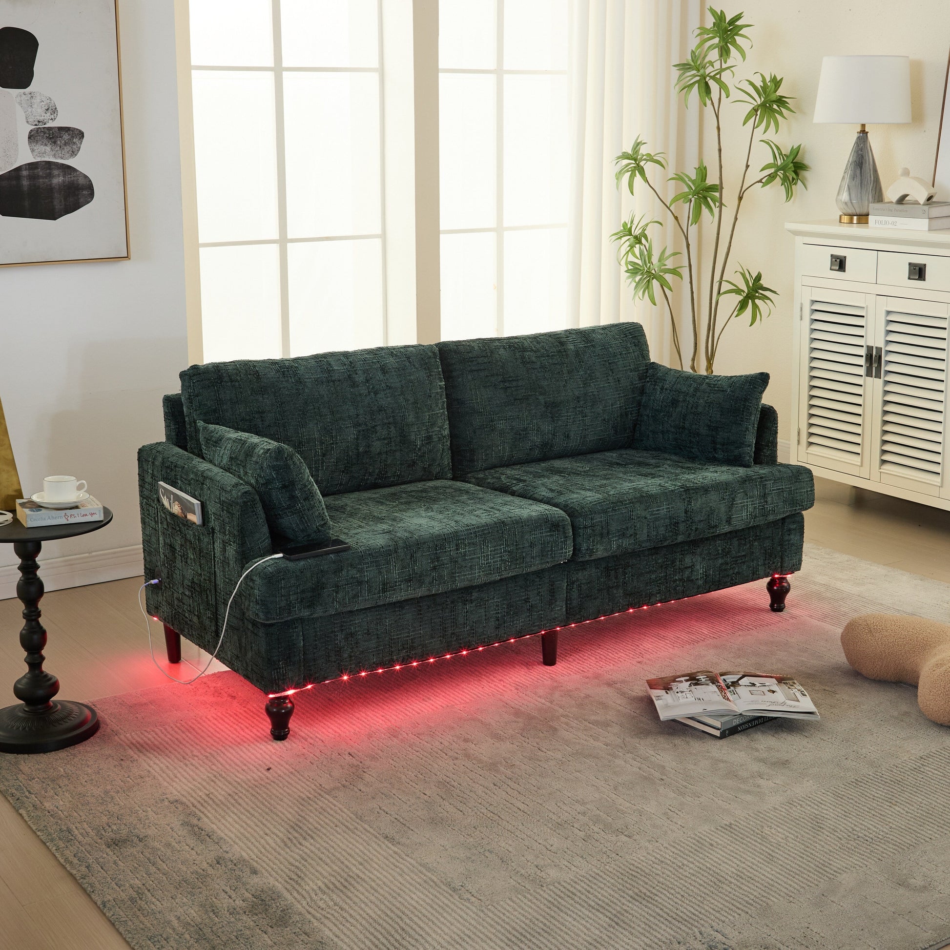 Canapé 2 places en chenille de style moderne avec pieds en bois, éclairage LED, port de chargement USB et sac de rangement, idéal pour le salon, la chambre à coucher ou le bureau.
