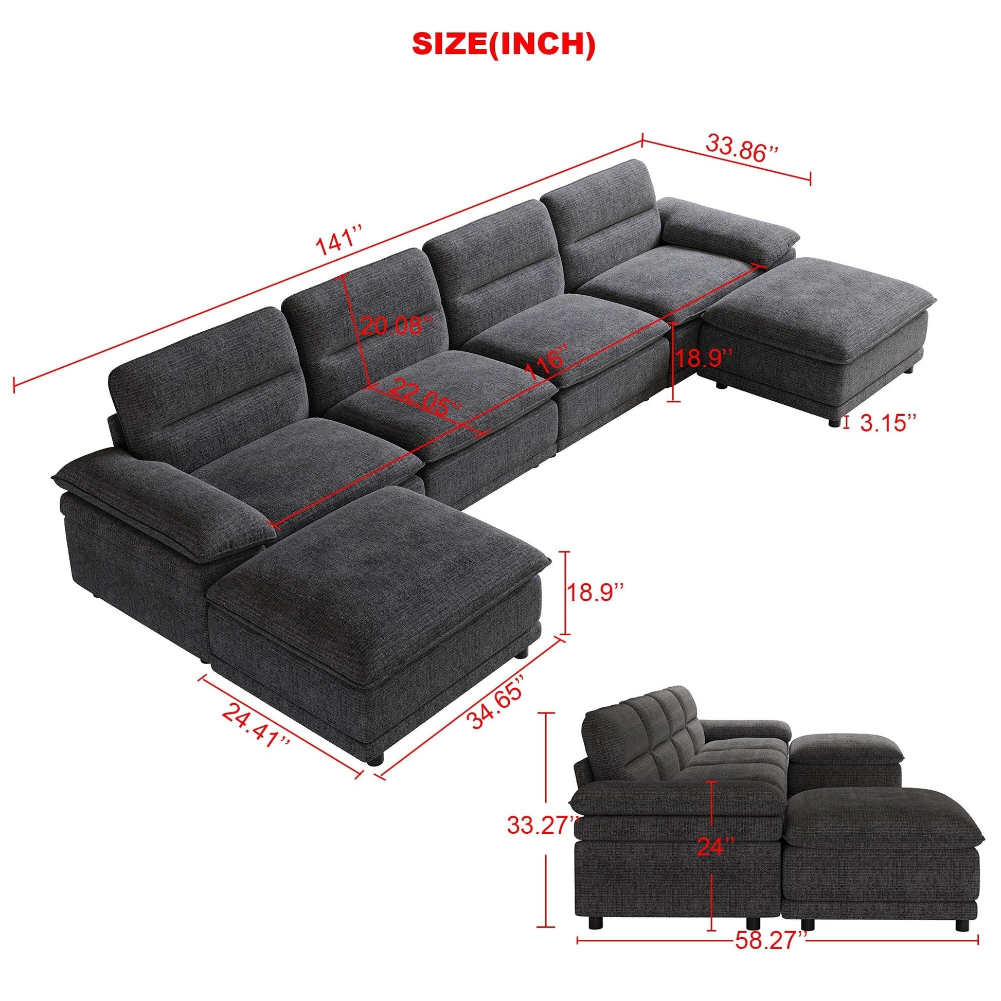 - Ce canapé d'angle moderne en U offre une assise spacieuse pouvant accueillir jusqu'à six personnes. Revêtu d'un doux tissu chenille, il est doté de coussins moelleux en mousse haute densité et ressorts ensachés. Il comprend des poufs amovibles et une méridienne pour une détente optimale dans tous les espaces de vie.