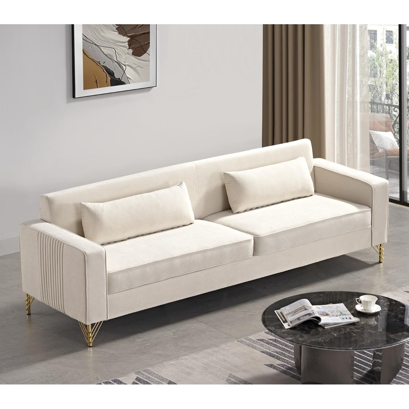 Ce canapé de 217 cm de large offrira une allure à la fois fraîche et classique, s'intégrant parfaitement à n'importe quel espace. Sublimez votre salon avec une touche de sophistication raffinée grâce à ce canapé de collection. Sa surface est entièrement recouverte de velours, doux et confortable.