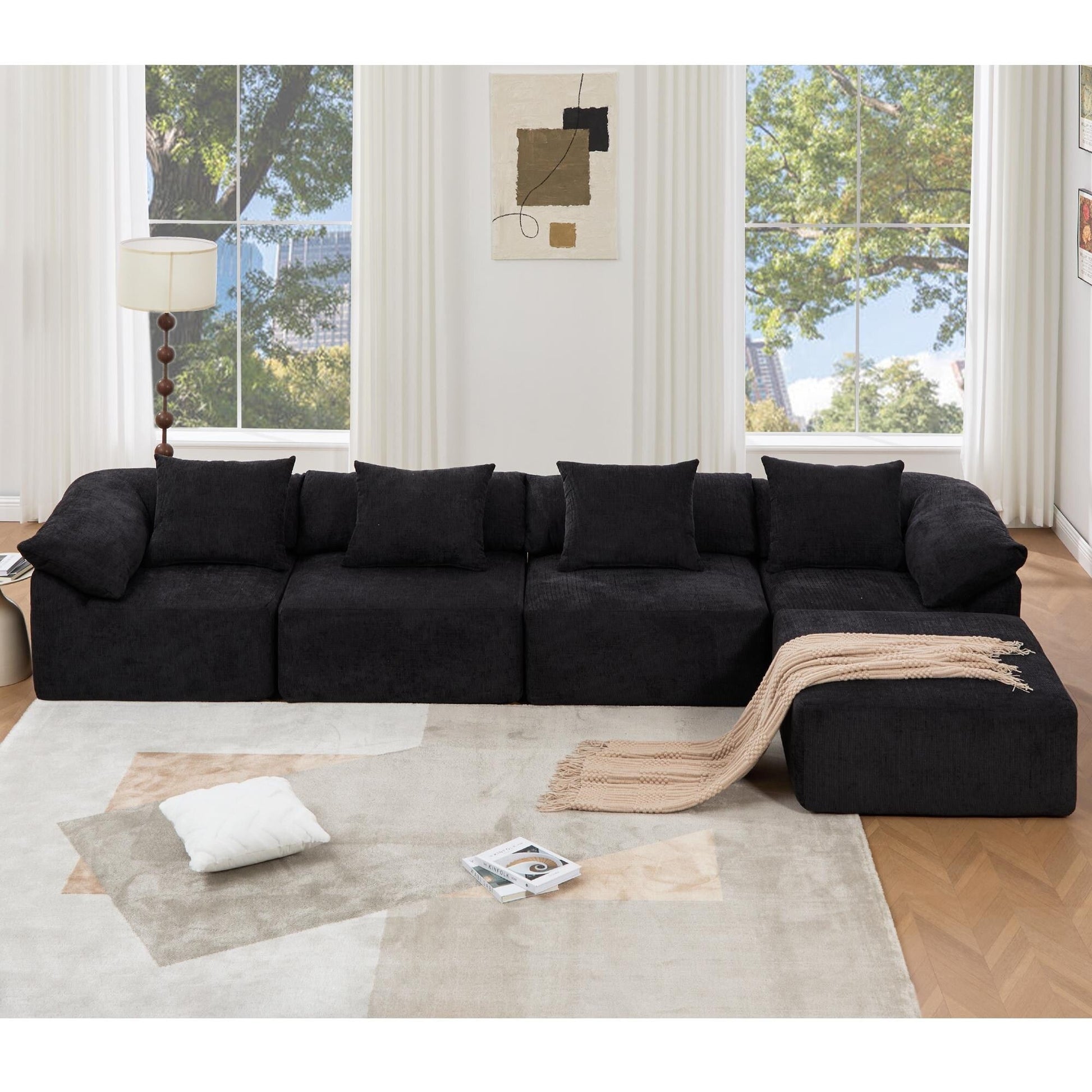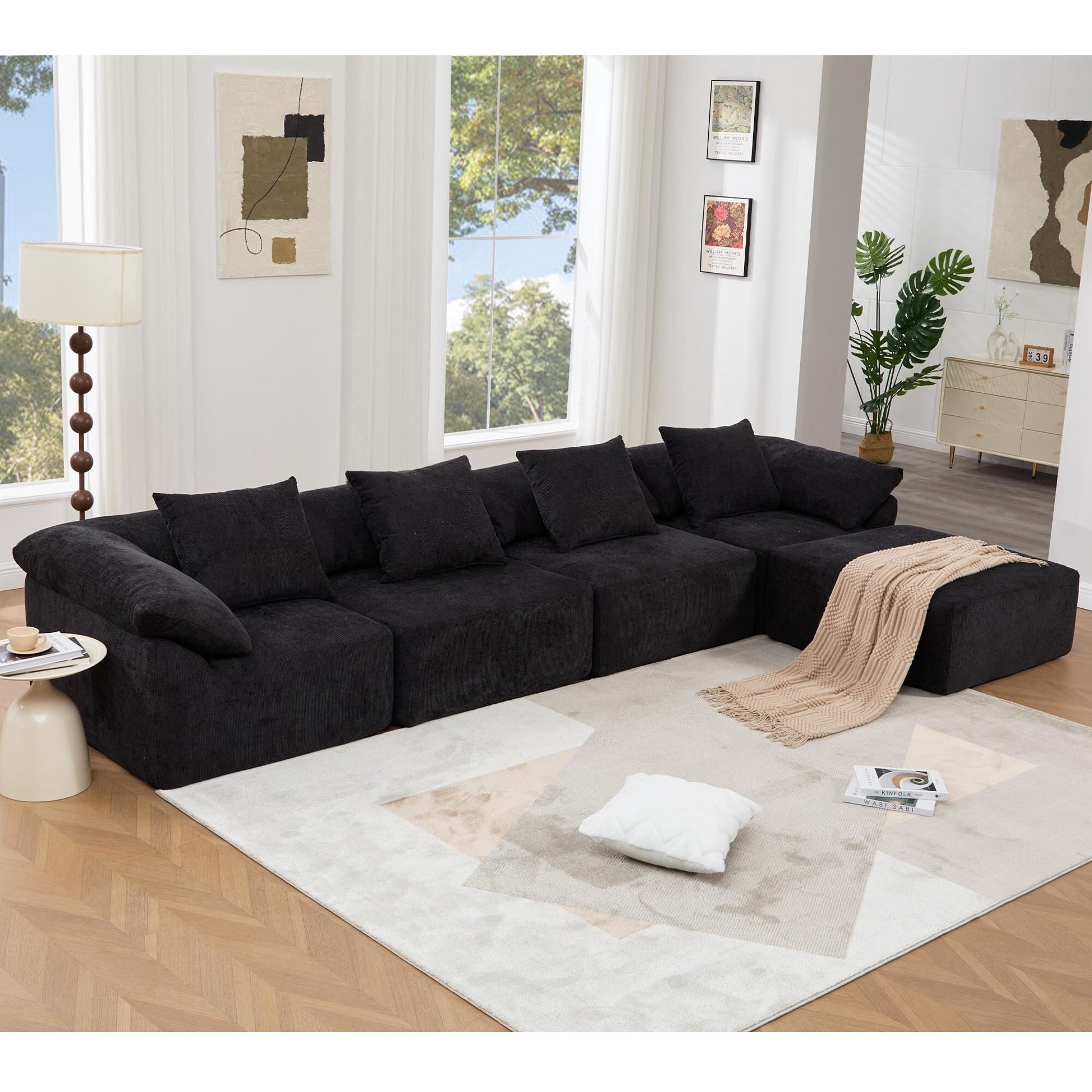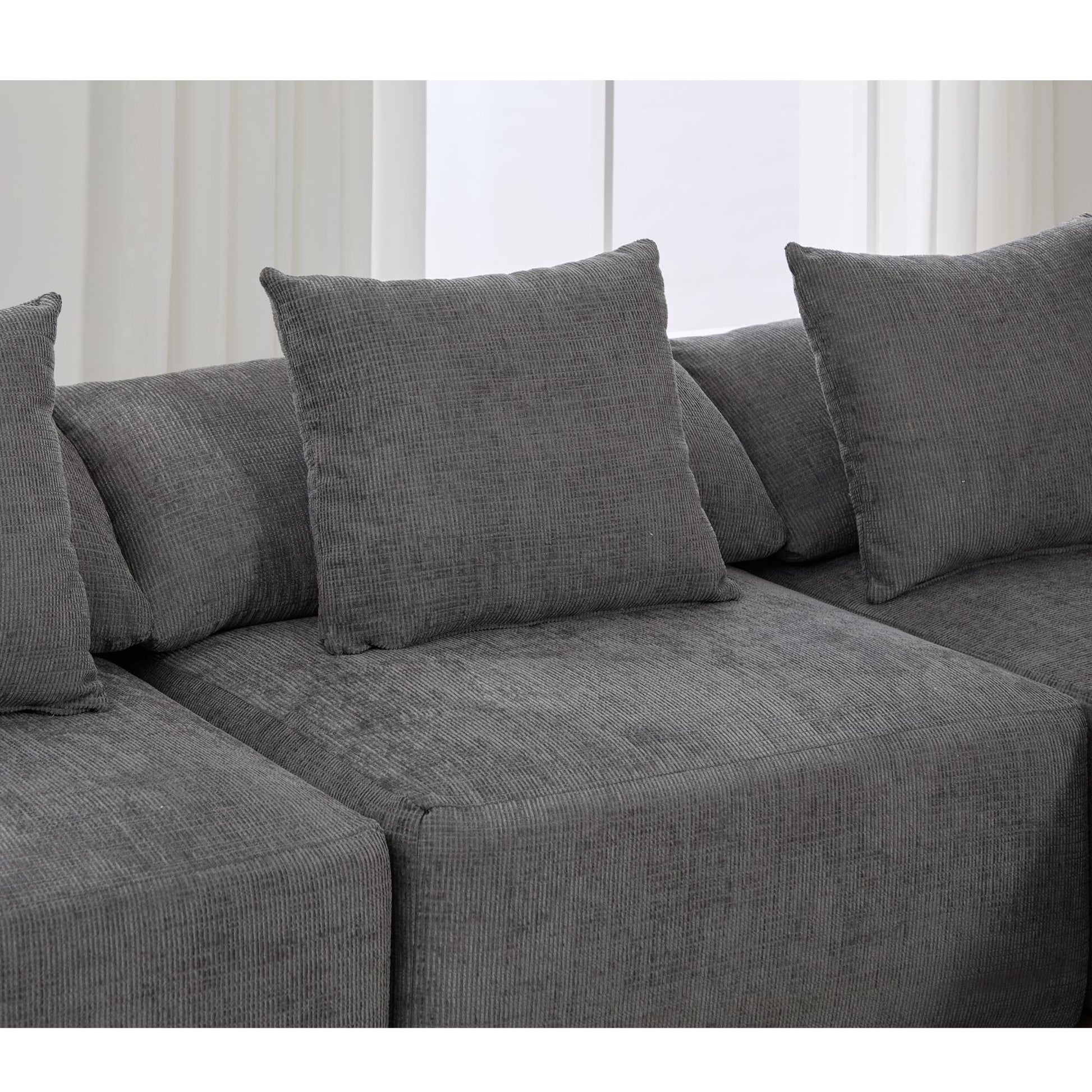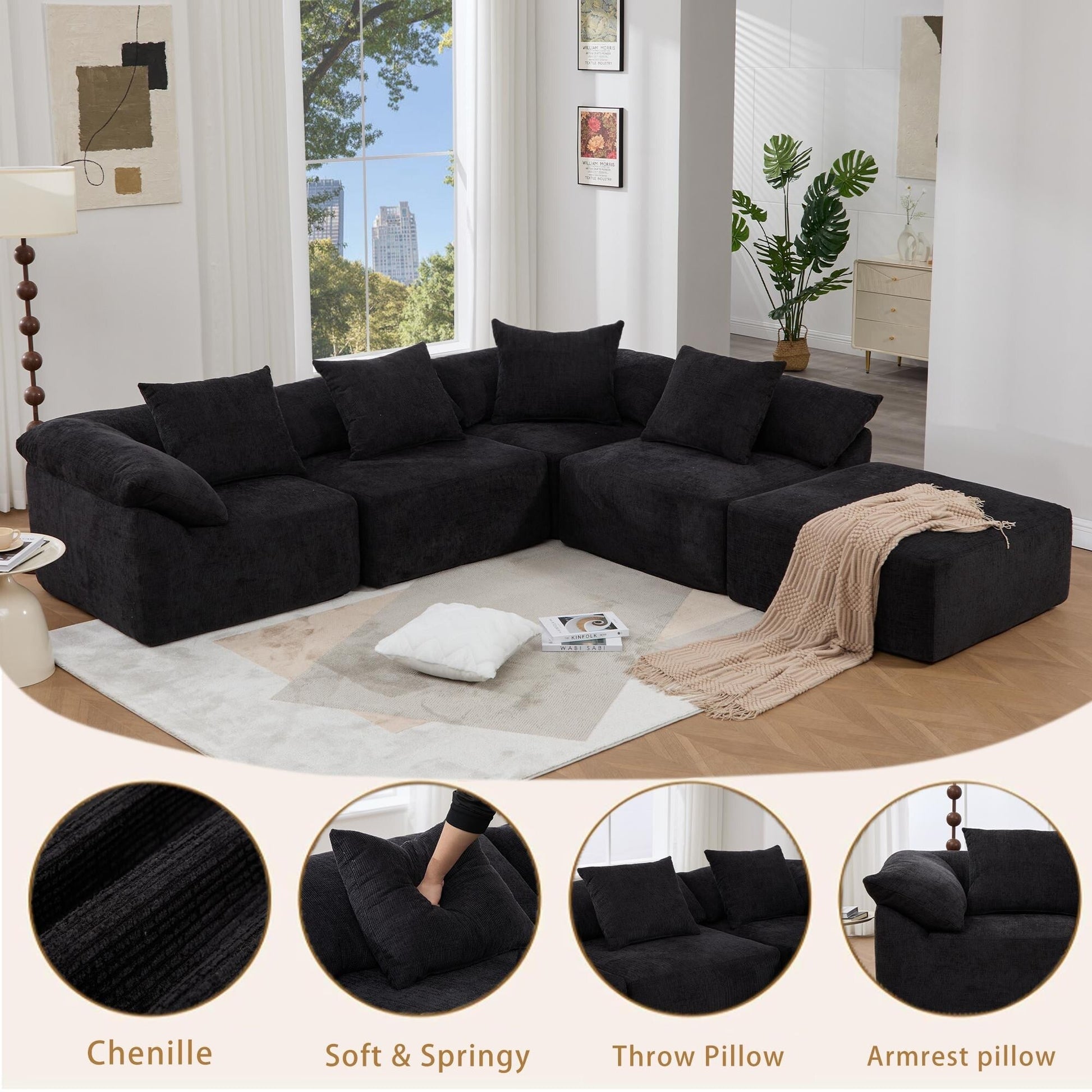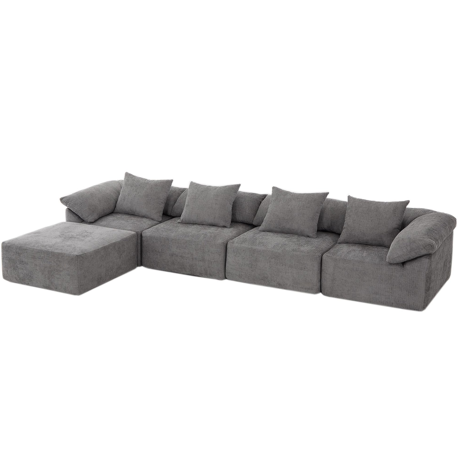 - Ce canapé modulable 5 places est doté d'un tissu chenille moelleux, de coussins en mousse haute résilience et d'une conception sans pieds pour une allure moderne. Modulable en plusieurs configurations, y compris en canapé-lit, il offre confort et flexibilité pour les salons et les espaces détente.
