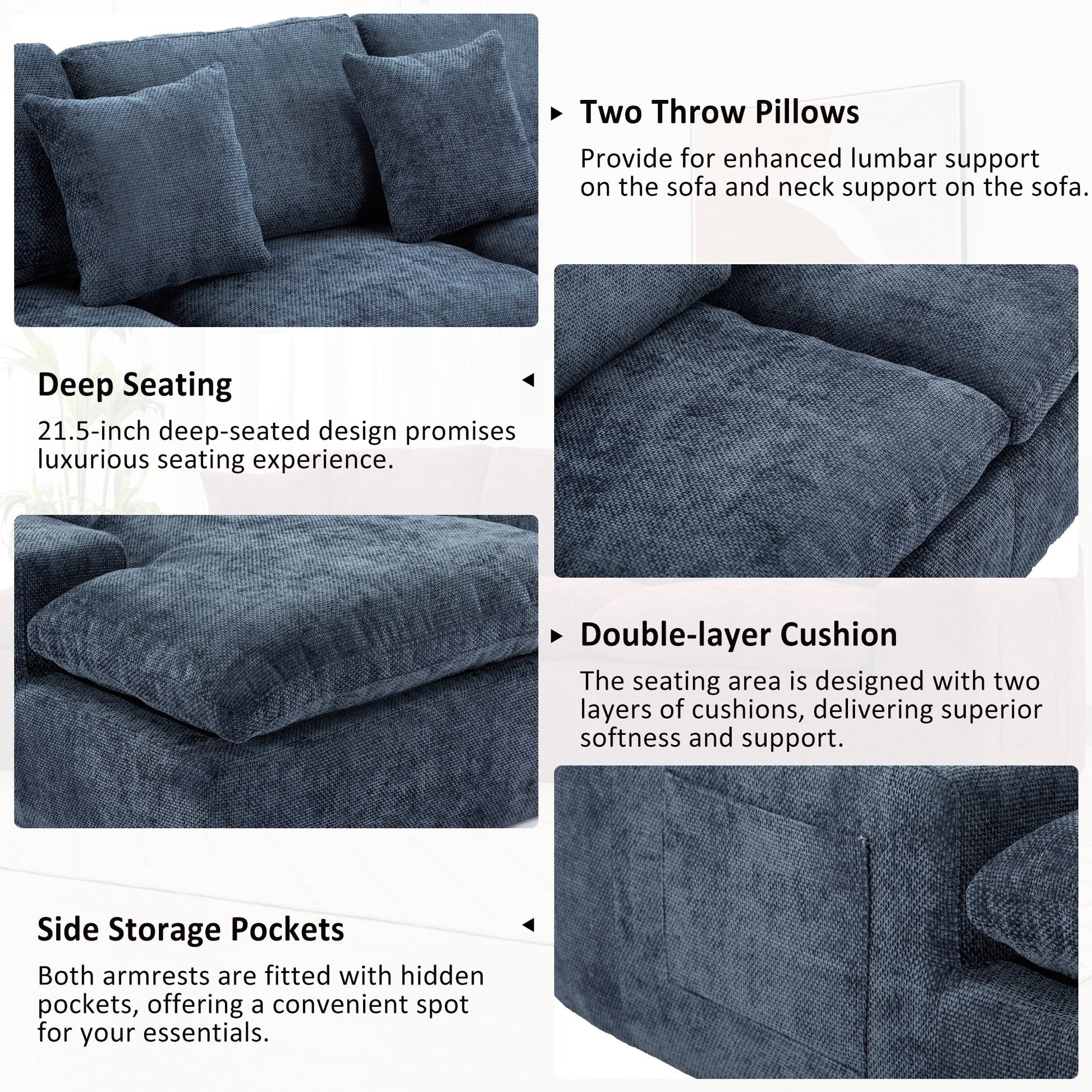 - Assise profonde : la profondeur d'assise de 21,5 pouces invite à se détendre et à faire la sieste.