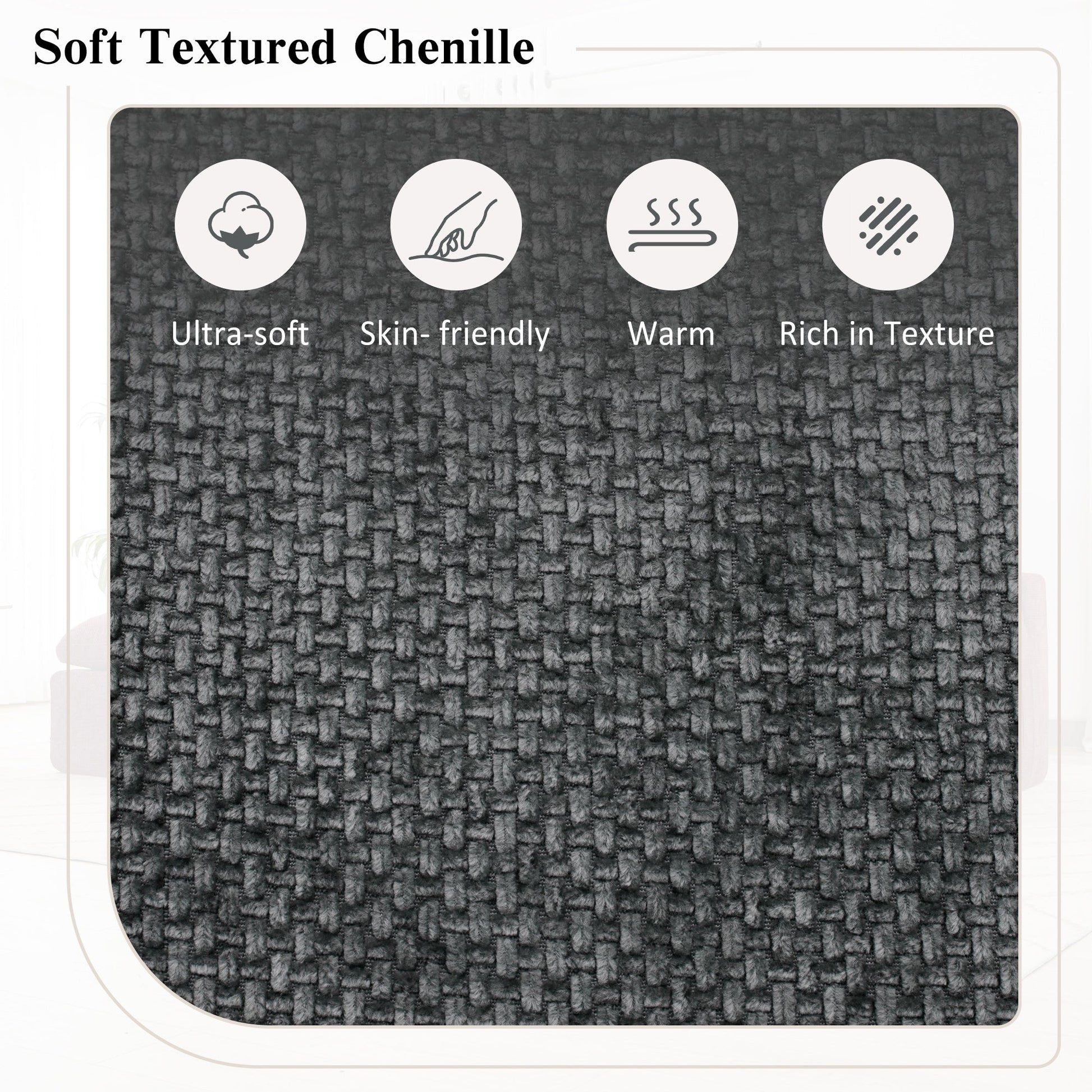 - Revêtement en chenille : tissu doux et durable avec un éclat subtil et une sensation texturée.