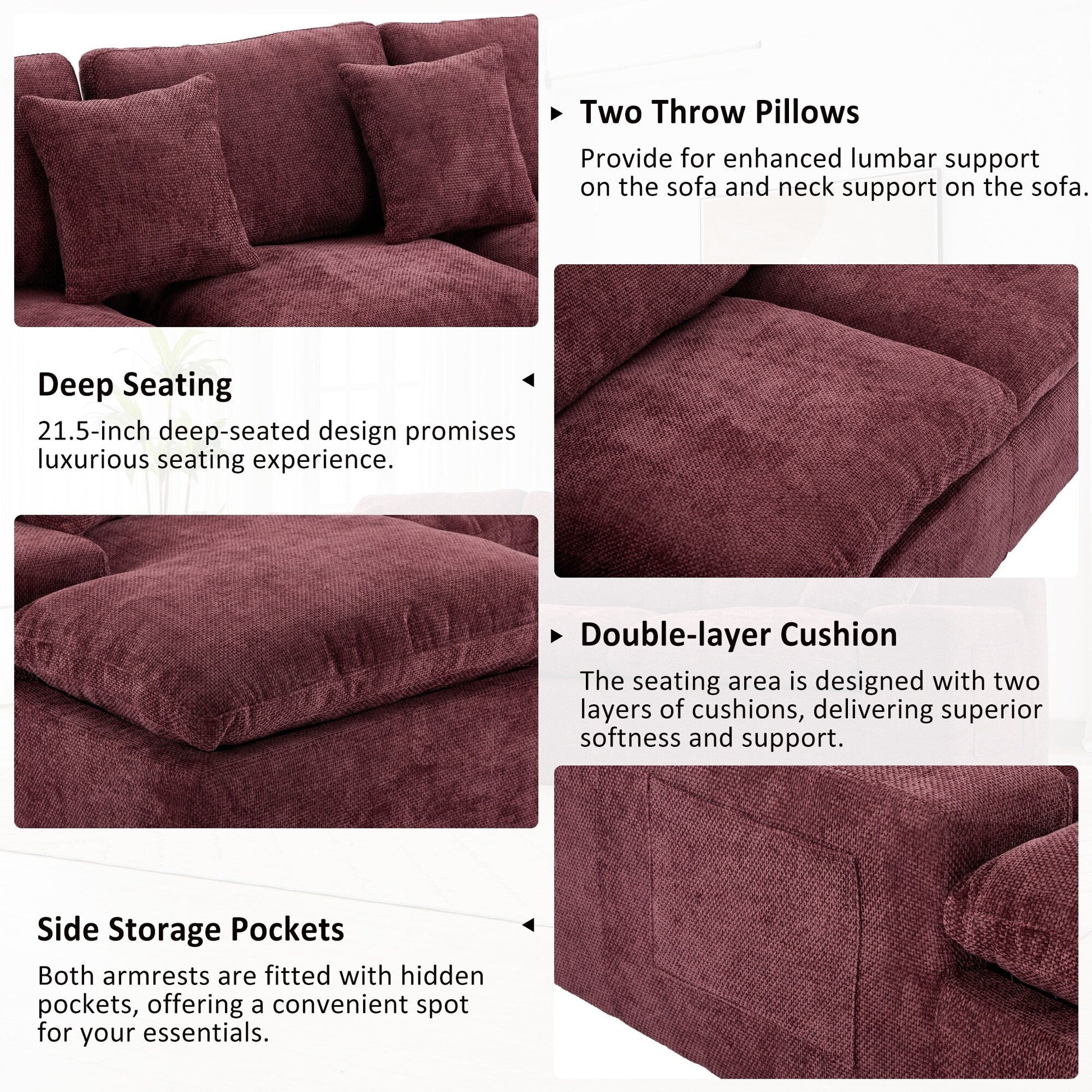 - Coussins à double couche : couche supérieure en mousse souple avec base de soutien pour un confort durable.