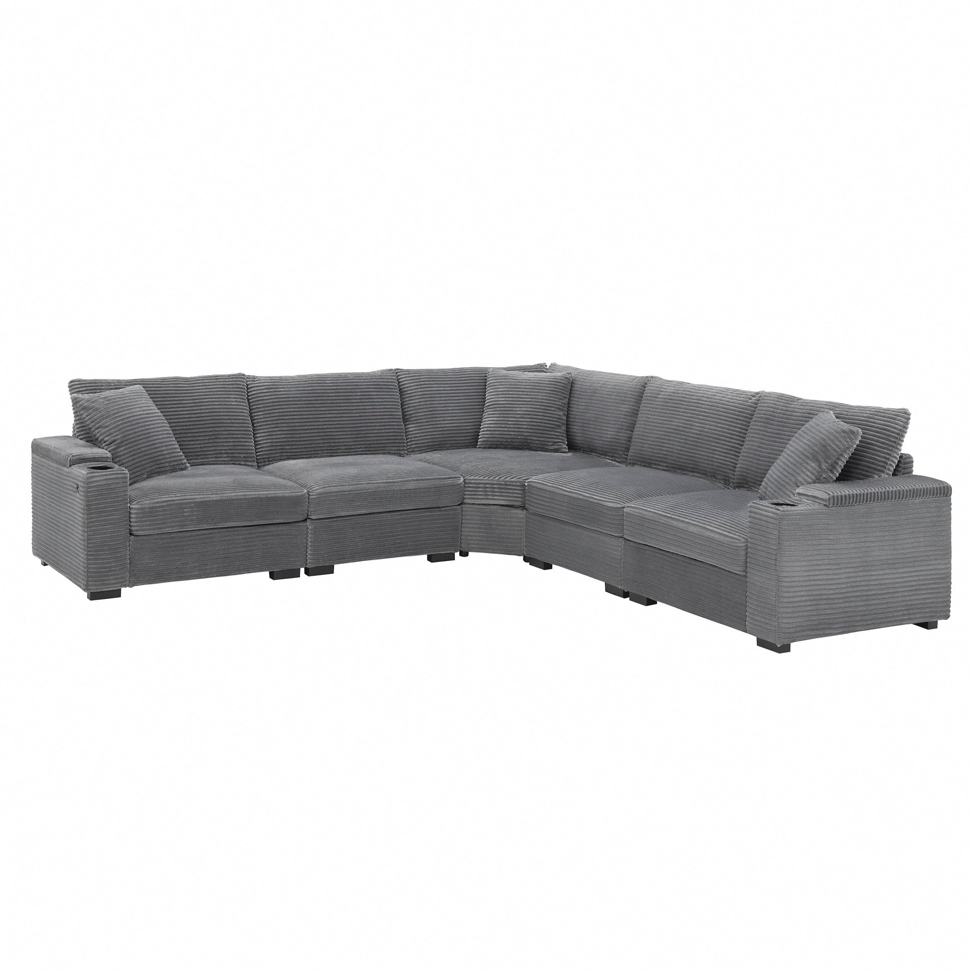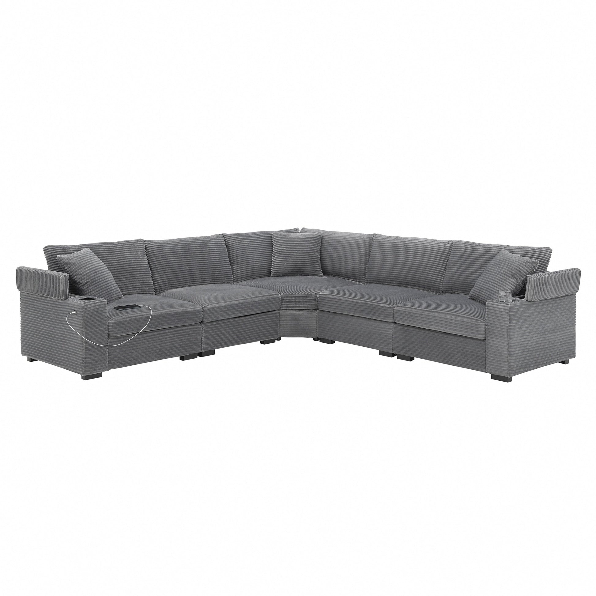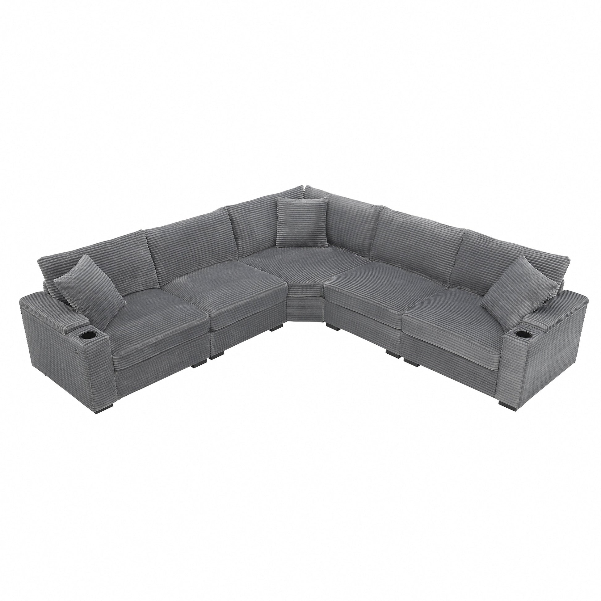 - Ce canapé modulable 5 places en velours côtelé allie confort et praticité grâce à son accoudoir dissimulé, ses porte-gobelets intégrés et ses ports USB. Sa disposition en L s'adapte à tous les espaces, tandis que son tissu côtelé doux apporte une touche cosy et élégante à tout salon ou appartement.