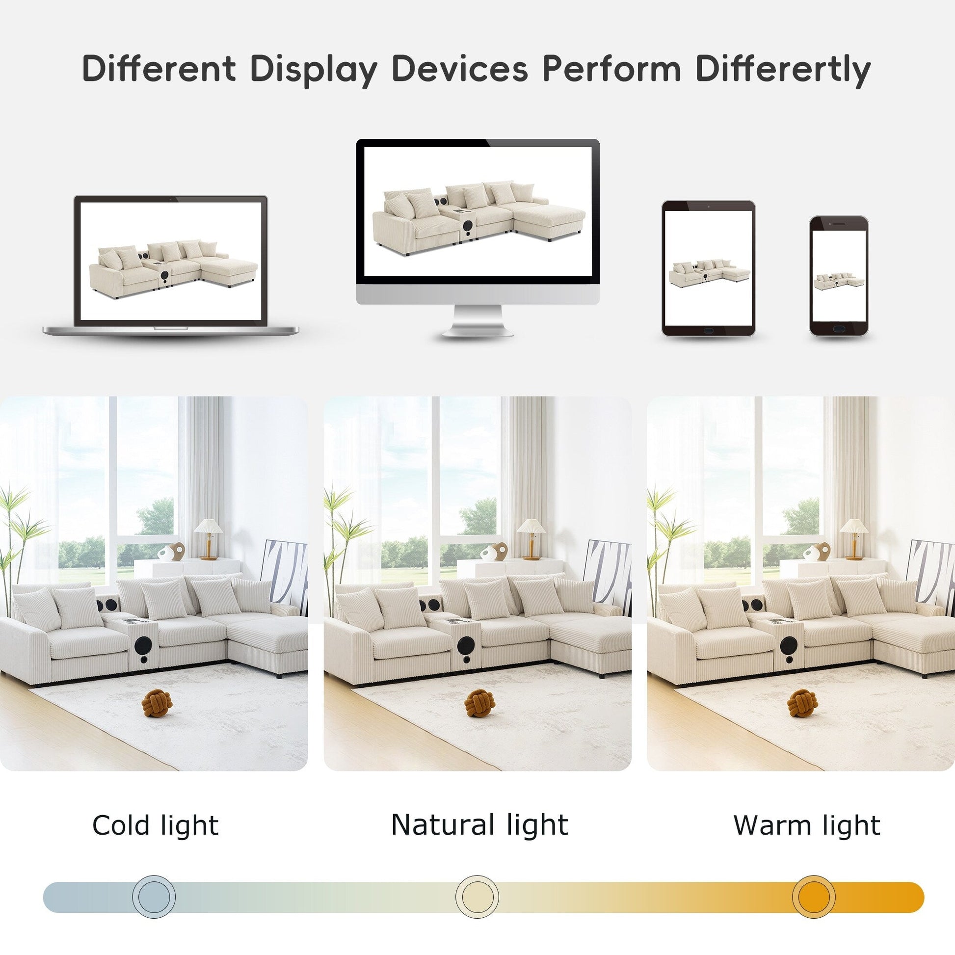 - Ce canapé d'angle modulable en velours côtelé allie confort et fonctionnalités astucieuses pour un style de vie moderne. Avec ses porte-gobelets intégrés, ses rangements, ses enceintes Bluetooth et sa recharge filaire et sans fil, il est un ajout confortable et technologique à tout salon ou appartement.