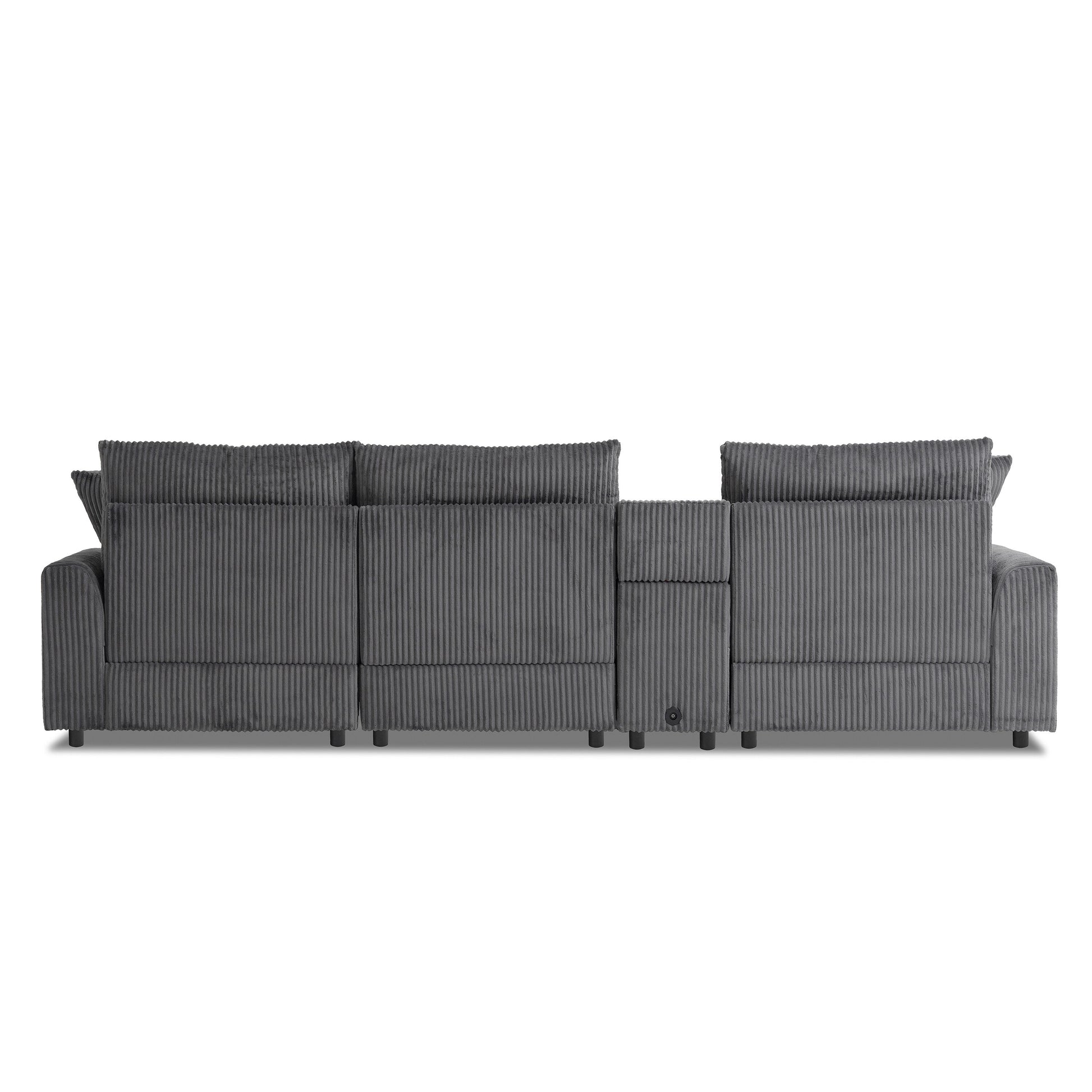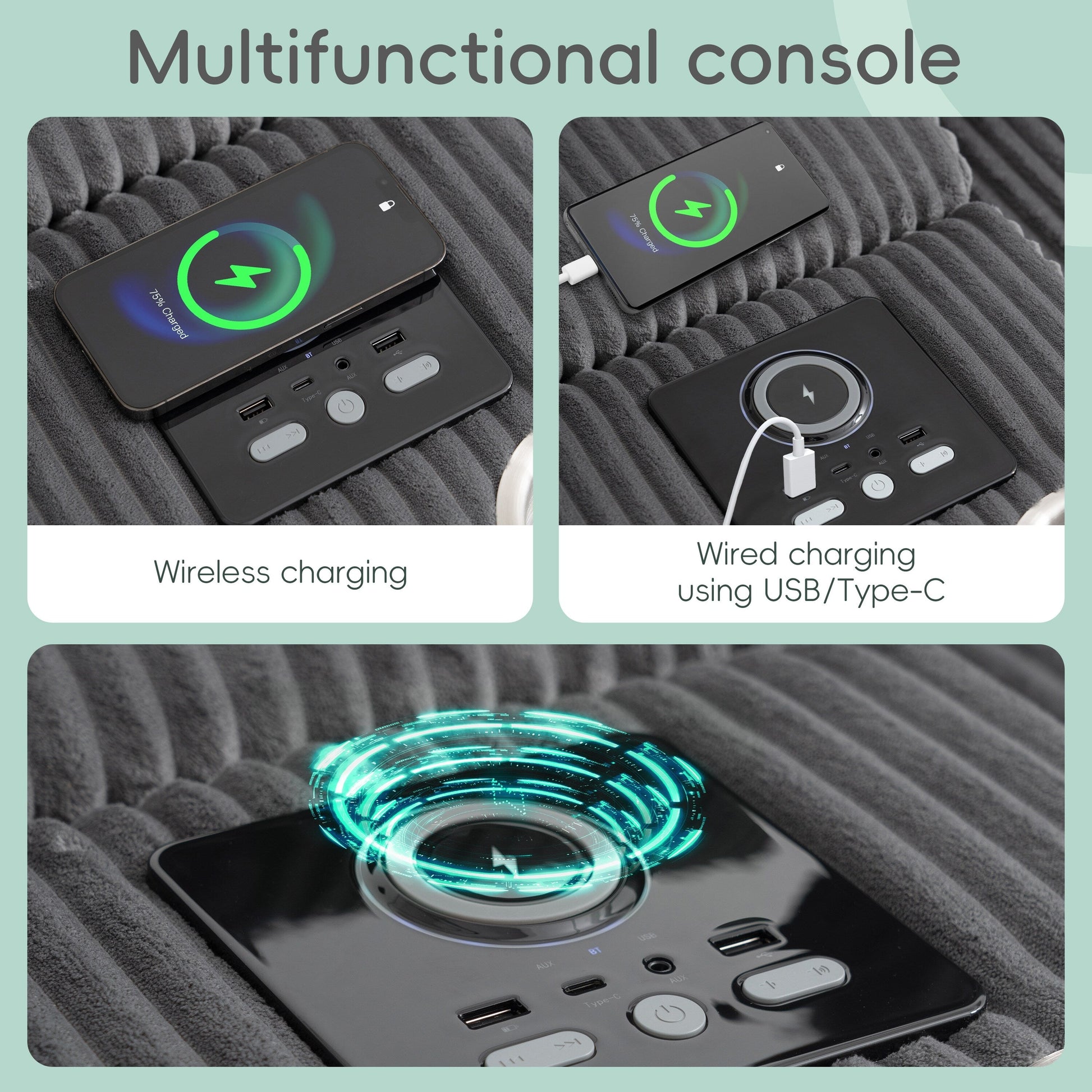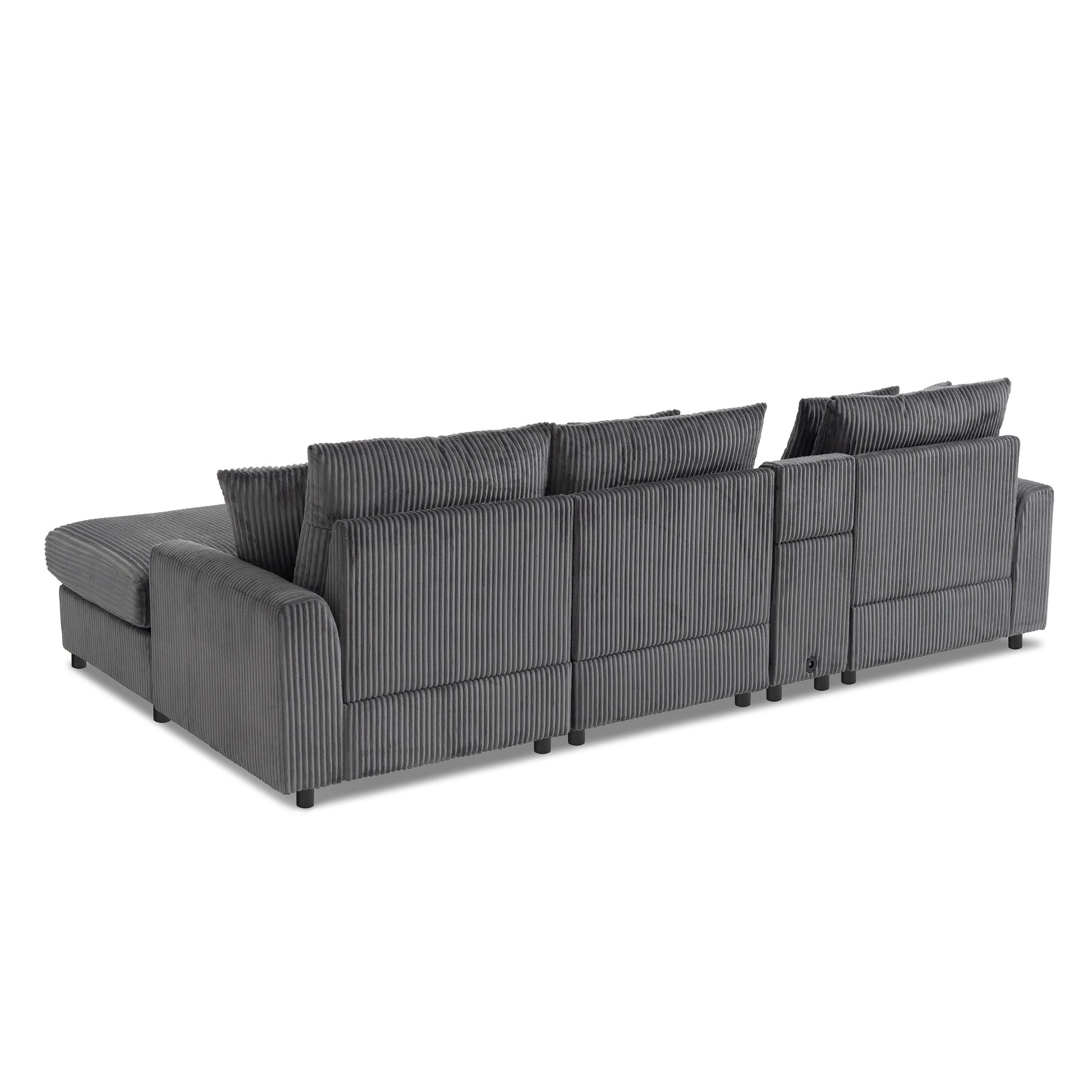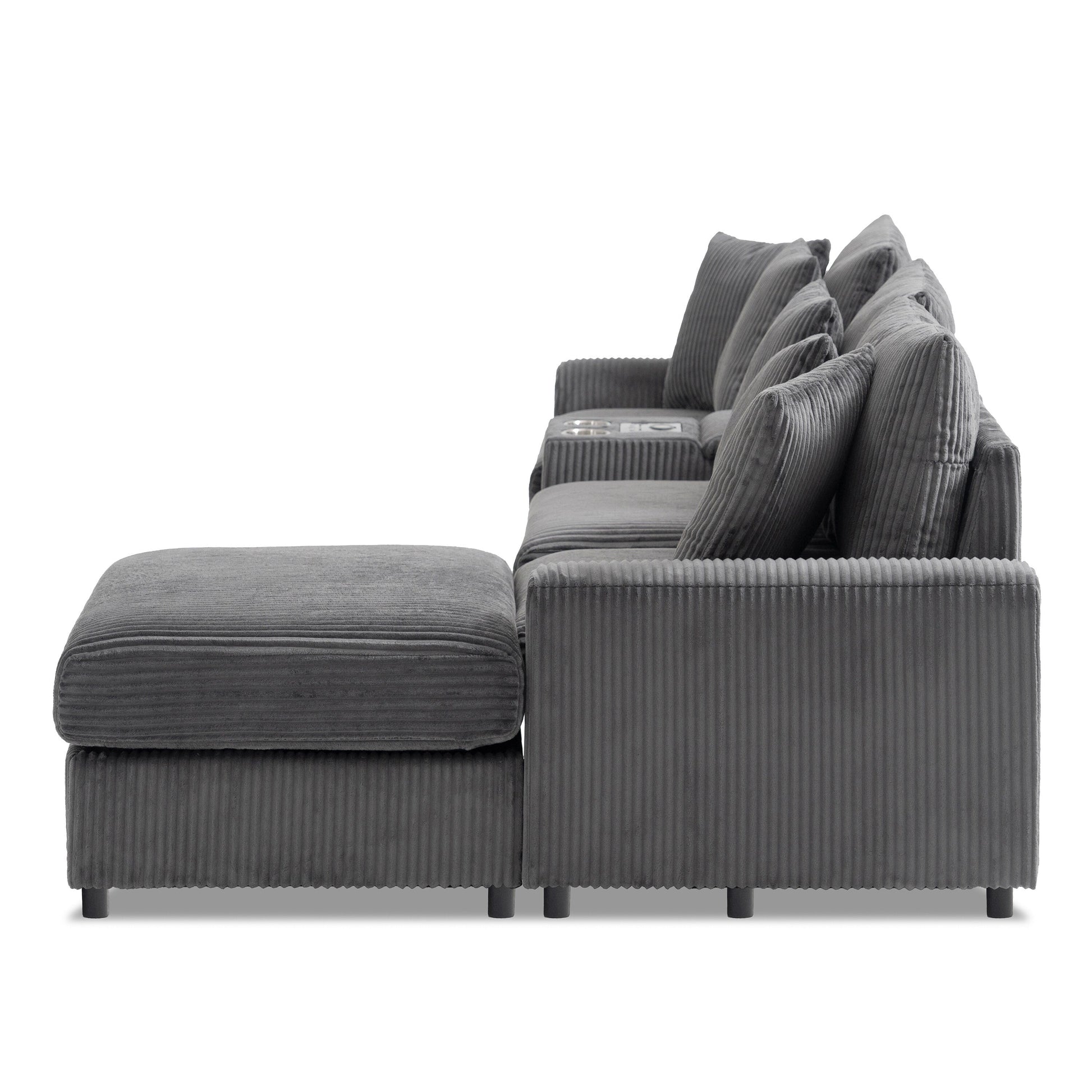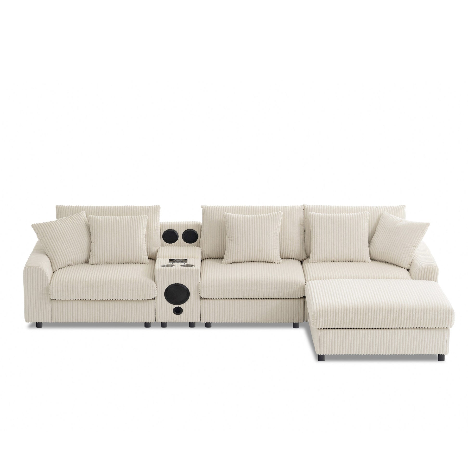 Canapé d'angle modulaire en velours côtelé avec haut-parleurs Bluetooth, ports de charge, porte-gobelets, rangement et pouf pour le salon