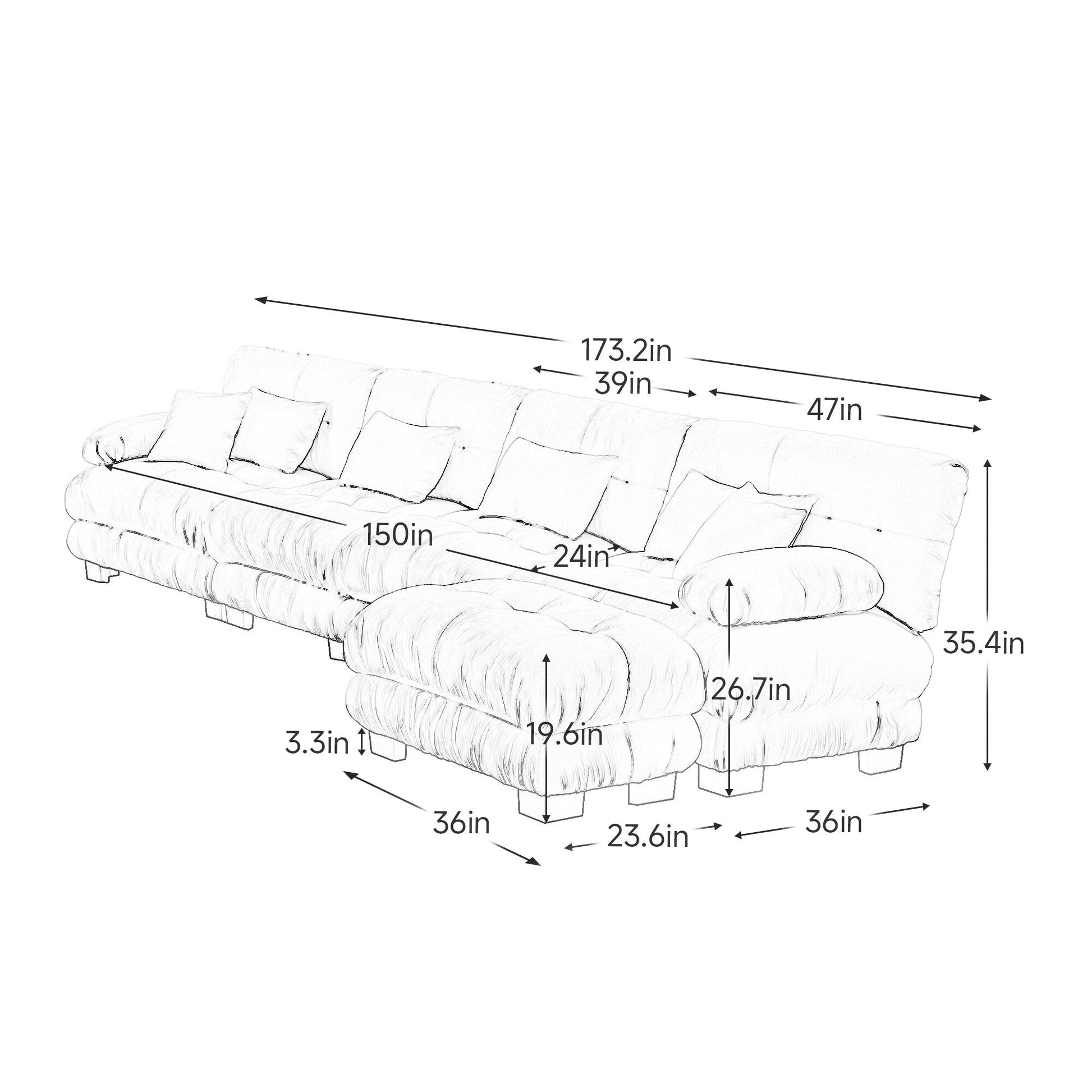 - Dimensions hors tout : 173,2 pi L x 59,6 pi P x 35,4 pi H