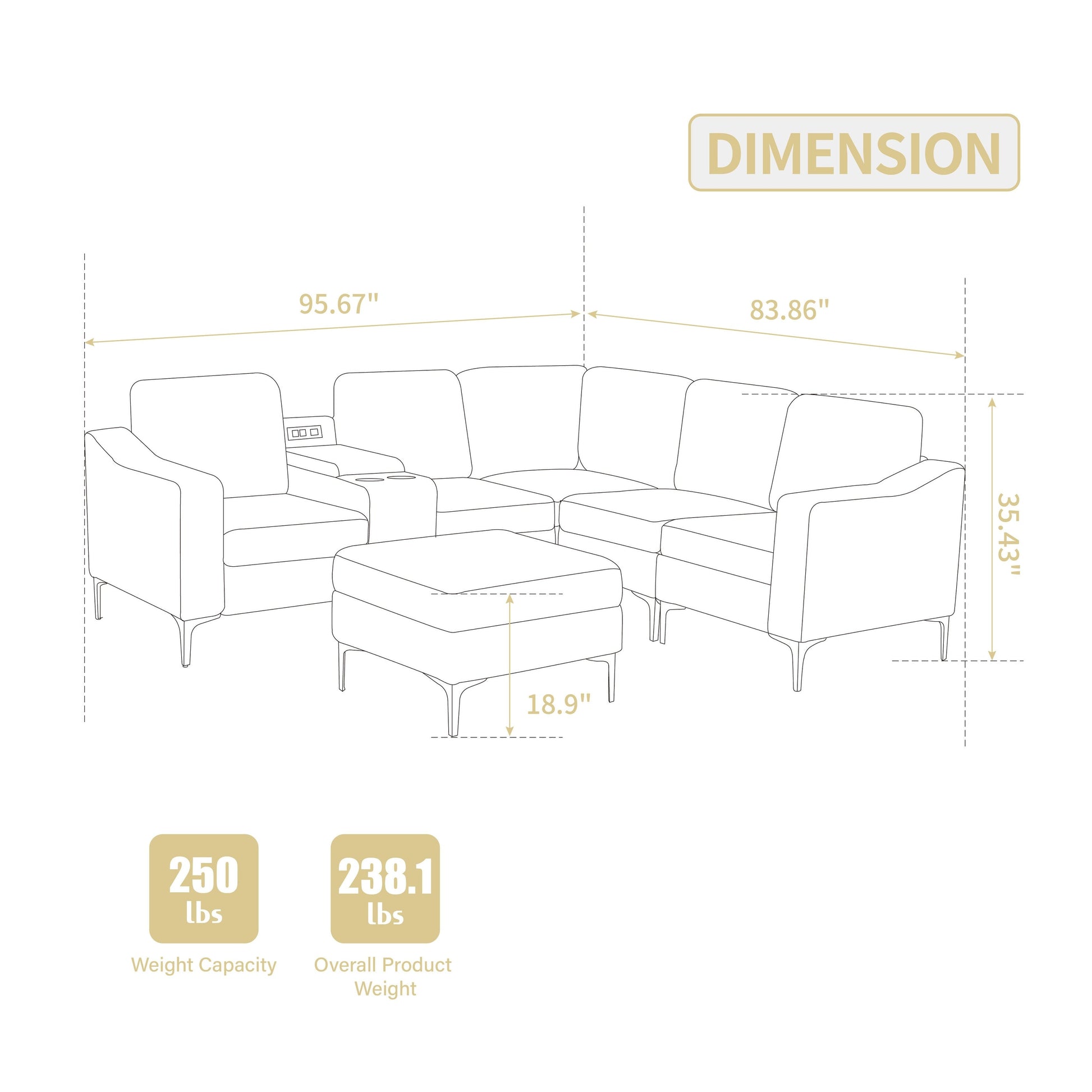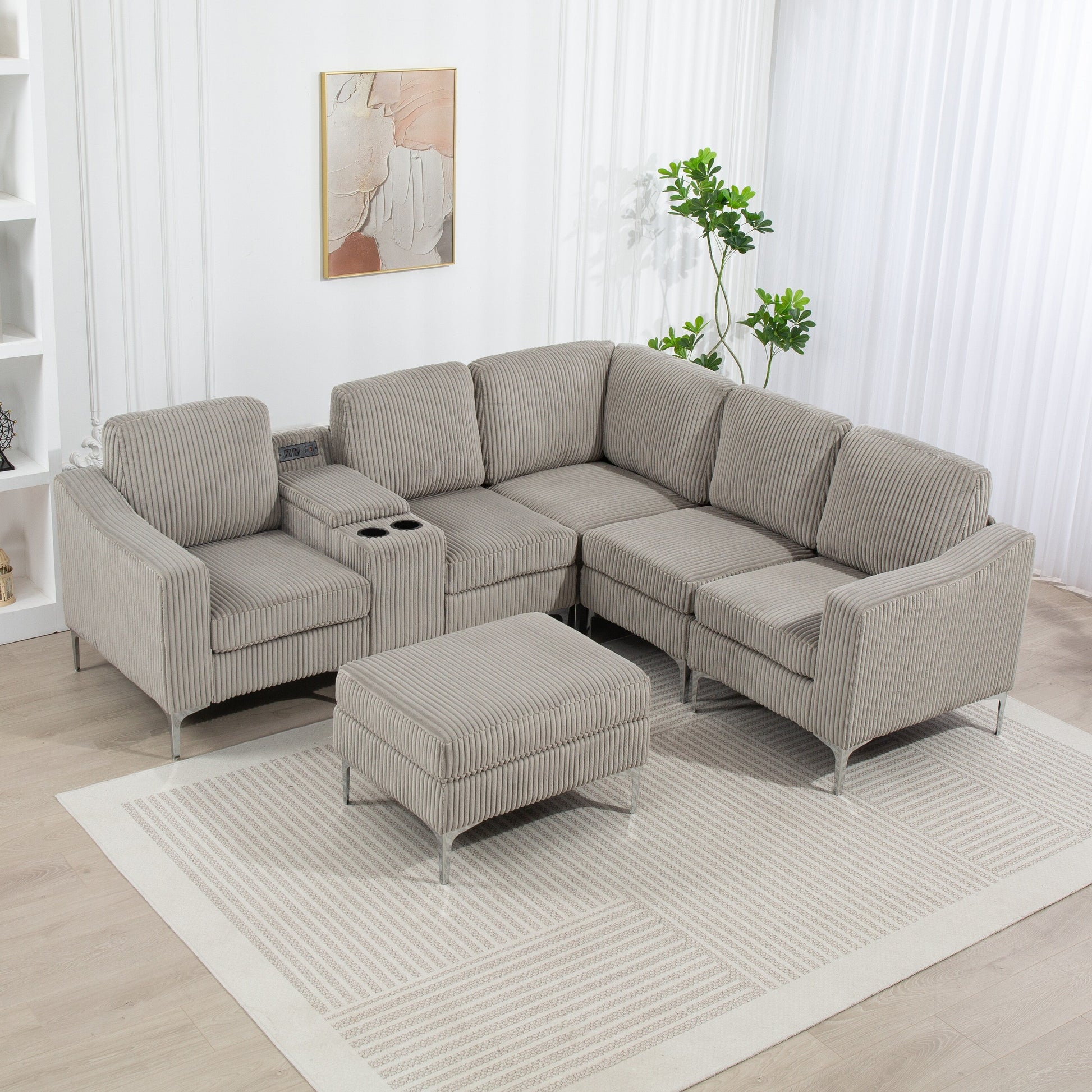 - Ce canapé d'angle modulaire en velours côtelé en forme de L allie une structure en bois robuste à une conception flexible. Il est doté d'une disposition réversible, d'un pouf de rangement convertible, de porte-gobelets intégrés et de ports de charge USB, offrant un confort et une praticité adaptables au salon comme à l'appartement.
