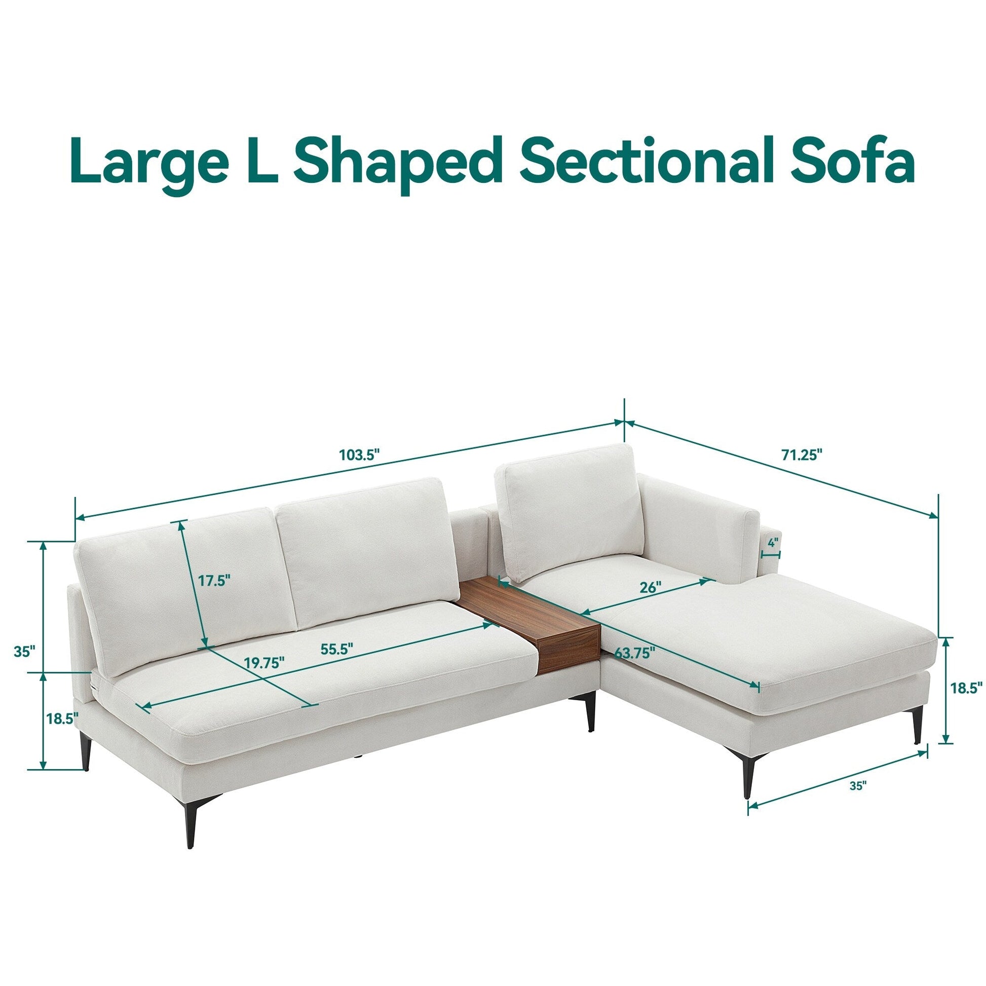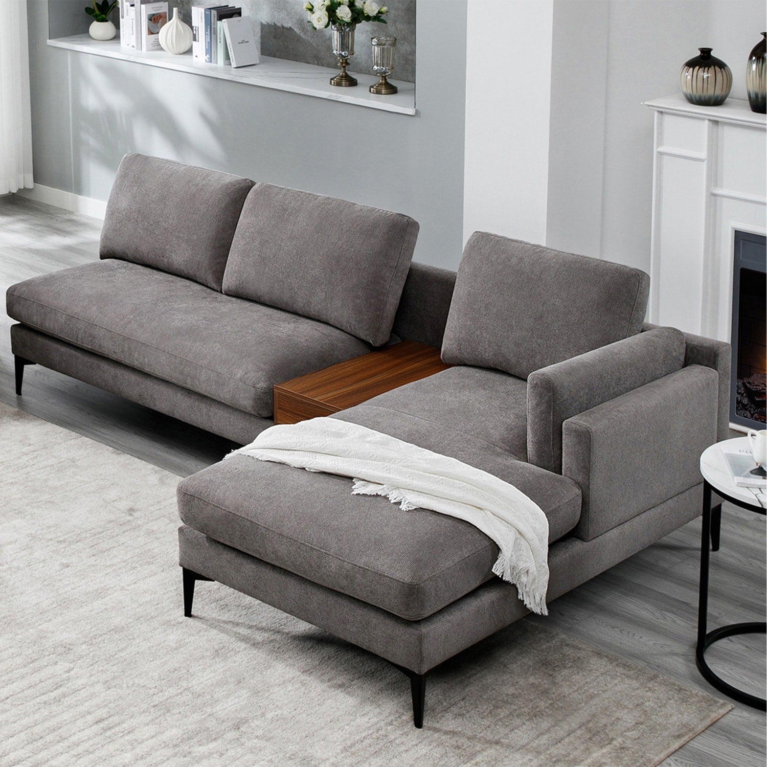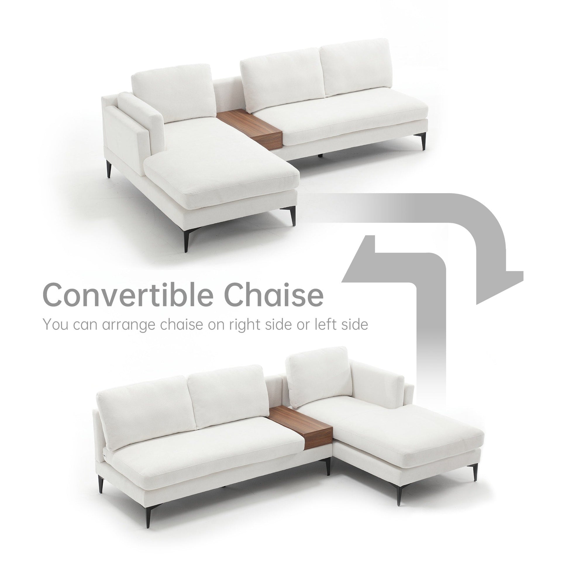 Canapé modulable en L avec un design réversible et un coffre décoratif en bois intégré