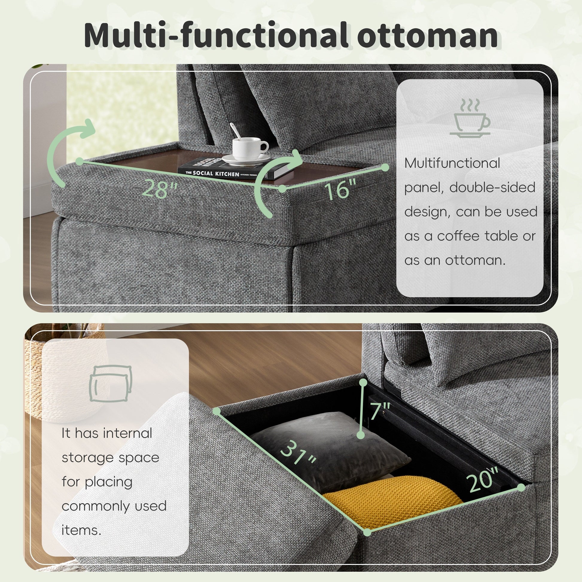 - Pouf de rangement à double usage : peut servir de siège supplémentaire ou de table, avec un rangement caché à l'intérieur.
