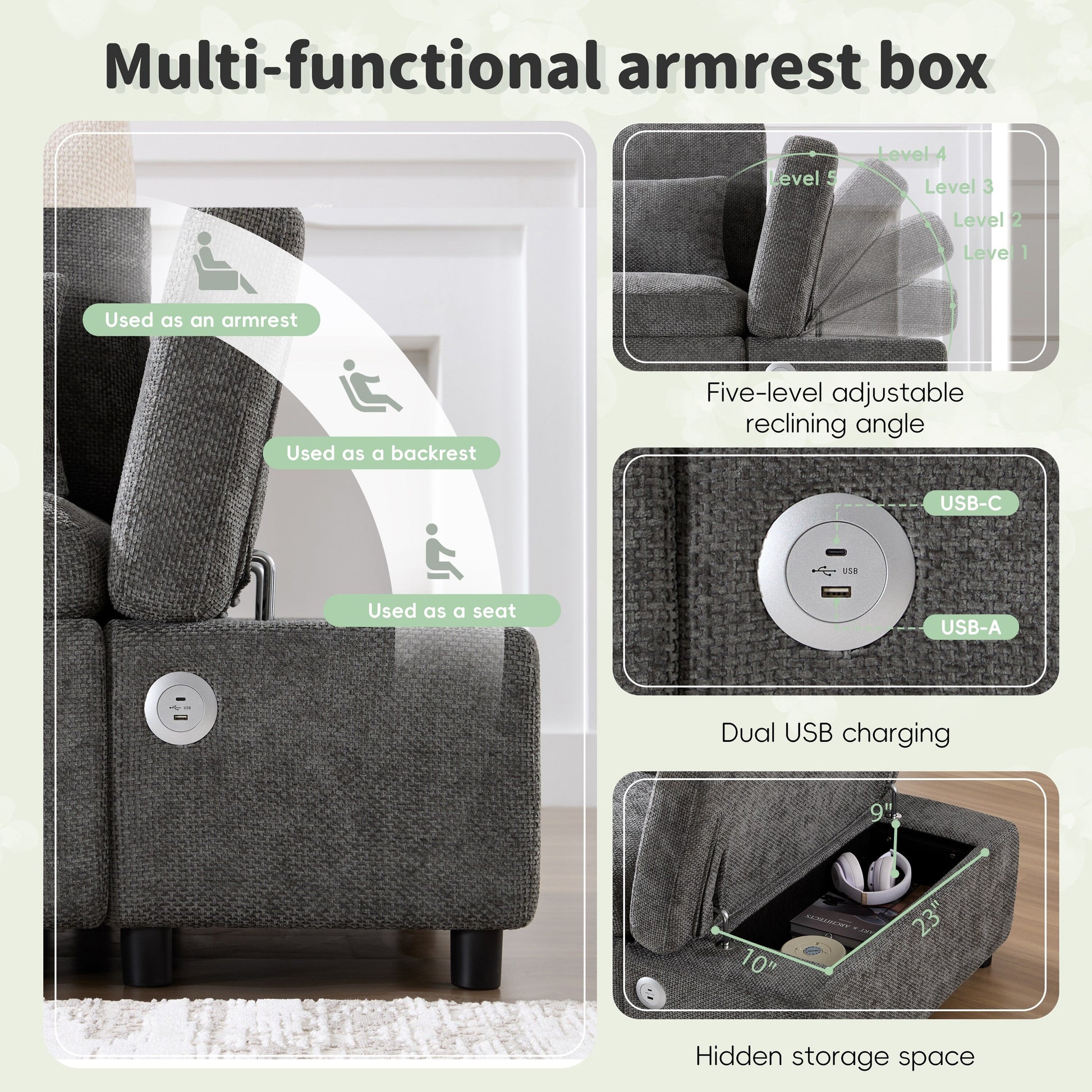 - Accoudoir de chargement réglable : l'accoudoir s'ajuste à 5 angles et comprend des ports USB et Type-C.