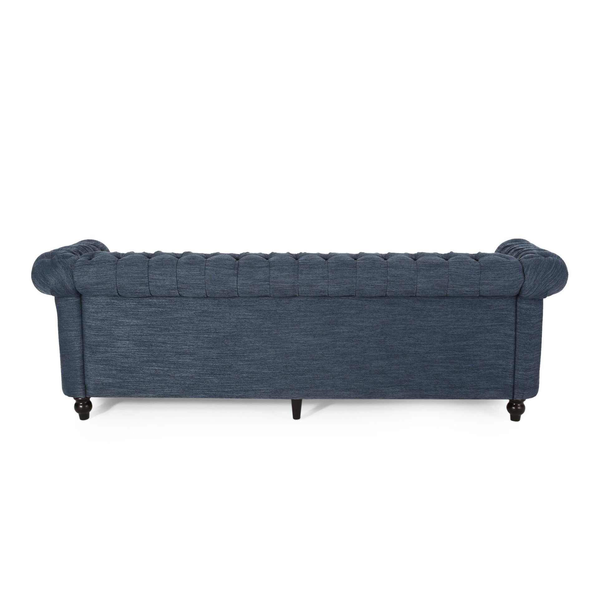 Canapé 3 places Chesterfield bleu marine 84,75, capitonné, avec clous et pieds en bois