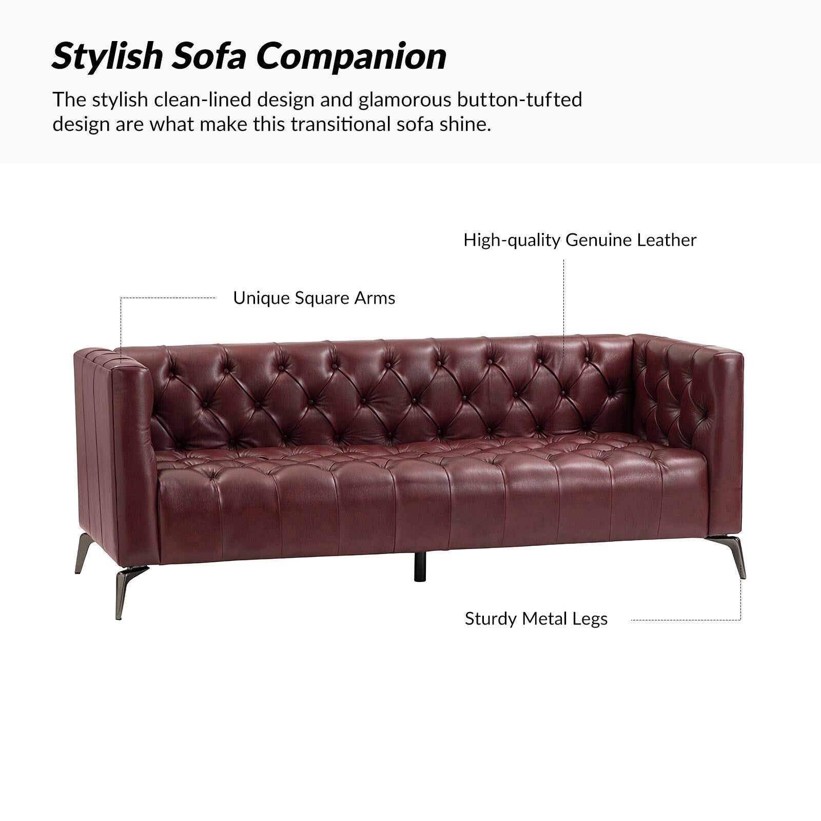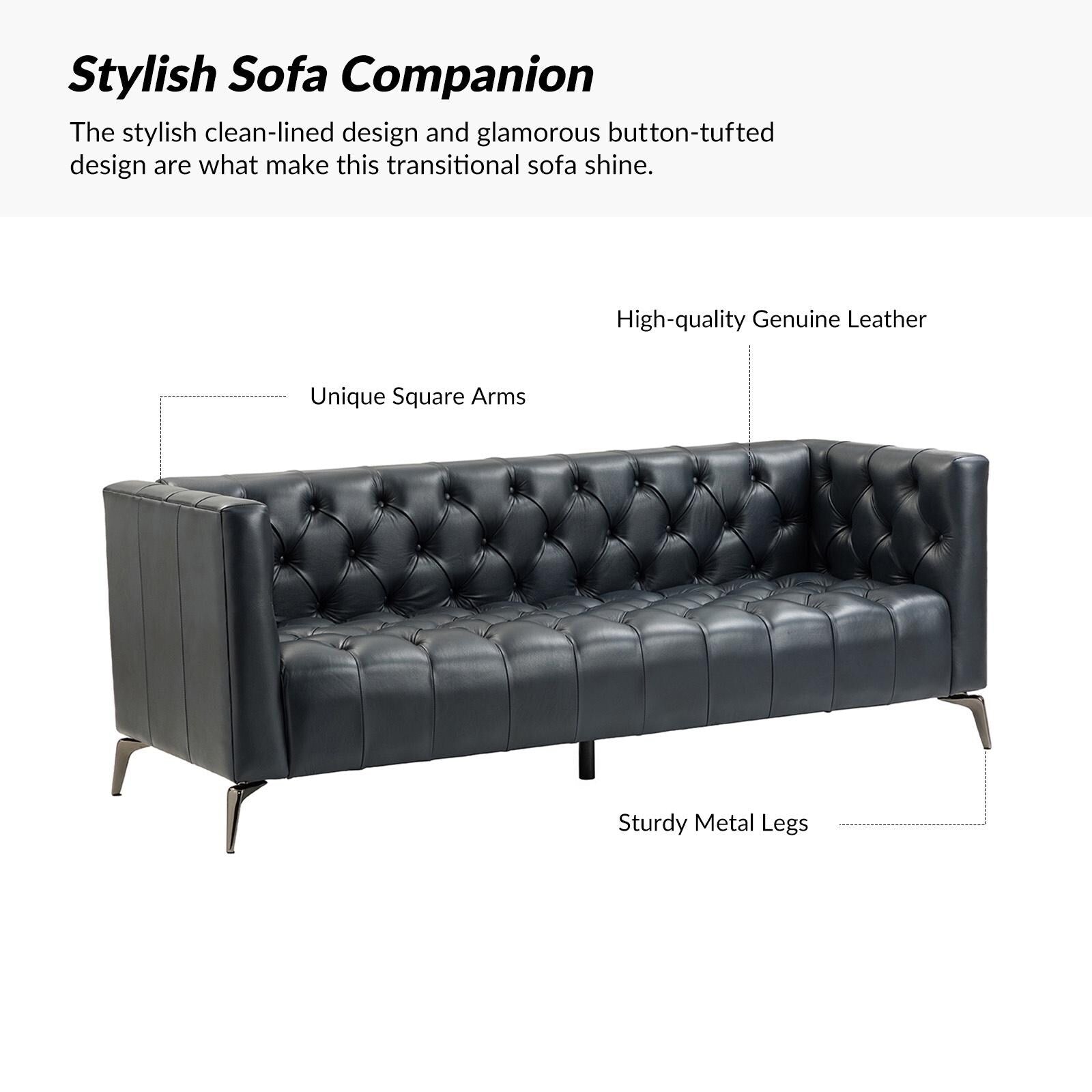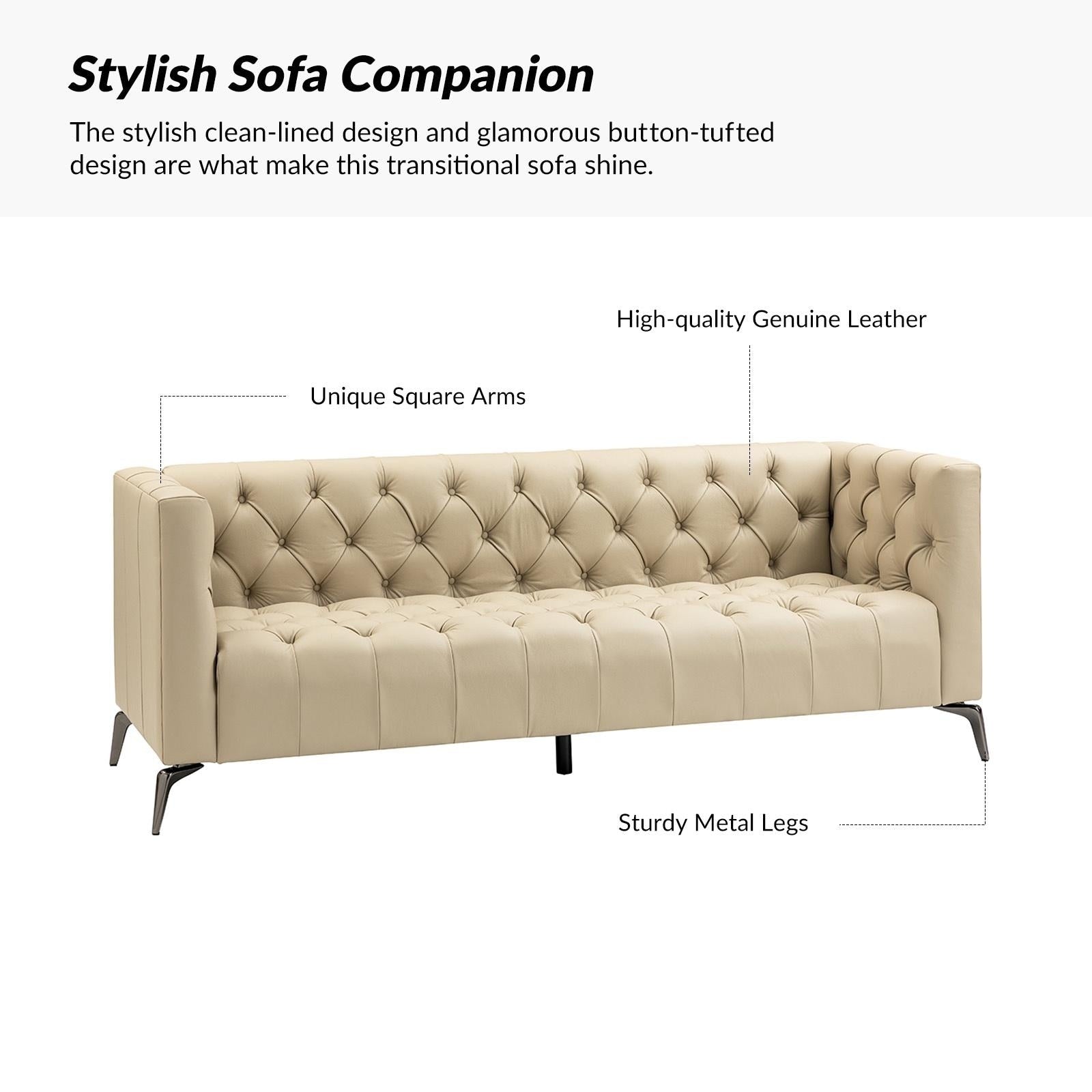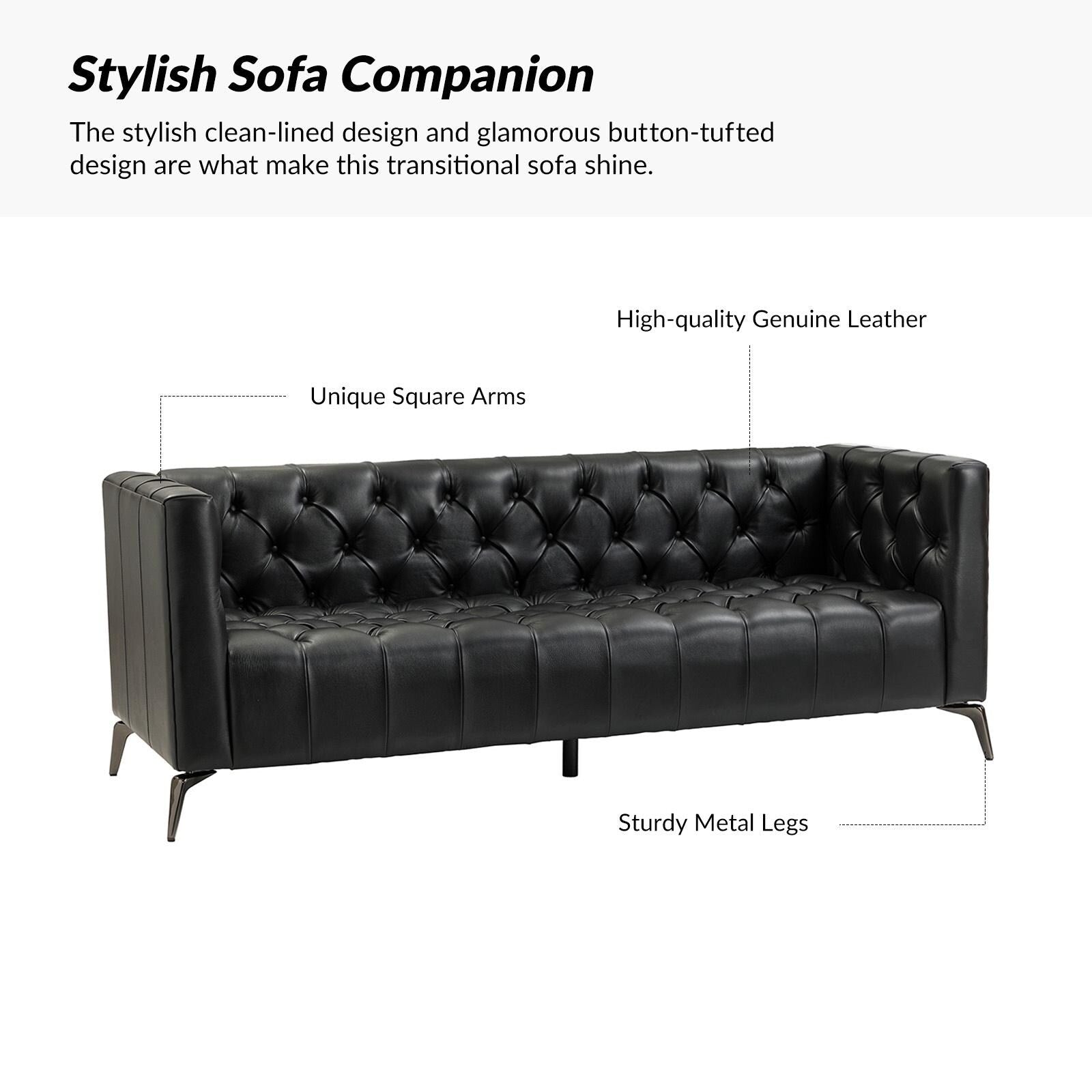 Canapé transitionnel Nestor en cuir véritable avec pieds en métal et dossier capitonné