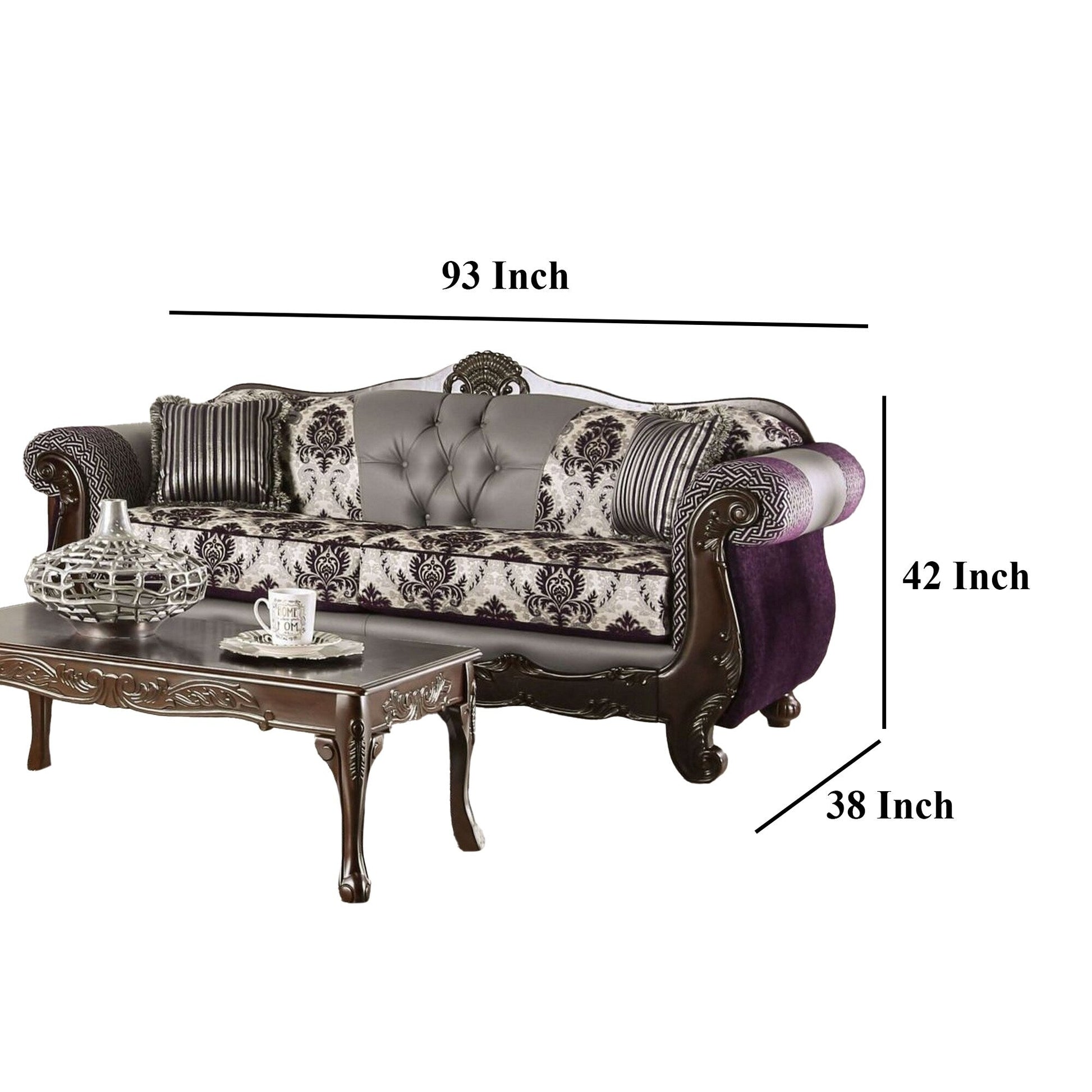 Ce canapé élégant allie parfaitement style et confort. Doté d'un design bicolore, son tissu chenille violet est agrémenté d'un panneau en similicuir gris uni capitonné. Ses accoudoirs roulés et ses détails en imitation bois sculpté apportent sophistication et élégance à n'importe quelle pièce. Découvrez notre collection Nicola pour plus d'options.
