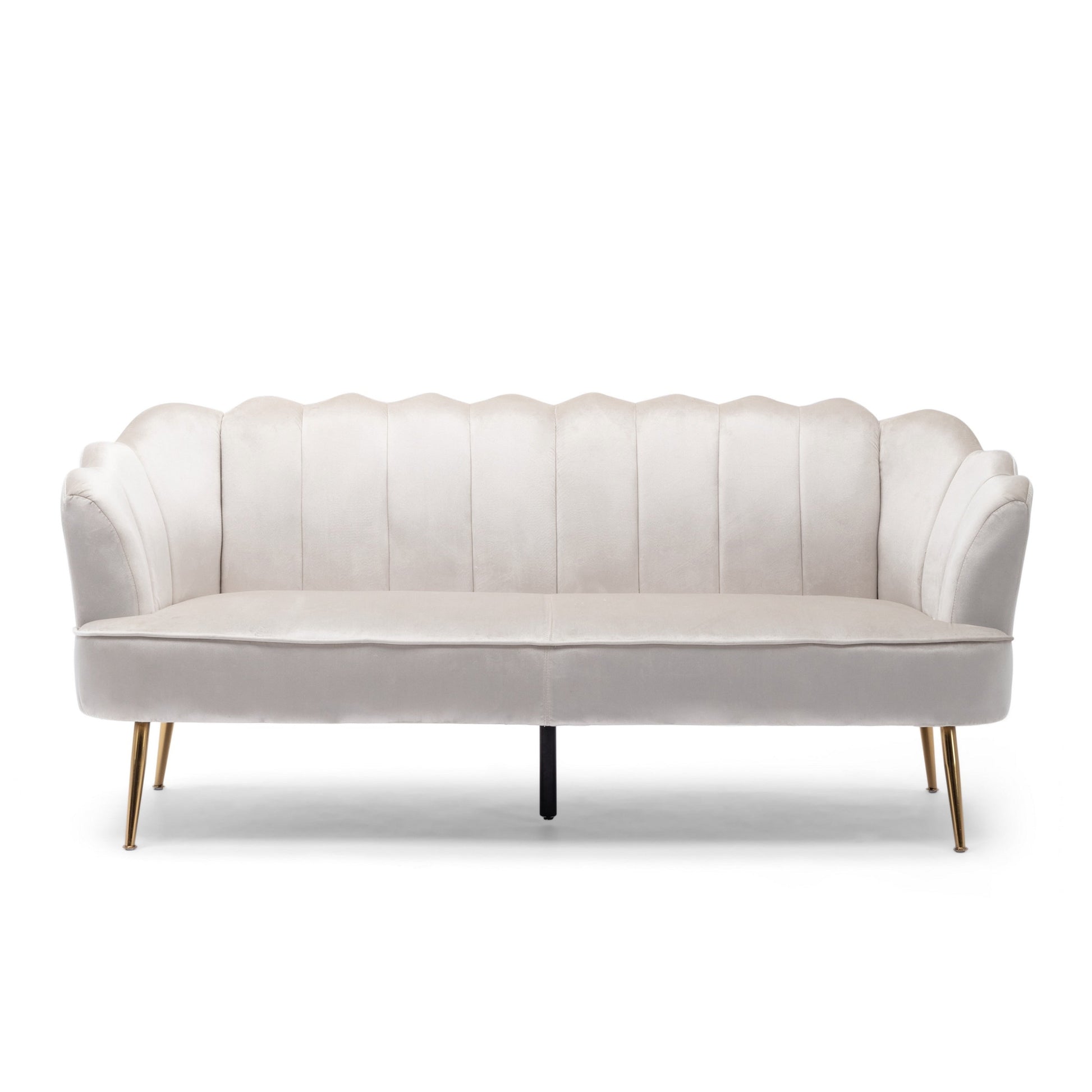 Relookez votre salon avec ce canapé trois places moderne au revêtement en velours beige pour un confort durable. Les coutures en U sur les accoudoirs et le dossier subliment la forme galbée de la coque. Il est soutenu par des pieds fuselés en métal finition dorée, garantissant une grande stabilité. Découvrez notre collection Nika pour plus d'options.
