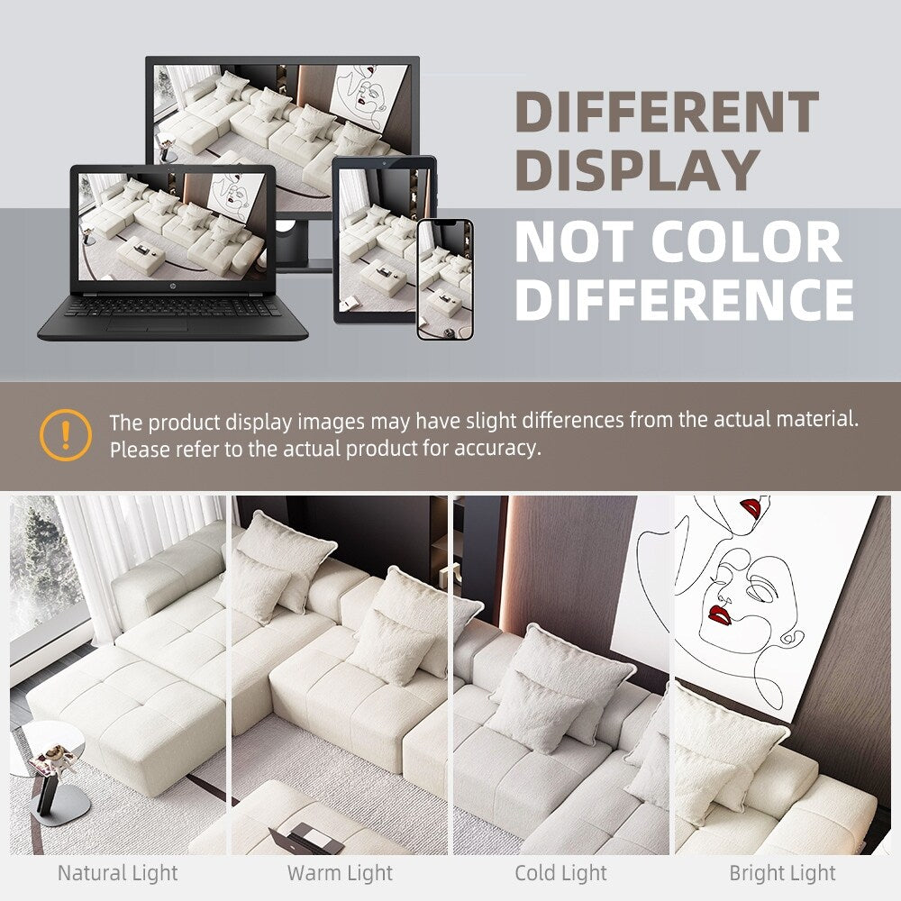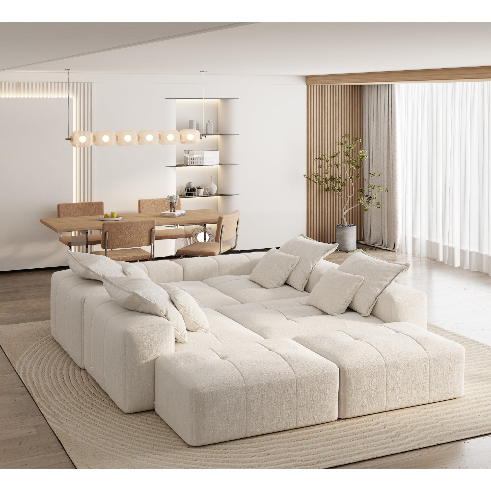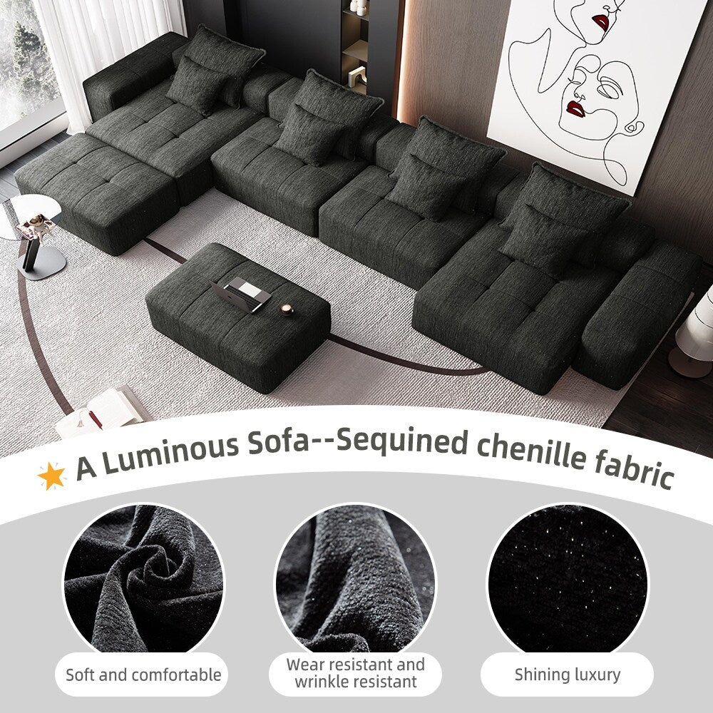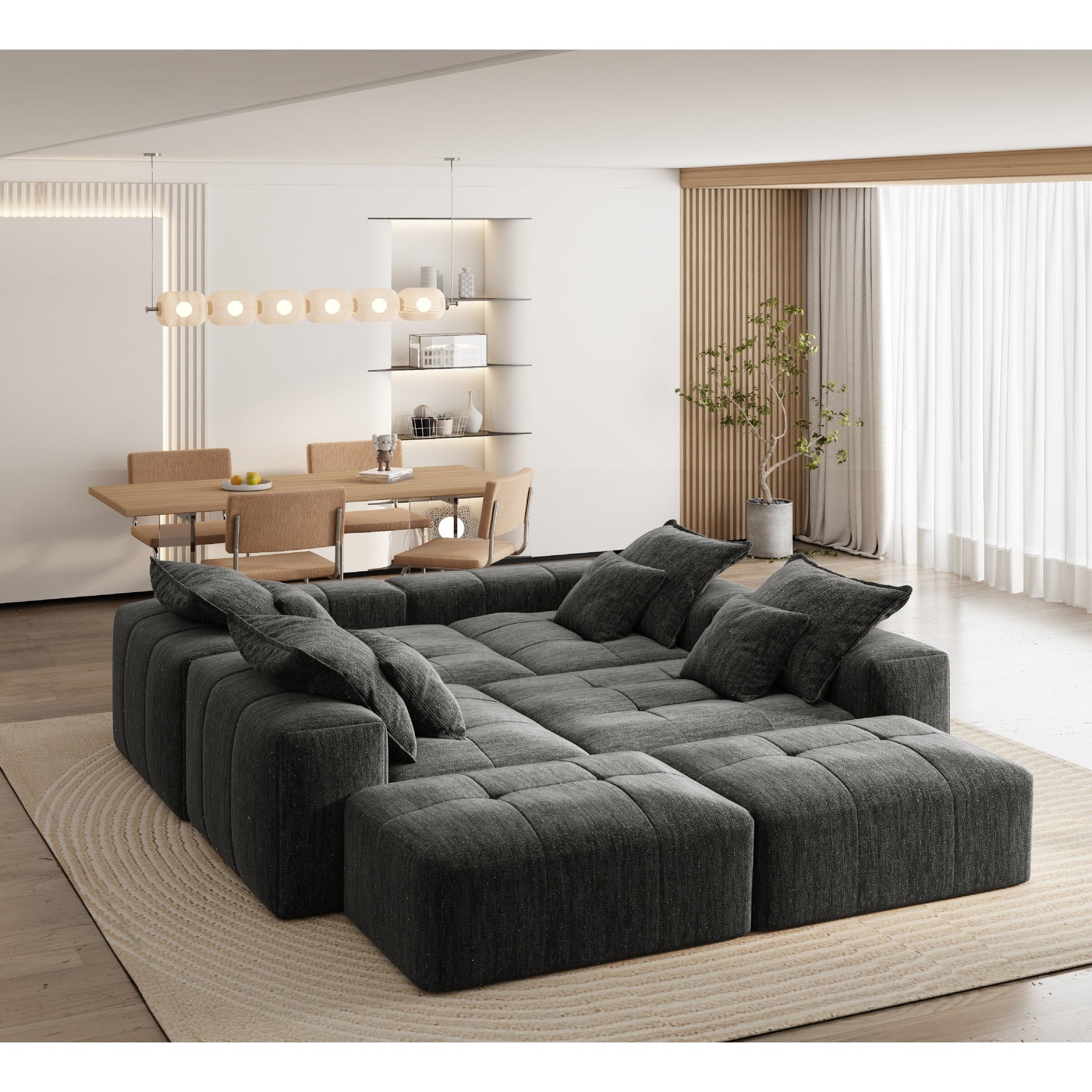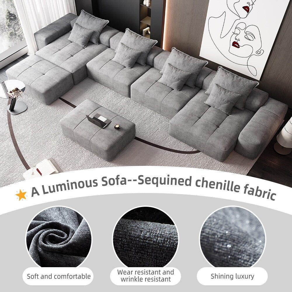 - Sublimez votre espace de vie avec ce canapé d'angle modulaire surdimensionné, conçu pour allier flexibilité et confort. Doté d'un tissu chenille chatoyant, de coussins matelassés et de huit oreillers inclus, il offre de multiples configurations pour s'adapter à votre pièce. Aucun assemblage requis : il suffit de le déballer et d'apprécier son charme moderne et douillet.
