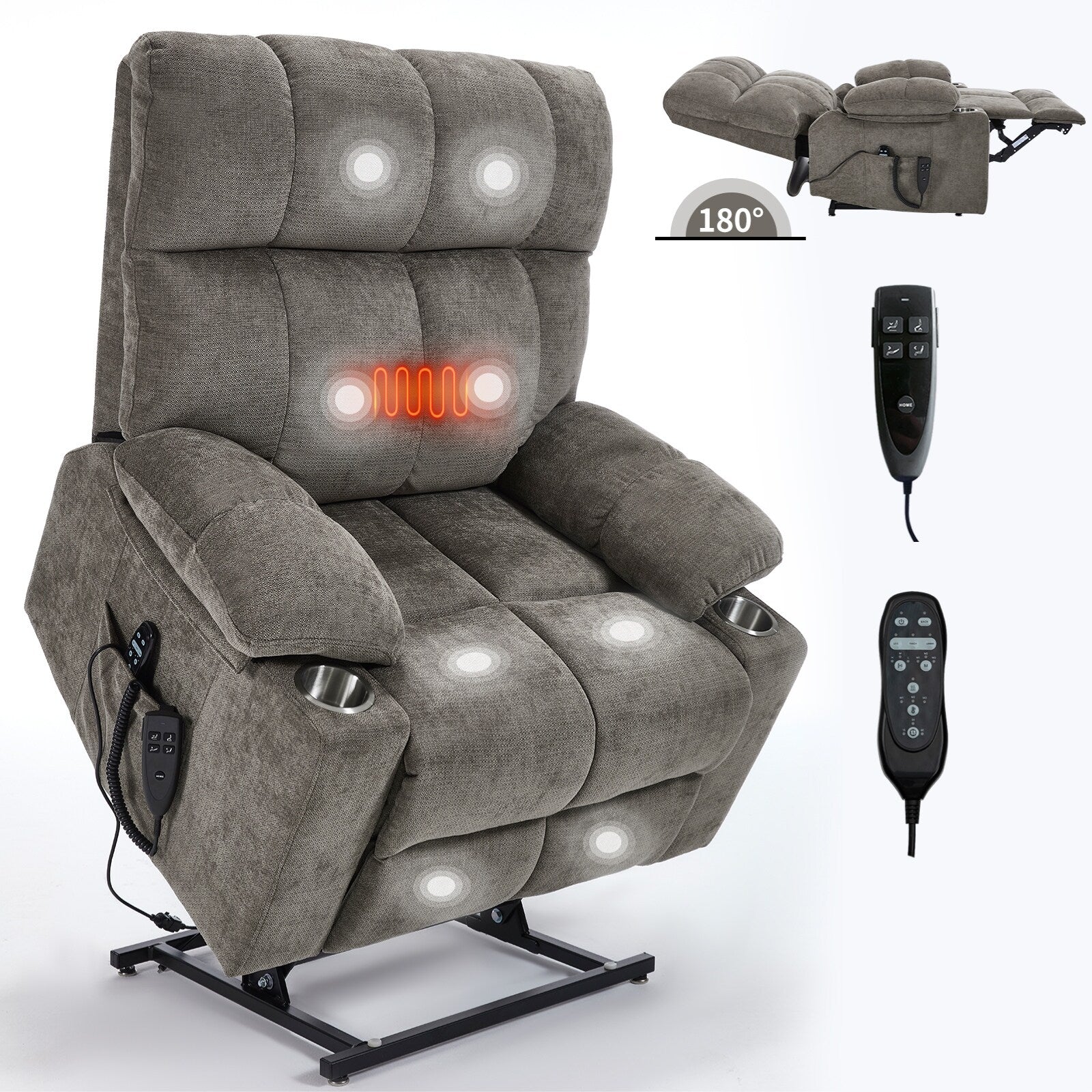 Fauteuil inclinable électrique surdimensionné avec double moteur, massage et chauffage lombaire, revêtement en chenille, deux porte-gobelets et poches latérales