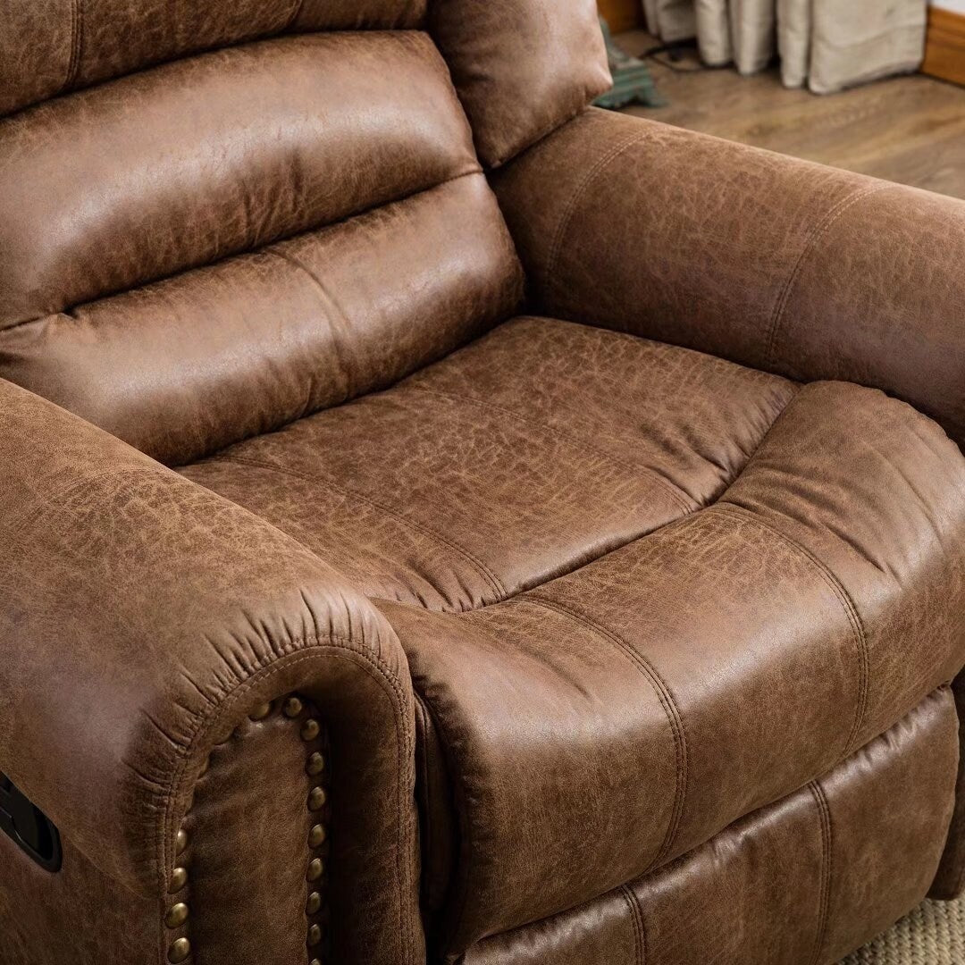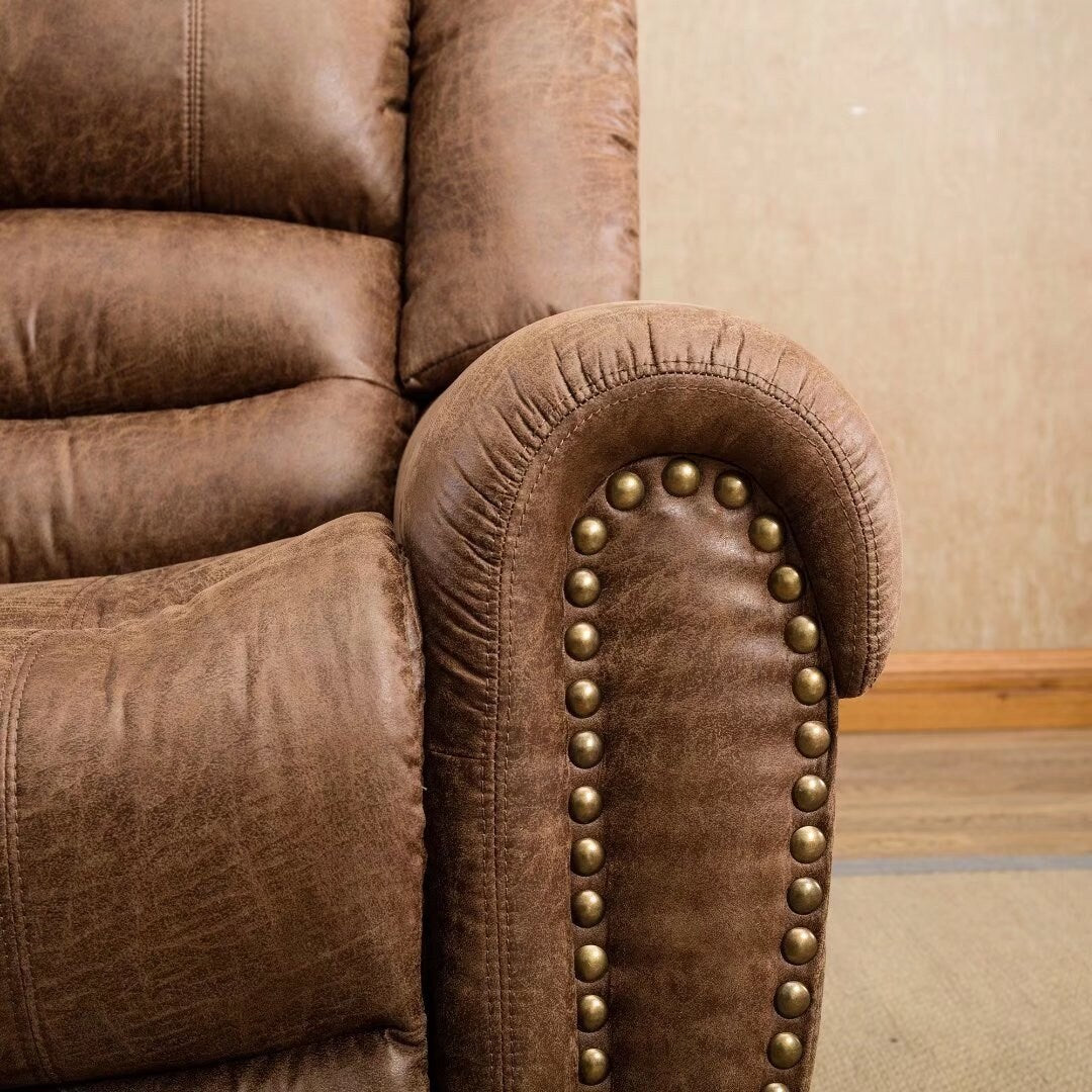 Offrez-vous le luxe du canapé inclinable standard manuel rembourré Ebello. Fabriqué en tissu microfibre haut de gamme et similicuir avec des rivets vintage, ce fauteuil inclinable de style américain est doté d'une structure en bois robuste et d'une base en métal robuste pour un soutien stable. Enveloppez-vous dans les coussins moelleux et les oreillers rembourrés pour la tête et le dos, tandis que la mousse haute densité et le système de placage stratifié (LVL) offrent un confort ultime. Avec son utilisation facile par simple pression d'une touche et ses accoudoirs rembourrés, ce fauteuil inclinable est idéal pour les longs moments de détente.