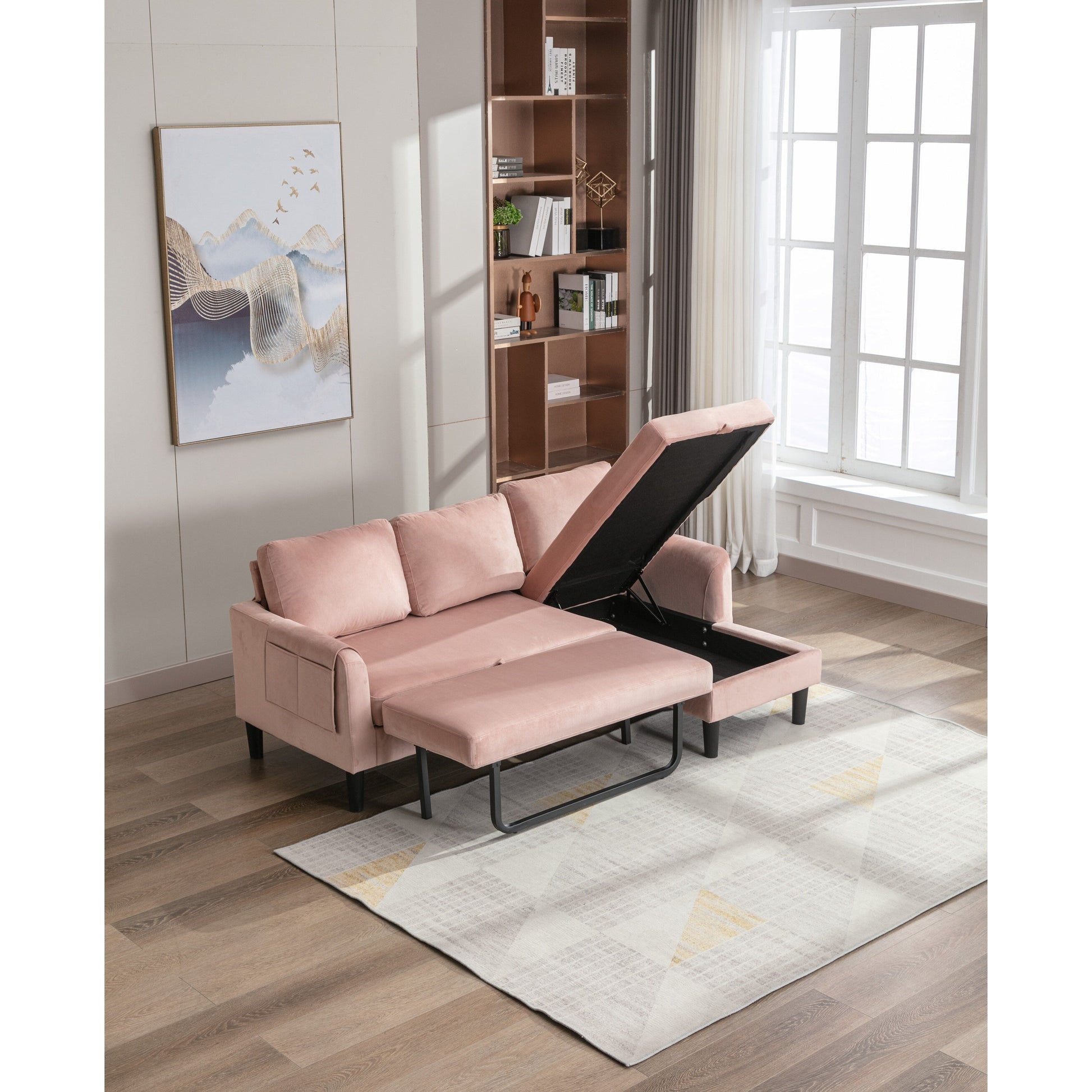 Canapé sectionnel 3 places en polyester rose de 72,4 pouces avec méridienne de rangement, lit gigogne et coussins décoratifs