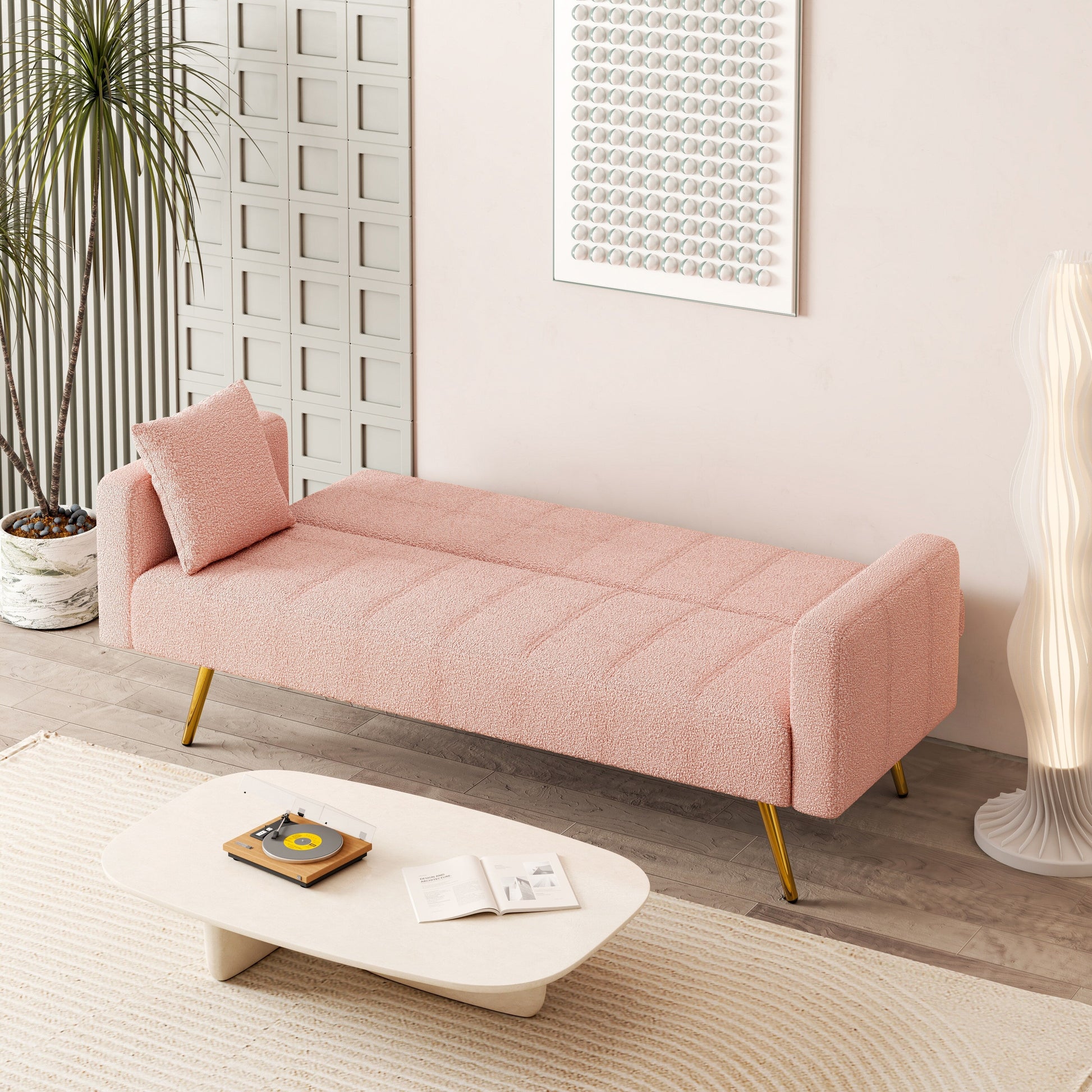 Canapé-lit pliant multifonctionnel rose avec pieds en métal et oreiller
