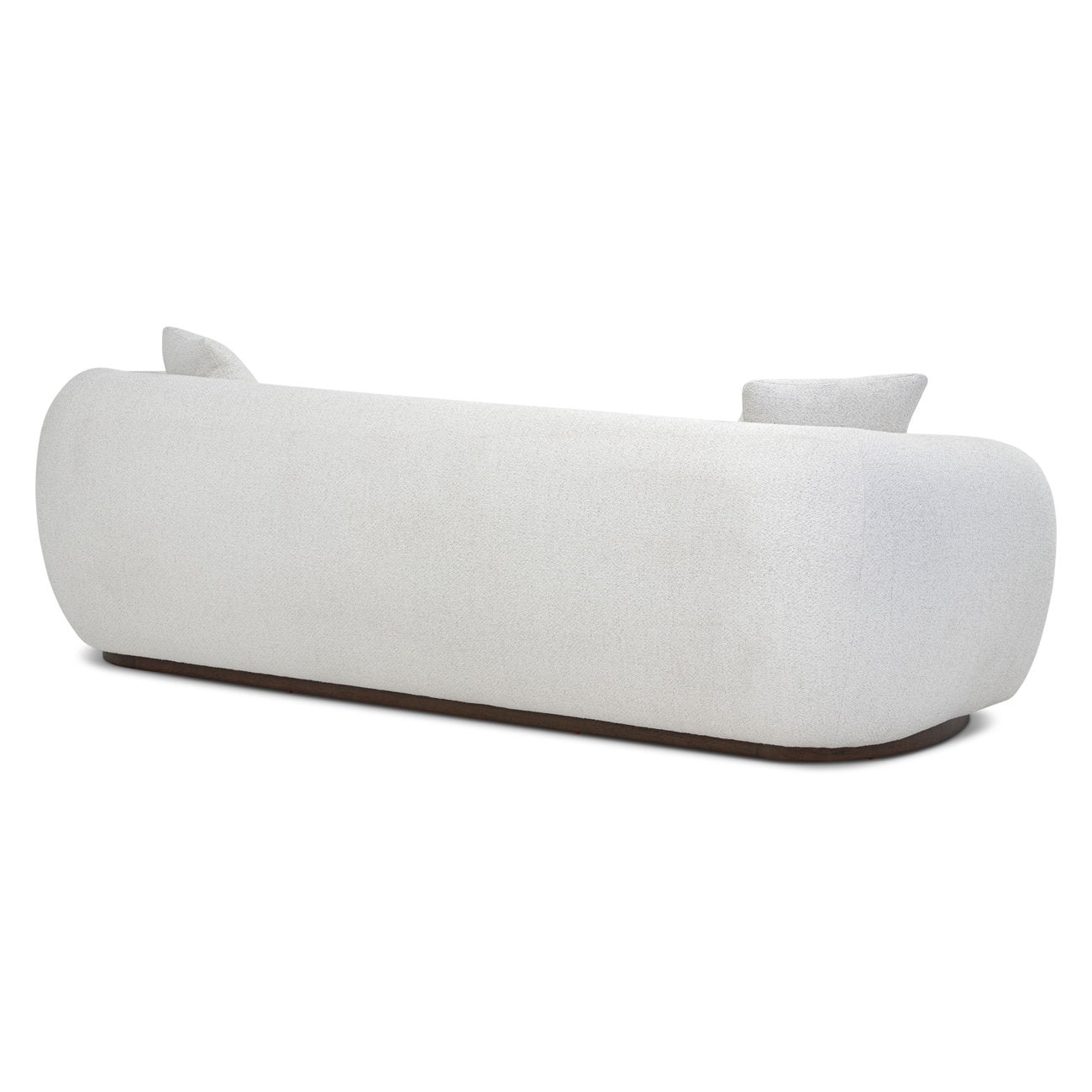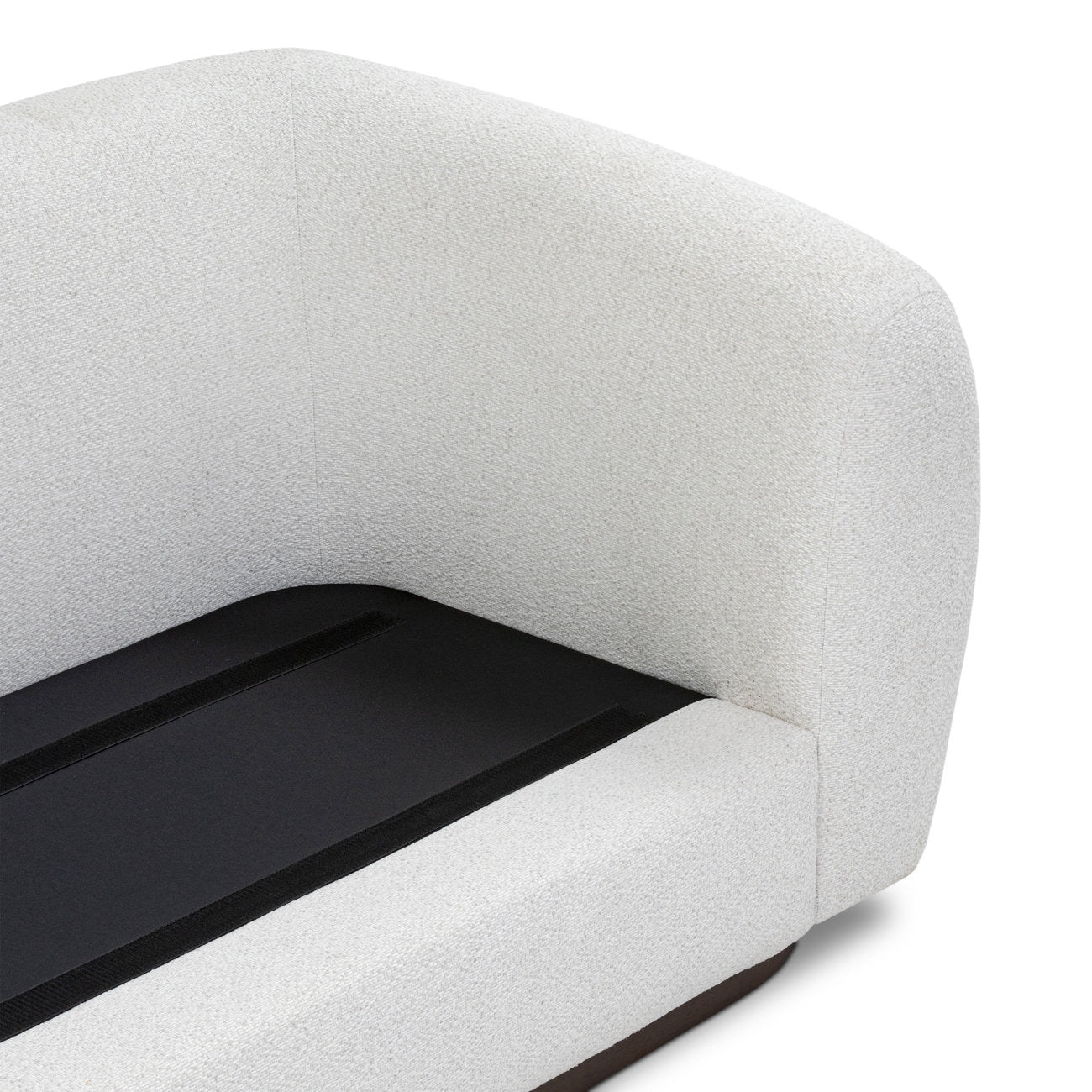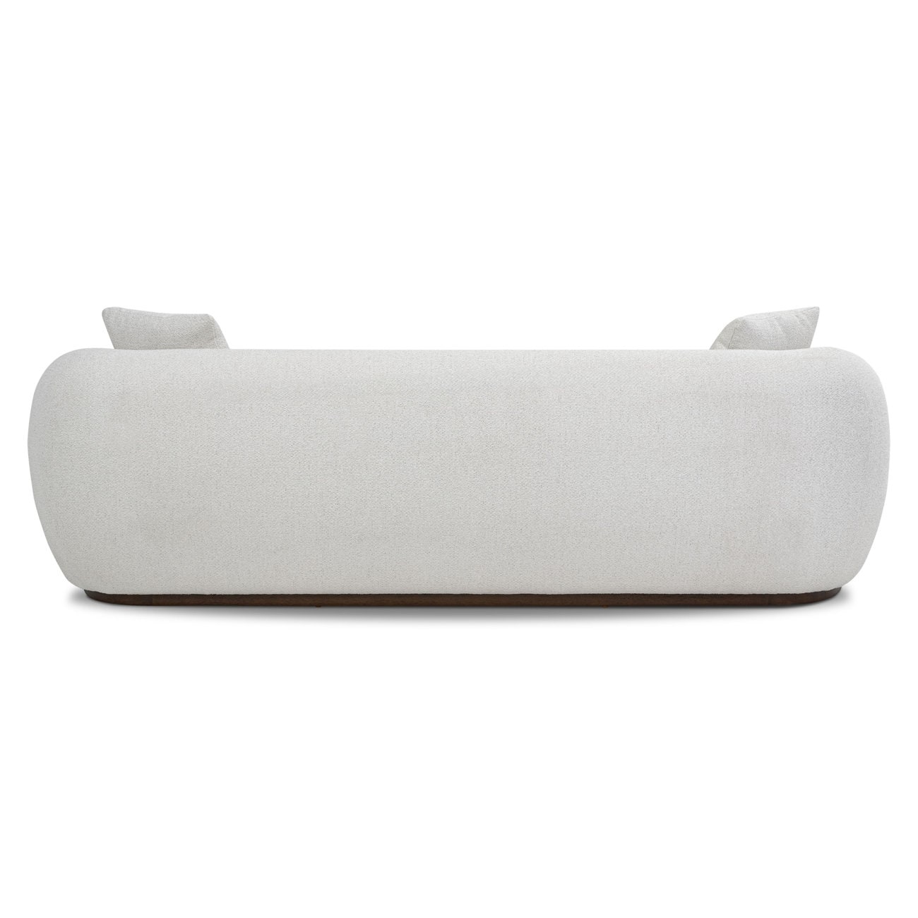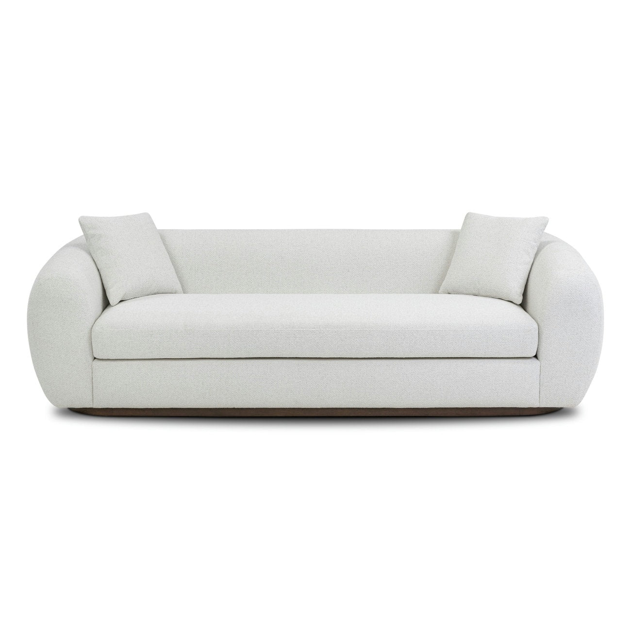 Laissez-vous séduire par ce canapé tout en courbes, drapé d'un tissu performant et anti-éclaboussures qui s'amuse avec malice du café, du vin et des pitreries des animaux. Son cadre séché au four, aux coins renforcés, et ses ressorts sinueux allient l'élégance vénitienne à la prestance italienne des sangles Pirelli. Le coussin de la banquette est conçu pour le confort, tandis que les coussins décoratifs en plumes invitent à la détente. Le piètement en noyer, aussi élégant qu'une proue de gondole, vous invite à plonger dans ce chef-d'œuvre de confort chic.