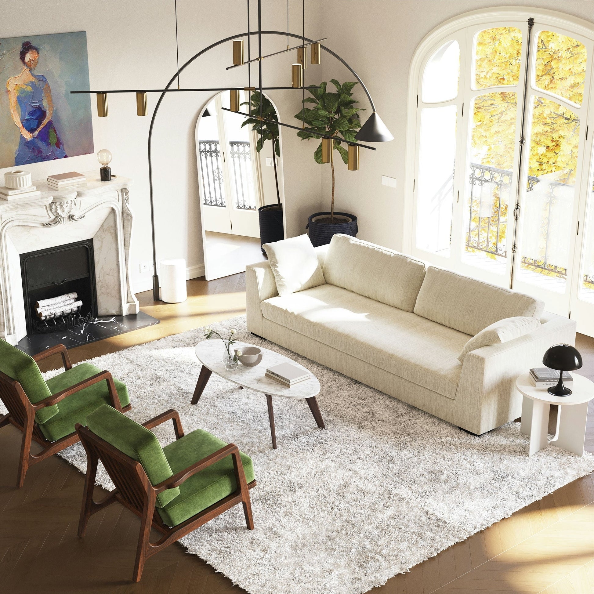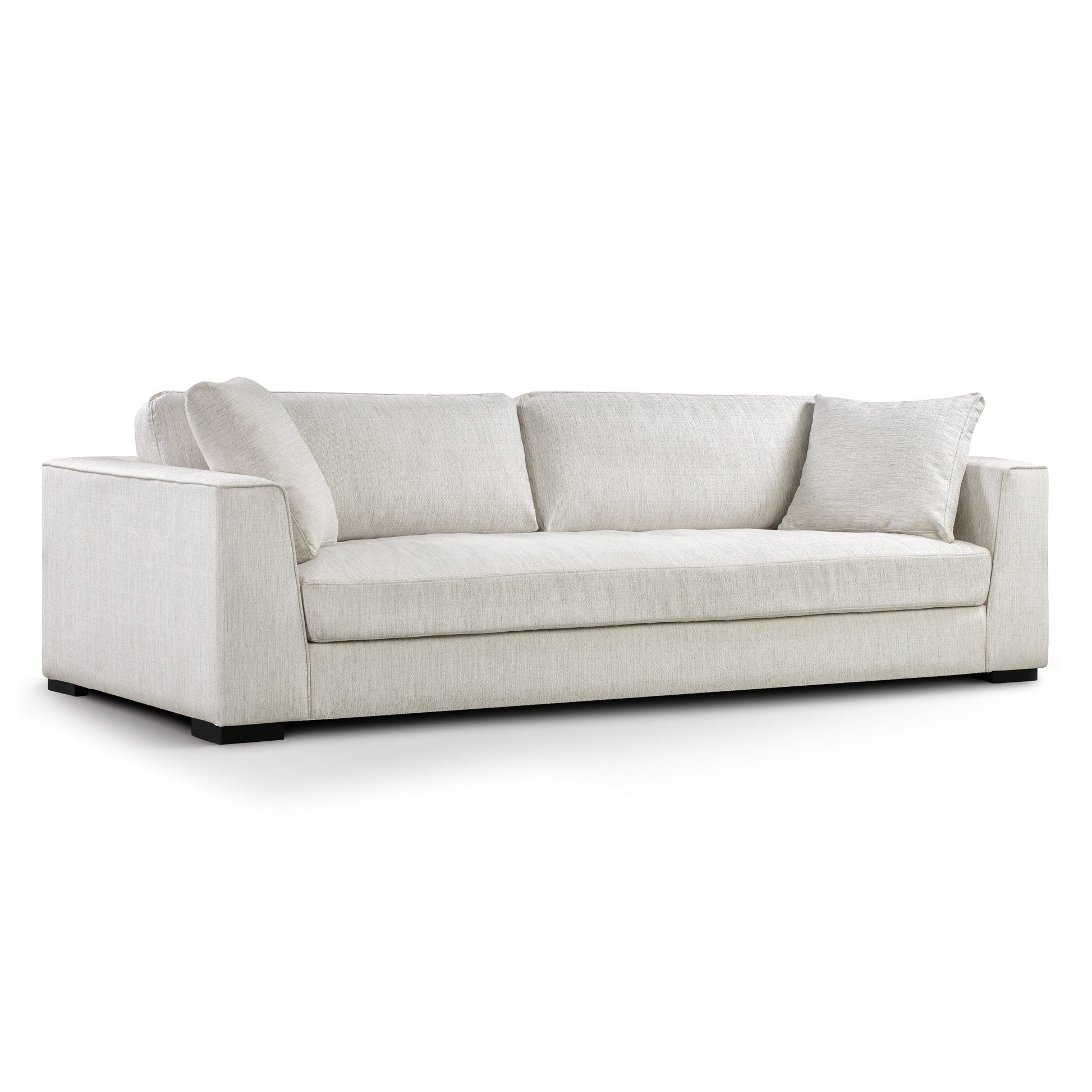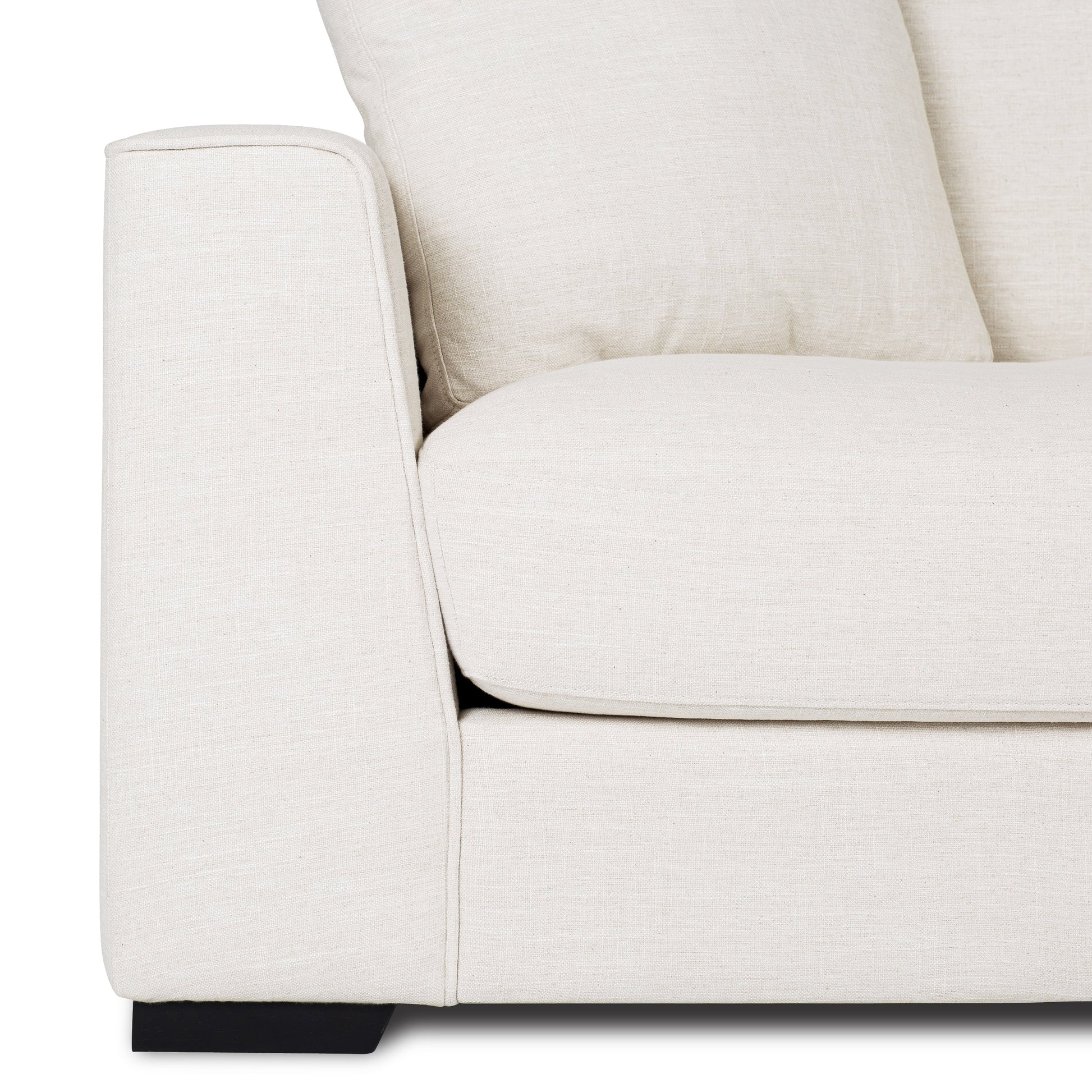 Plongez dans un confort luxueux avec le canapé Capri en tissu neutre, rembourré de polyester et d'écorce. Ce canapé allie à la perfection détente et raffinement, grâce à ses coussins en plumes et fibres pour une douceur exceptionnelle. Sa structure en bois massif aux angles renforcés et ses sangles en caoutchouc résistant offrent un soutien optimal, tandis que ses pieds discrets soulignent sa silhouette élégante. Revêtu d'un tissu polyester résistant, il est disponible en tissus haute performance Frêne brillant ou Blanc bouleau. Livré avec deux coussins 100 % duvet.