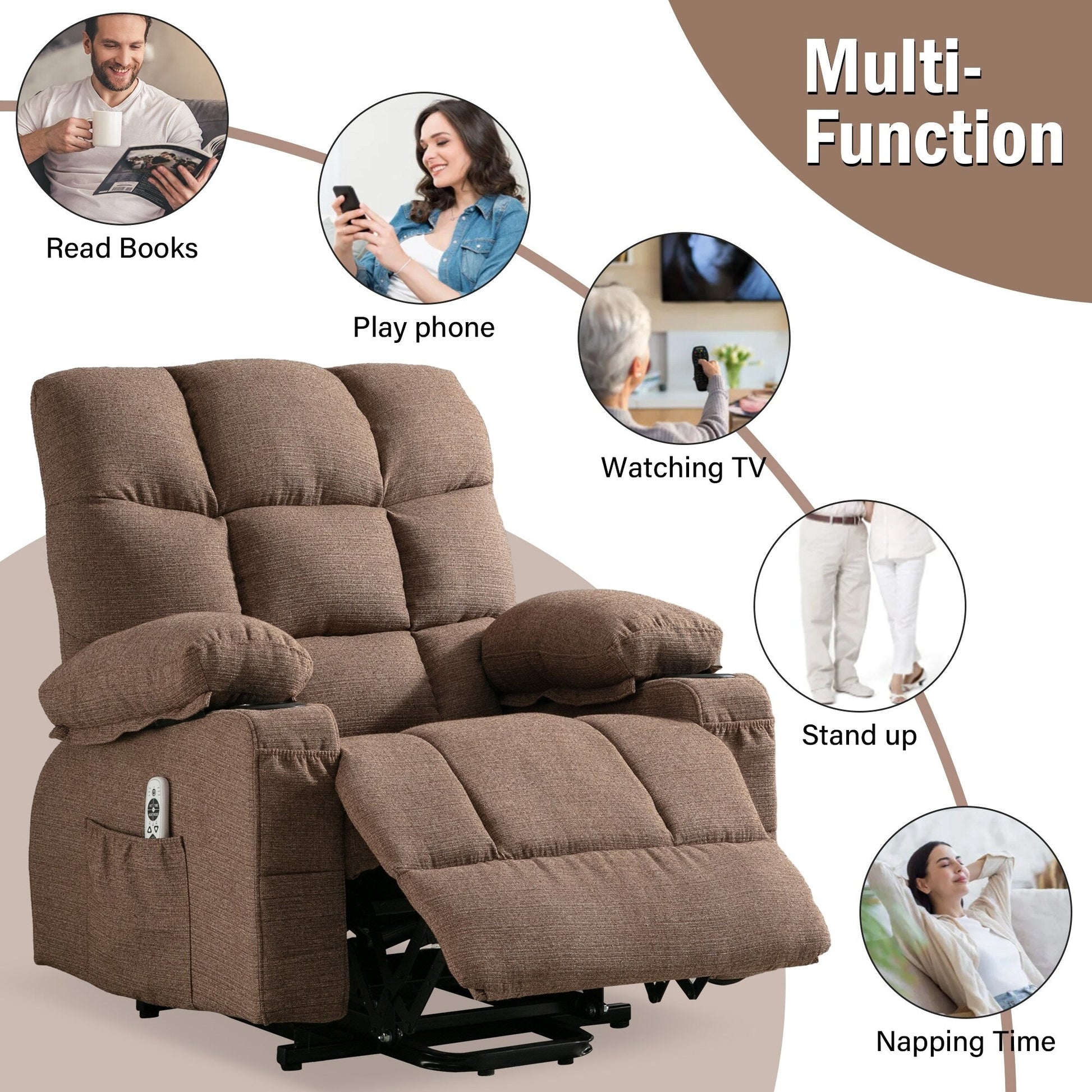 Grand fauteuil releveur électrique avec massage pour personnes âgées, chauffage de la taille et massage en huit points. Ce fauteuil est équipé de huit points de vibration et de deux points de chauffage de la taille. Le réglage de l'intensité et de la vitesse du massage, ainsi que la sélection des points de vibration, détendent les muscles du dos et des jambes fatigués. Le réglage est également programmable. La commande à distance du relevage, de la fonction massage et du levage en un clic est pratique pour les personnes âgées. Le port USB situé à l'avant de la télécommande est utilisable à tout moment, ce qui est très pratique. Le tissu est délicat et doux, tout en étant très résistant. Il peut être incliné de 90° à 150°, avec la pédale et le dossier s'ouvrant et se rétractant simultanément. De plus, ce fauteuil pour personnes âgées peut supporter environ 159 kg. Ce fauteuil est livré en deux colis et peut ne pas arriver simultanément.