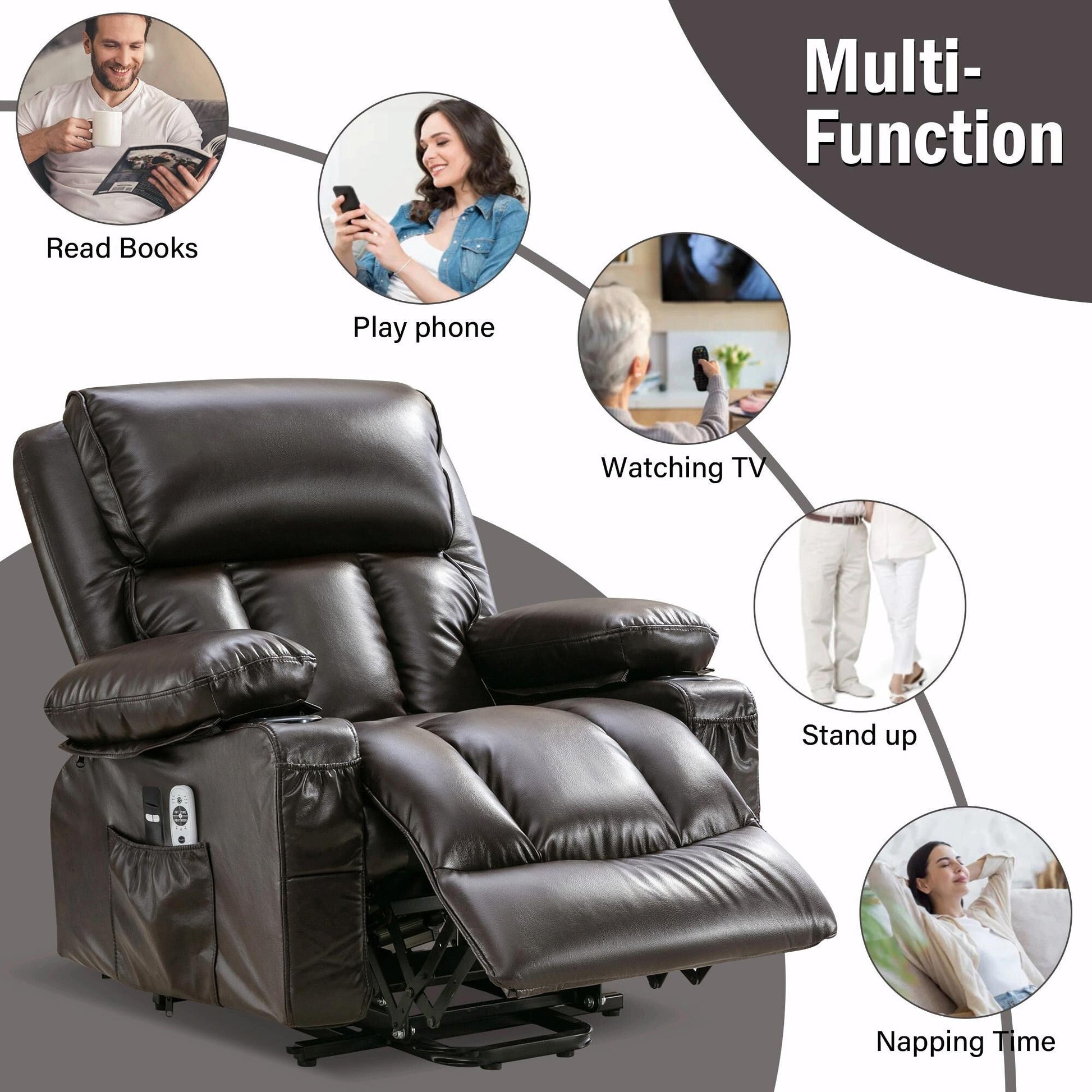 - Conception pratique : Le fauteuil est équipé d'un port USB intégré à la télécommande, permettant de recharger des appareils tels que des téléphones en position assise ou allongée. Des poches latérales permettent de ranger des télécommandes ou des magazines, et les doubles poches avant sont idéales pour ranger de petits objets comme des téléphones. Son design est pratique au quotidien, même si les ports USB sont destinés aux appareils peu gourmands en énergie comme les iPhones et les iPads.