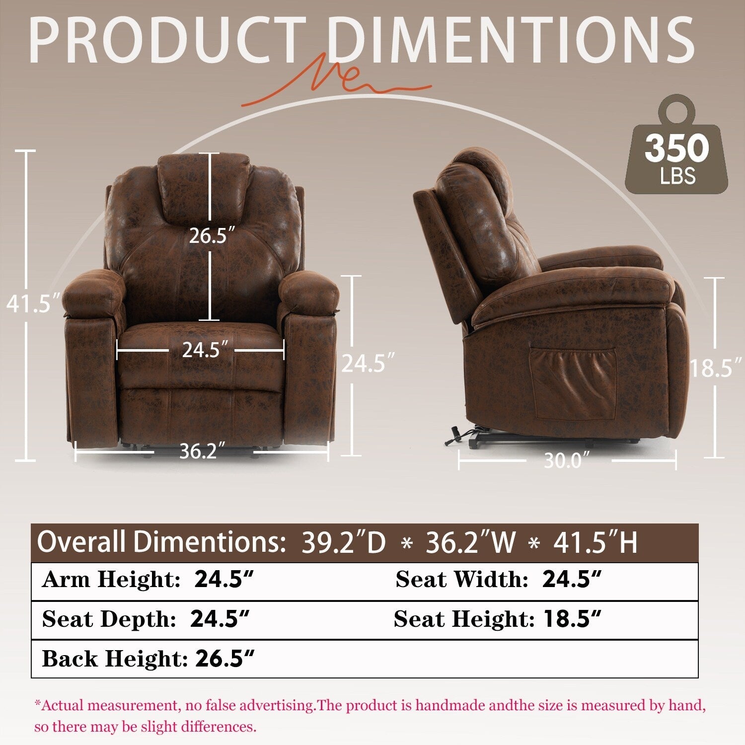 - Ce fauteuil inclinable électrique est doté d'un mécanisme de levage électrique fluide et silencieux, permettant un réglage sans effort de la position souhaitée. Il intègre une fonction massage pour plus de confort et de détente. Son design surdimensionné en fait un choix idéal pour les personnes corpulentes, offrant un espace de détente généreux. Facile à assembler et robuste, ce fauteuil inclinable allie confort et fonctionnalité dans votre salon ou votre chambre.