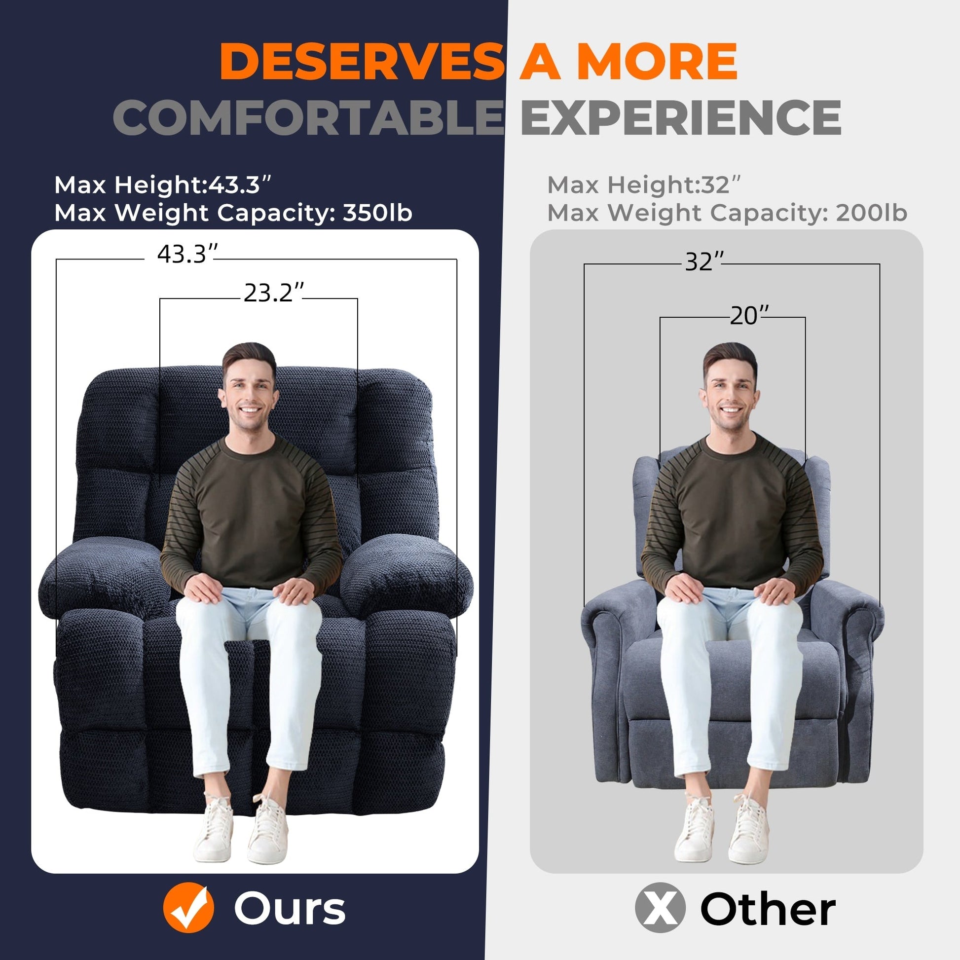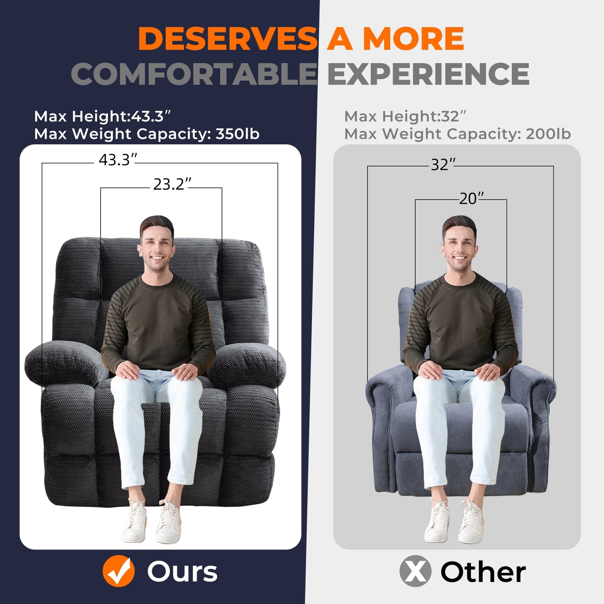 〠Dimensions pour espaces variésã€'Avec des dimensions globales de 43*39*43 pouces, une largeur d'assise de 23,23 pouces, une profondeur d'assise de 23,62 pouces et une hauteur d'assise de 19,68 pouces, ce fauteuil inclinable est conçu pour s'adapter à une large gamme de types de corps, y compris les personnes de grande taille et de grande taille.