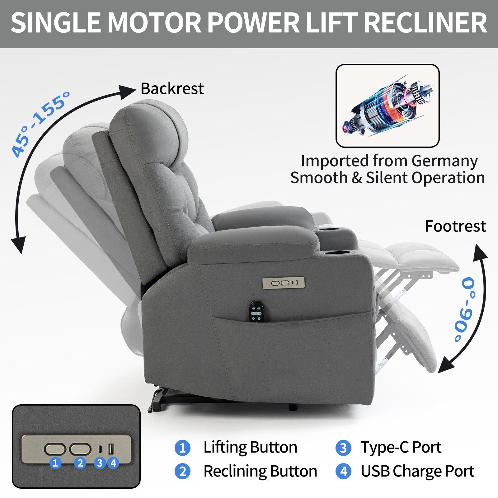 - Fauteuil releveur électrique : Appuyez sur le bouton latéral pour contrôler la montée ou la descente du fauteuil. Vous pouvez ainsi obtenir la position souhaitée, de 110 à 155 degrés, ou même le lever. Le fauteuil releveur est actionné par un moteur électrique qui le soulève entièrement, fonctionnant en douceur et en silence pour aider les personnes âgées à se lever facilement. Il est également idéal pour les personnes souffrant de problèmes d'équilibre aux jambes ou au dos, ou ayant subi une intervention chirurgicale.