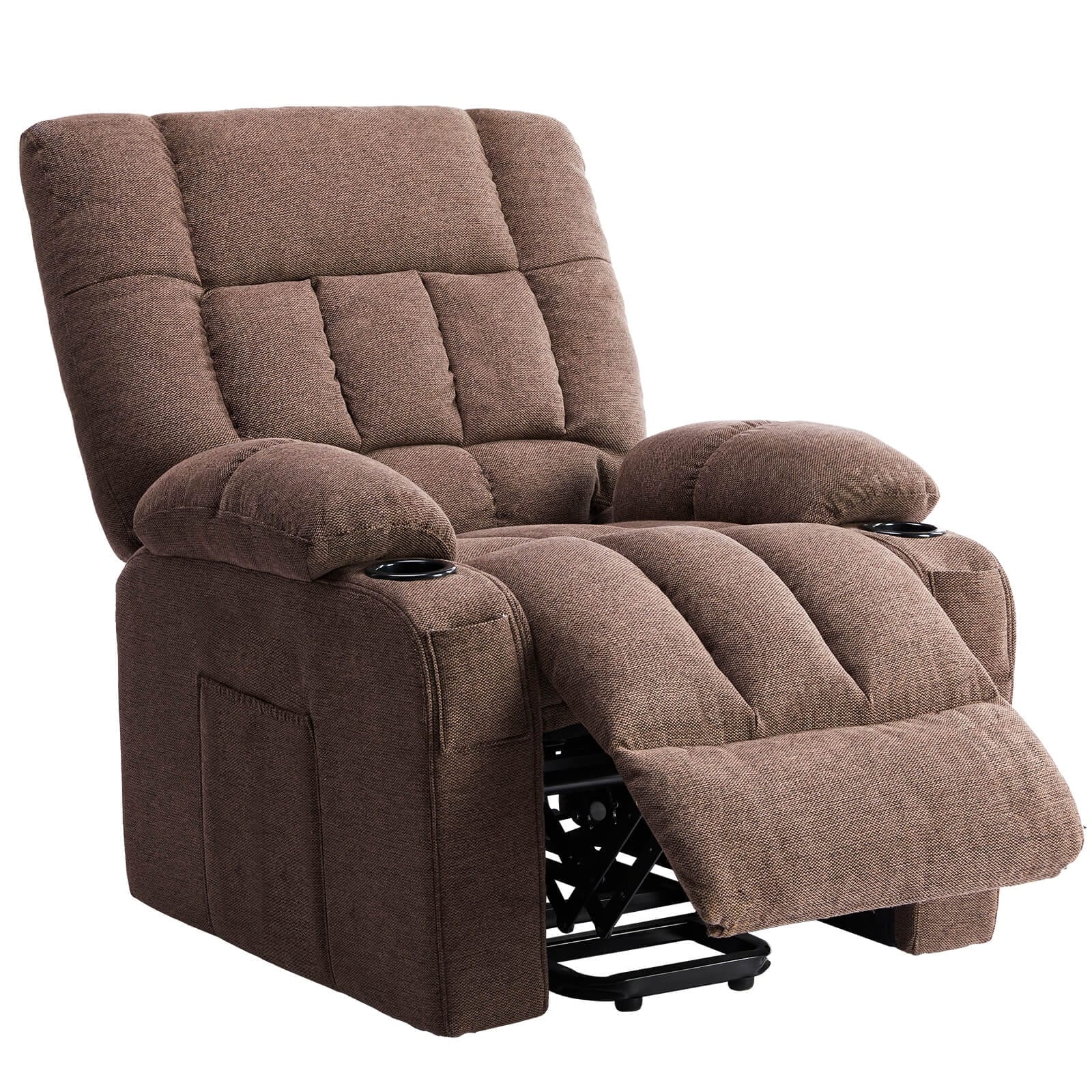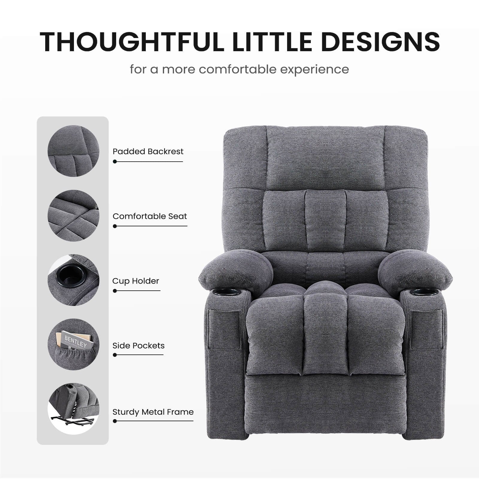 - Conçu pour être pratique, ce fauteuil inclinable offre un grand espace de rangement pour vos essentiels. Grâce à une grande poche latérale, deux petites poches sur les accoudoirs et deux porte-gobelets, vous aurez tout à portée de main pour vous détendre. Idéal pour ranger télécommandes, en-cas ou boisson, ce fauteuil inclinable vous permet de garder votre espace organisé et rangé.