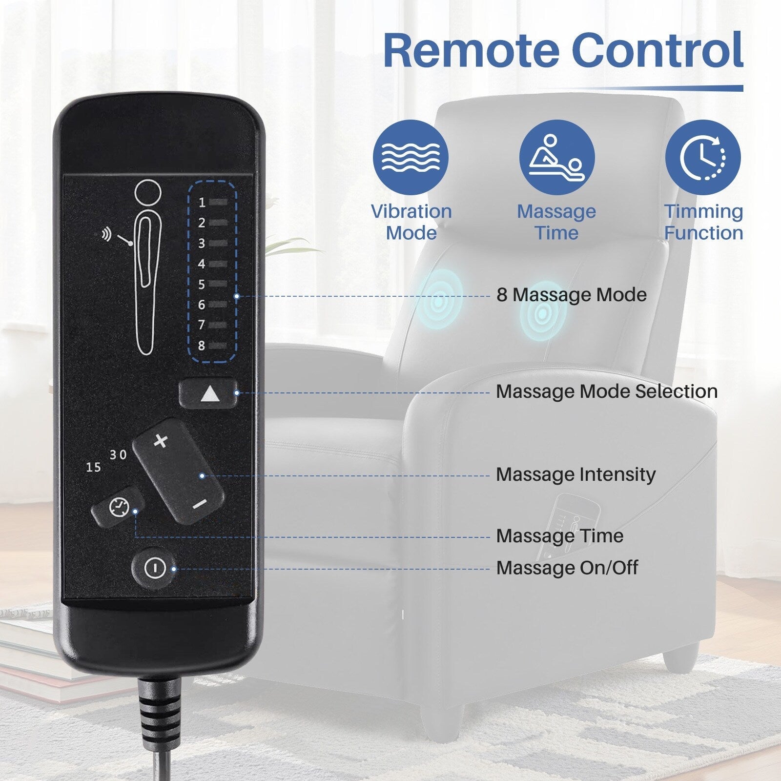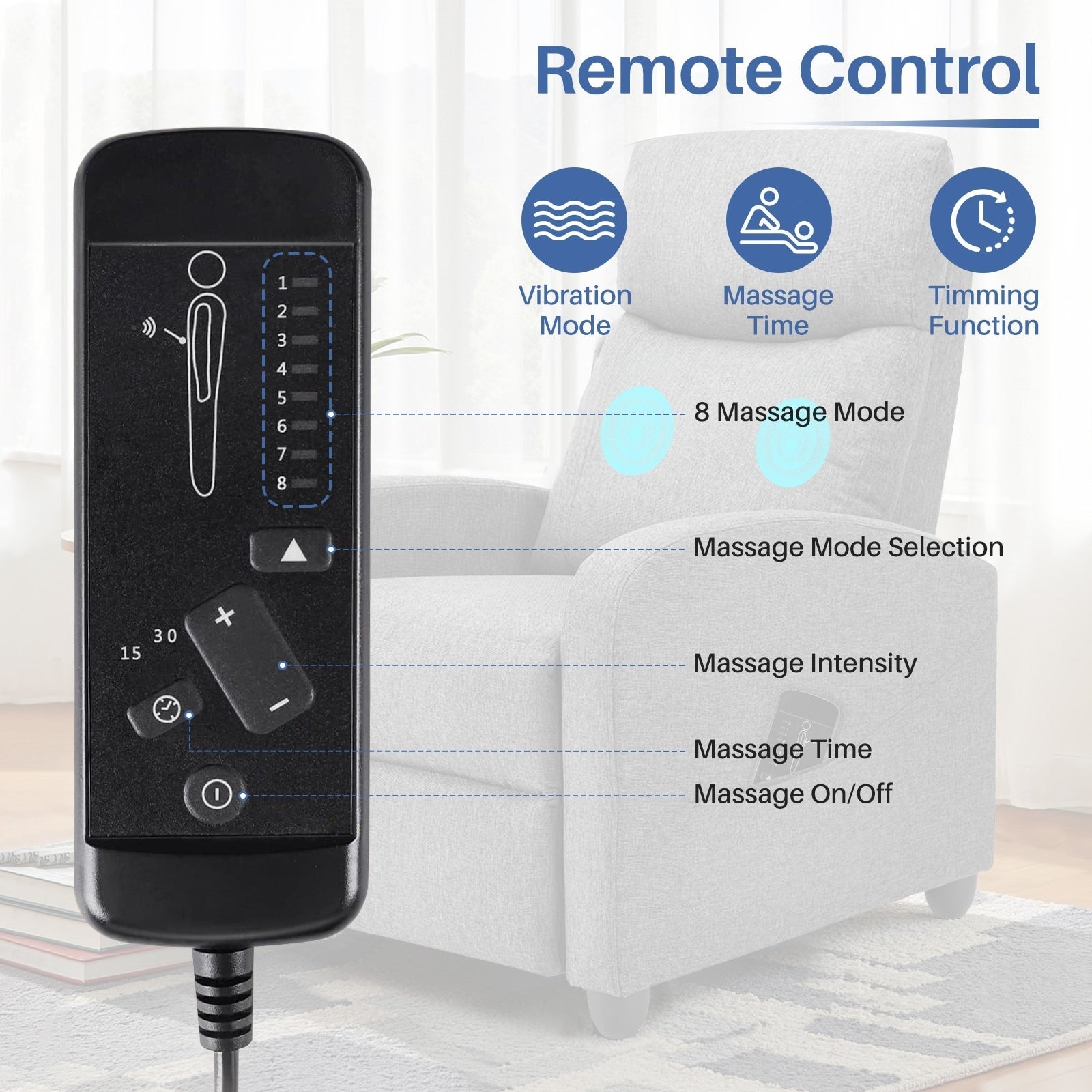 - Fonction massage de base : notre fauteuil inclinable moderne est équipé de fonctions de massage complètes pour une détente ultime. Il propose 8 modes de massage différents, 2 options de vibration et une intensité personnalisable. La zone de massage lombaire dédiée offre un confort optimal et se contrôle facilement grâce à la télécommande, vous permettant de profiter de 15 minutes de détente idéale. C'est le choix idéal pour regarder la télévision, lire ou simplement écouter de la musique apaisante.