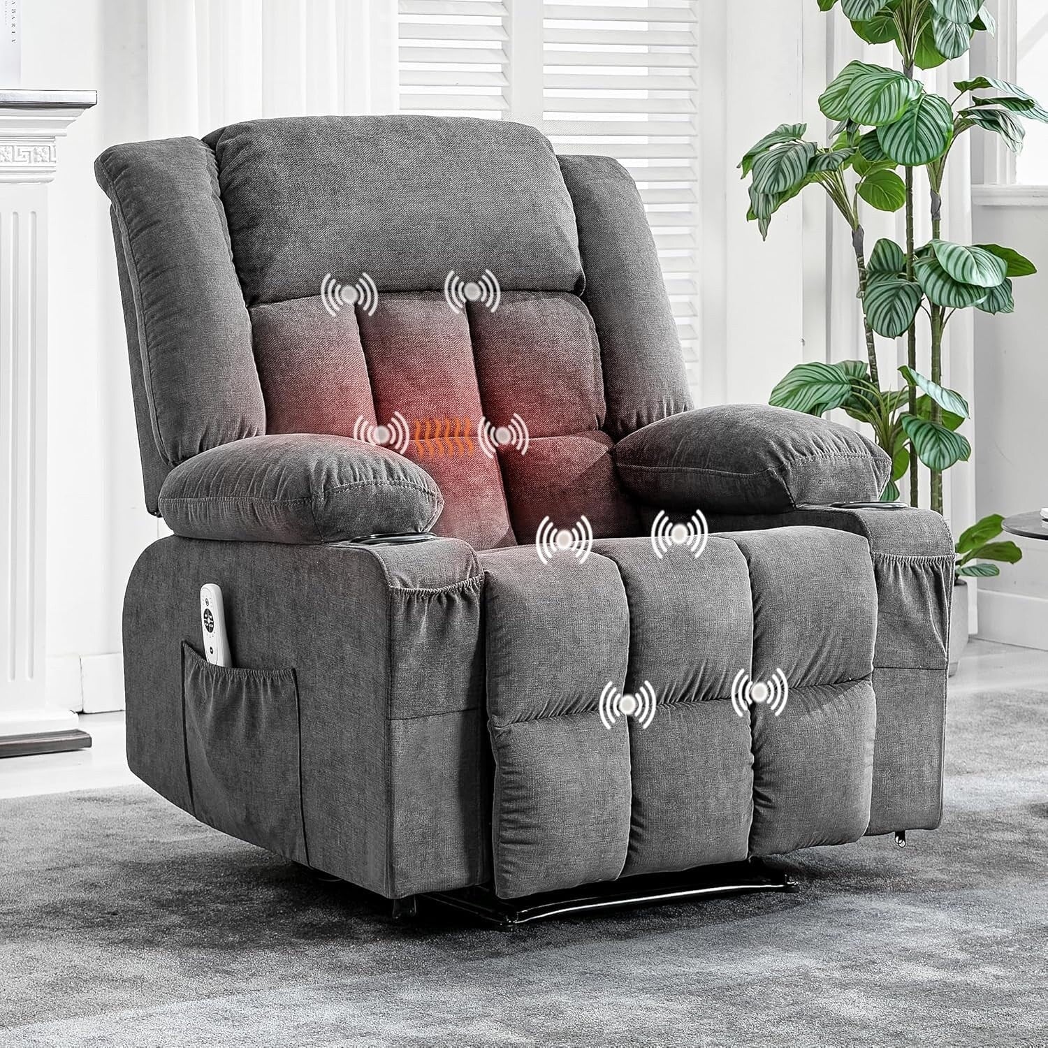 Soutien haut de gamme et design spacieux : conçu pour les fauteuils inclinables pour hommes de grande taille, ce fauteuil inclinable large est doté d'une base en fer robuste, d'une structure en bois robuste, de coussins en mousse haute densité et d'un soutien lombaire ergonomique pour soutenir votre colonne vertébrale. Le revêtement en tissu respirant et résistant à l'abrasion s'adapte à toutes les morphologies. Massage apaisant et confort thermique : ce fauteuil inclinable électrique est doté de 8 nœuds de massage par vibrations ciblées et de niveaux d'intensité réglables. Personnalisez vos séances pour cibler les mollets, les cuisses, les lombaires ou les épaules, tandis que la thérapie thermique intégrée réchauffe le bas du dos pour dissiper les tensions et stimuler la circulation. Inclinaison et balancement sans effort : découvrez la polyvalence d'un fauteuil inclinable à bascule avec une inclinaison douce à 150 degrés et un arc de balancement à 30 degrés. Le mécanisme à poignée vous permet de passer sans effort d'une position verticale à une position allongée, tandis que le balancement doux imite le mouvement apaisant d'un fauteuil à bascule ; aucun mécanisme de levage encombrant n'est requis. Design pratique : restez organisé grâce aux deux poches latérales et aux porte-gobelets pour télécommandes, magazines ou collations, ainsi qu'aux poches avant supplémentaires pour un accès facile aux objets fréquemment utilisés. Le design épuré du fauteuil inclinable à bascule s'intègre parfaitement dans les salons, les home cinémas ou les bureaux. Montage et utilisation faciles : grâce à sa structure unique et à son câblage, le montage du fauteuil est simple et sans outils (environ 20 minutes pour un débutant).